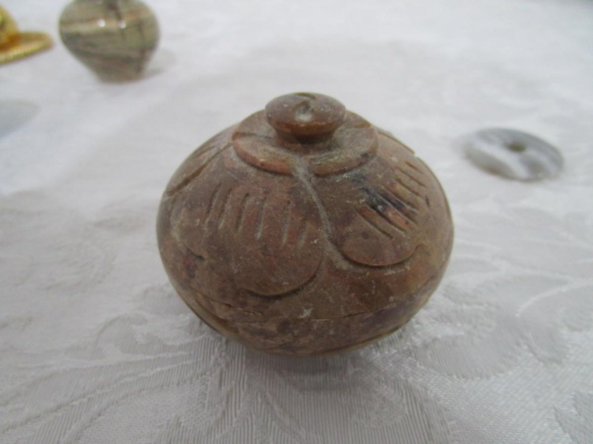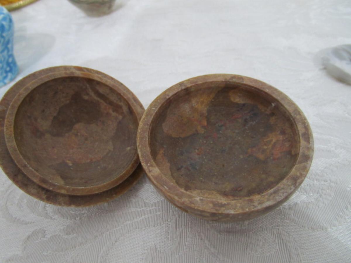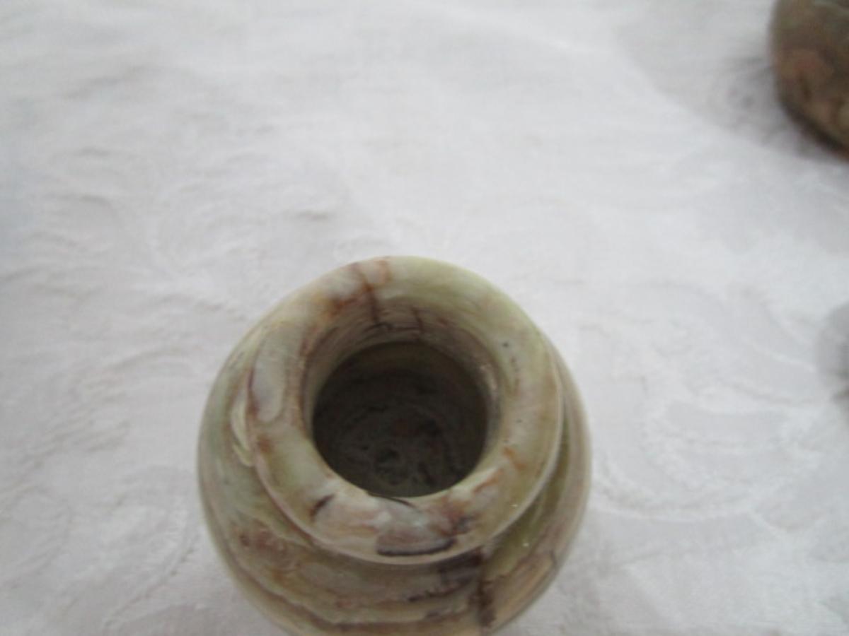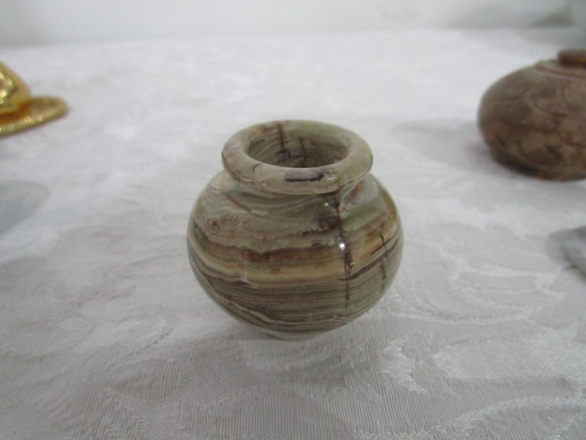 2 ceramic pin cushion holders, 1 small vase, 1 swan ring holder, 1 stone trinket box, polished rock disc