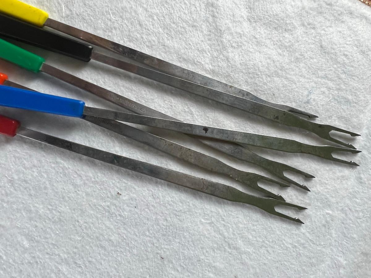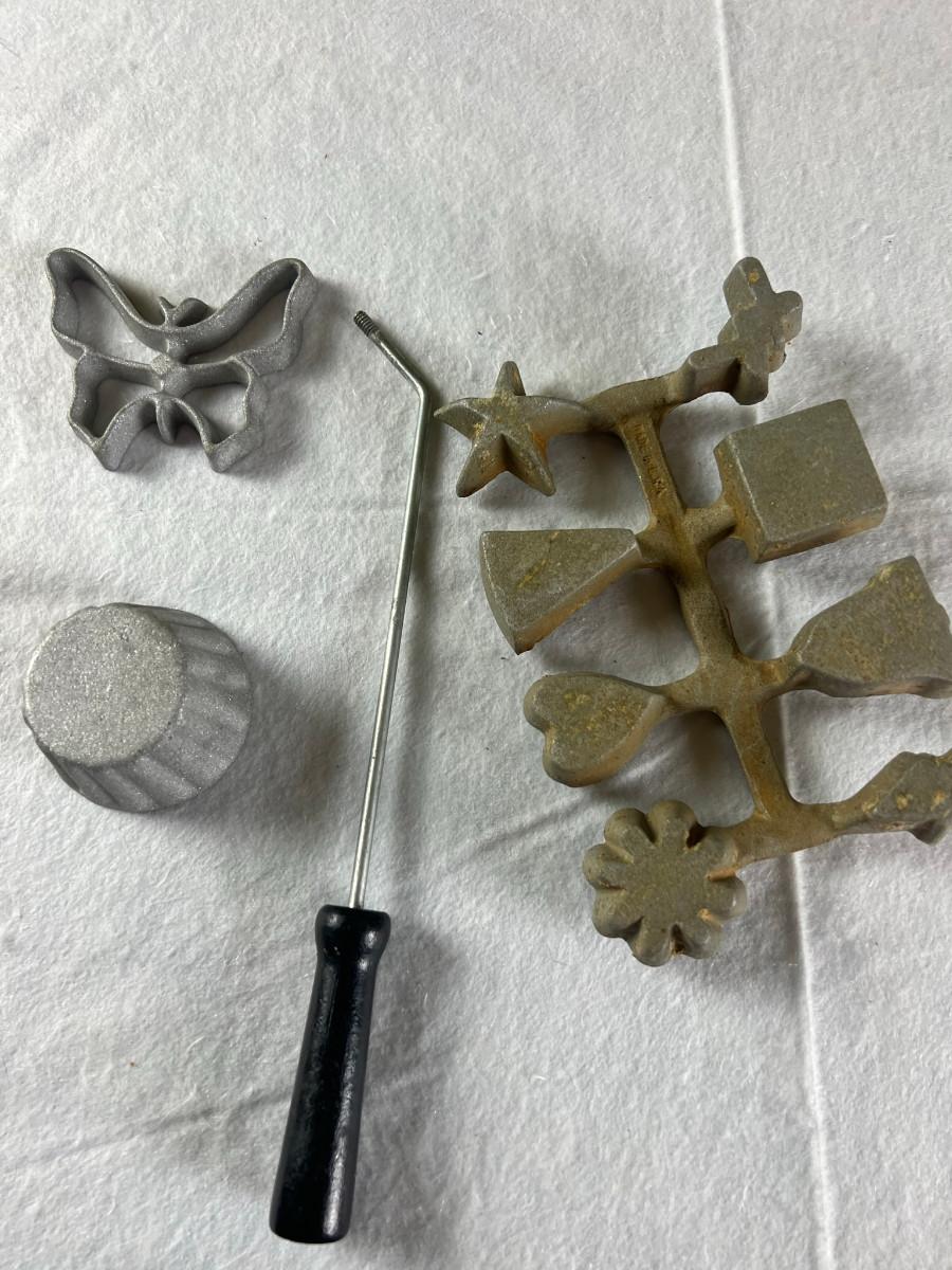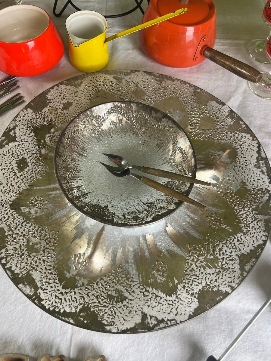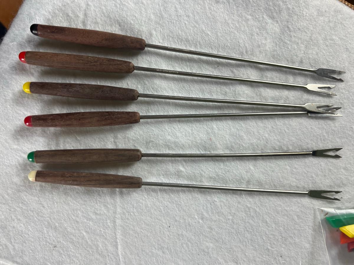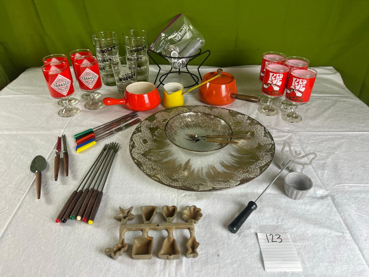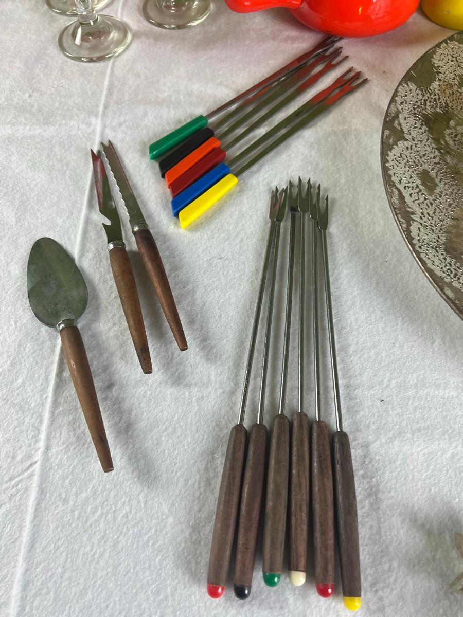 Dip platter with bowl 3" x 16", cookie and decorating tools, rosette irons, bag of hors d'oeuvre sticks, yellow metal pouring cup 3" x 7.5" as is, 3 pcs stainless steel Japan utensils, 2 pc Japan Nevco, 6 x 10" fondue forks (some rusted), 6 x 8.5" fondue forks some rust, metal fondue pot with lid 5" x 6" x 10", ceramic fondue pot 3" x 4.5" x 7", block pot warmer 6.5" x 8", 8 tobasco cups and 4 Nugget casino cups