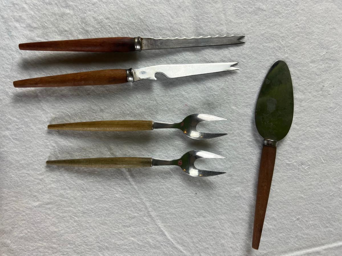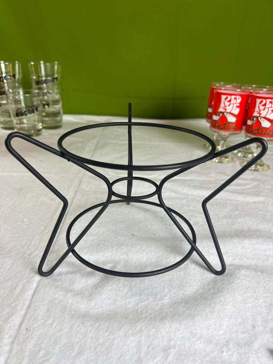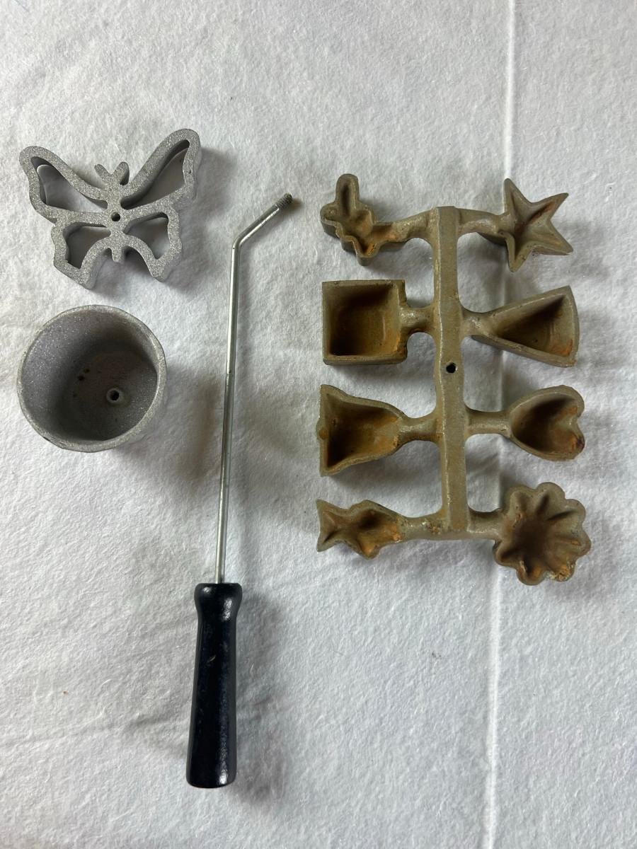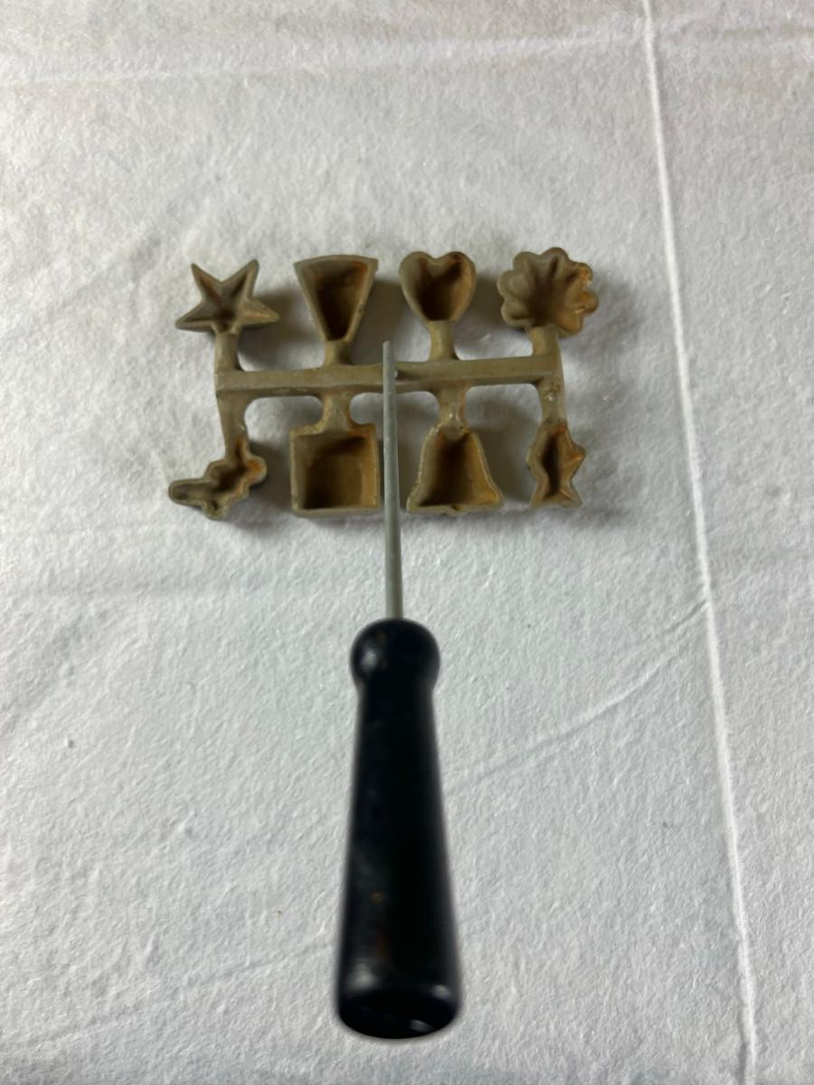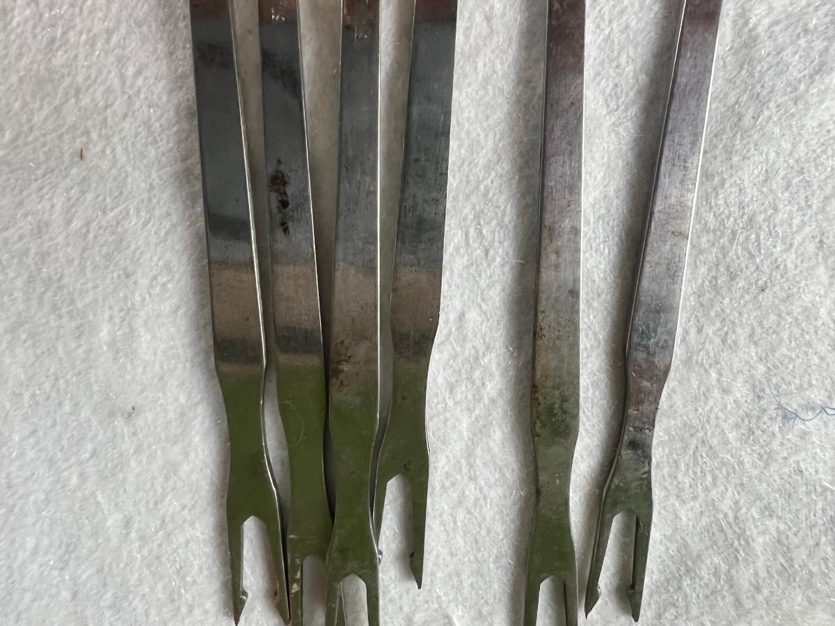 Dip platter with bowl 3" x 16", cookie and decorating tools, rosette irons, bag of hors d'oeuvre sticks, yellow metal pouring cup 3" x 7.5" as is, 3 pcs stainless steel Japan utensils, 2 pc Japan Nevco, 6 x 10" fondue forks (some rusted), 6 x 8.5" fondue forks some rust, metal fondue pot with lid 5" x 6" x 10", ceramic fondue pot 3" x 4.5" x 7", block pot warmer 6.5" x 8", 8 tobasco cups and 4 Nugget casino cups