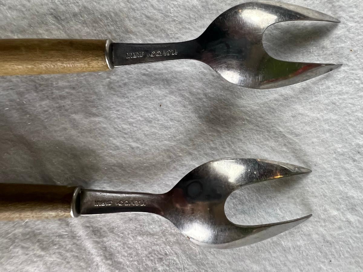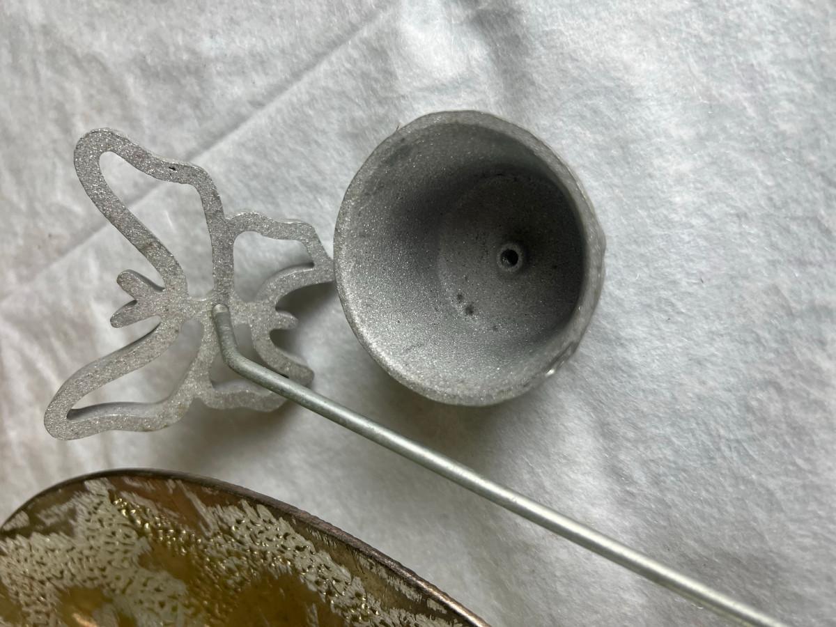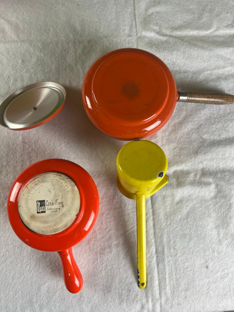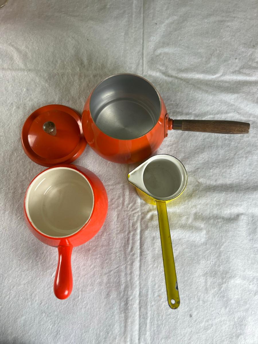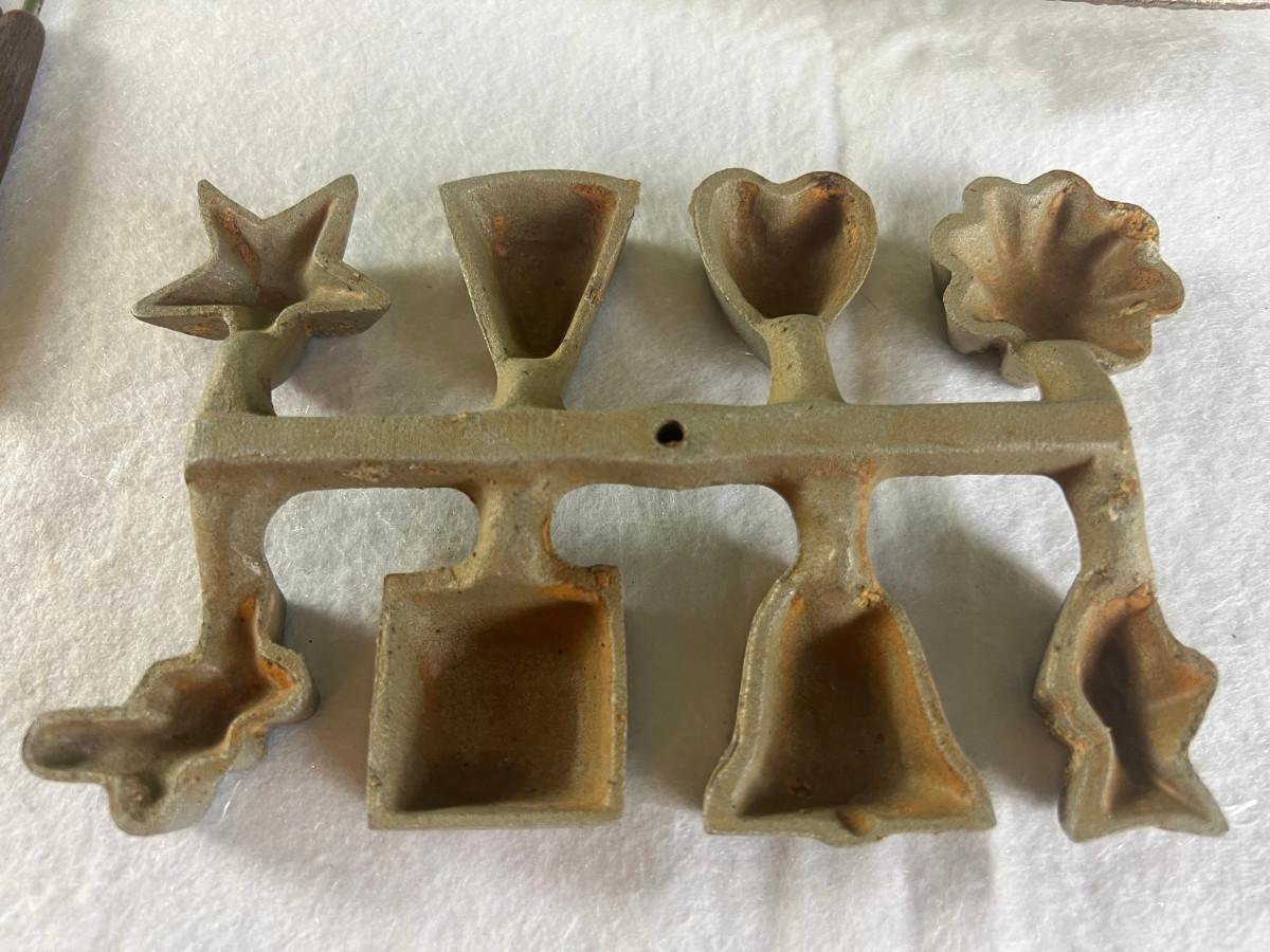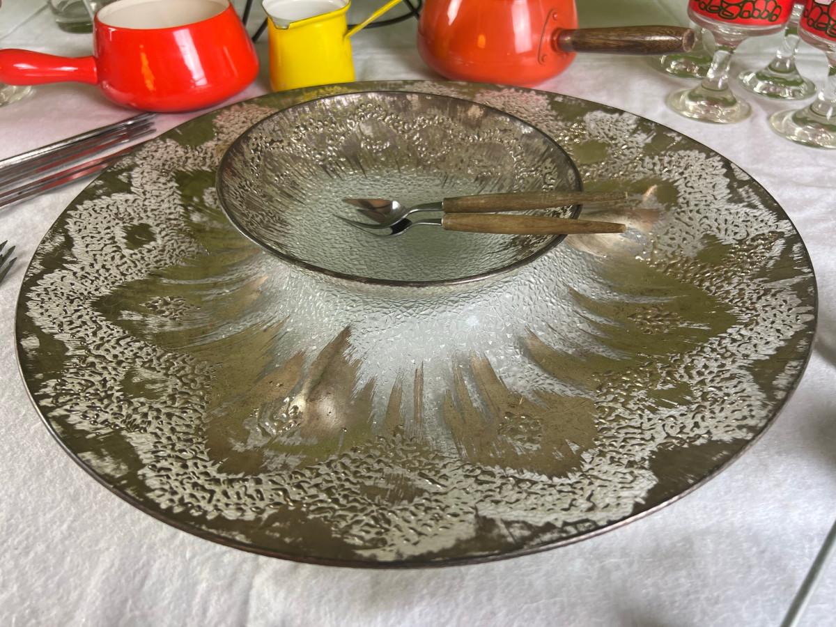 Dip platter with bowl 3" x 16", cookie and decorating tools, rosette irons, bag of hors d'oeuvre sticks, yellow metal pouring cup 3" x 7.5" as is, 3 pcs stainless steel Japan utensils, 2 pc Japan Nevco, 6 x 10" fondue forks (some rusted), 6 x 8.5" fondue forks some rust, metal fondue pot with lid 5" x 6" x 10", ceramic fondue pot 3" x 4.5" x 7", block pot warmer 6.5" x 8", 8 tobasco cups and 4 Nugget casino cups