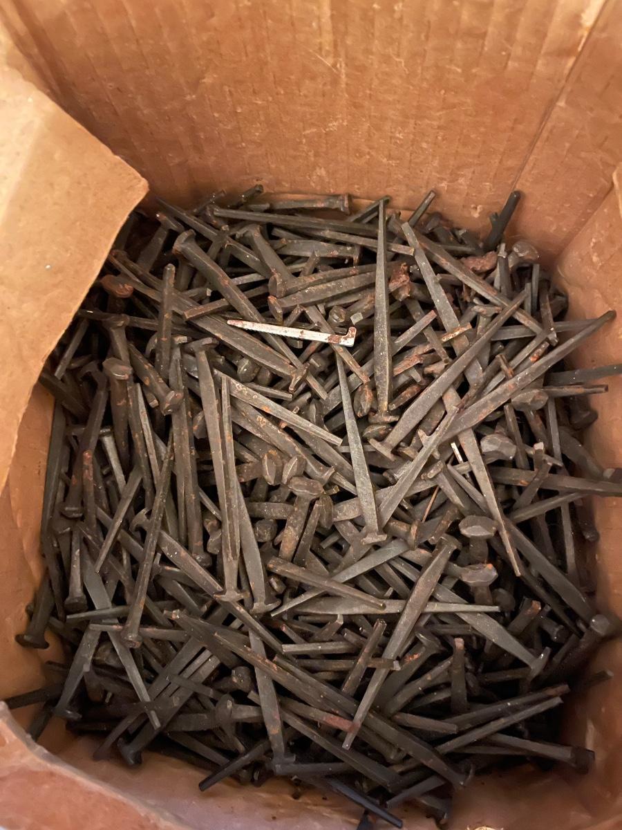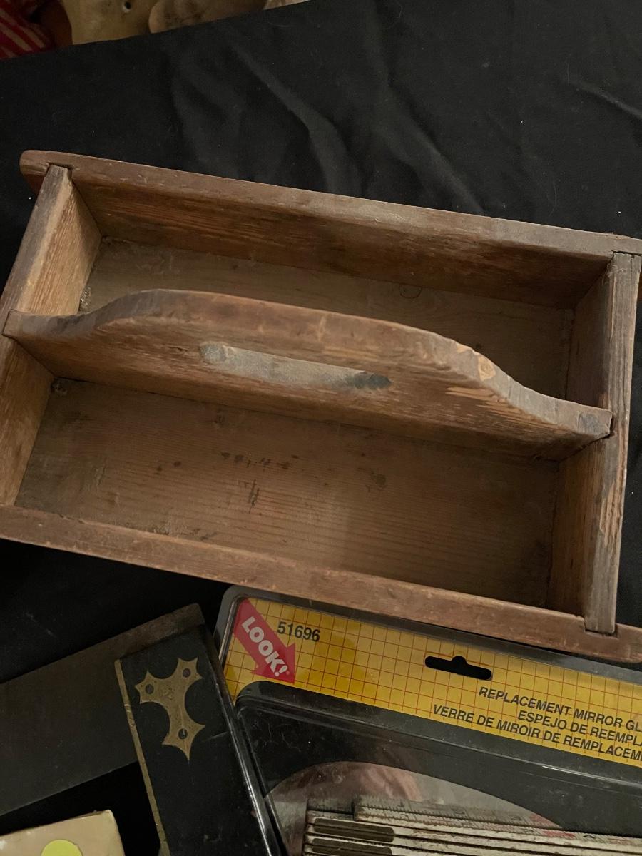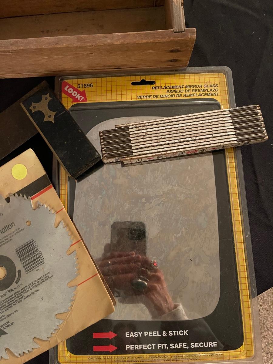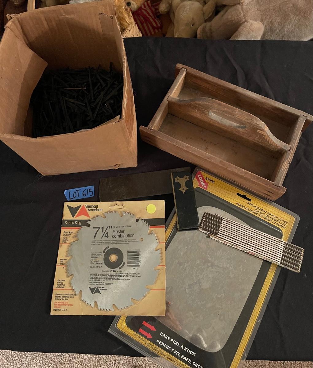 Box filled with approximately 10lbs full of square handmade nails for flooring, quality solid wood tool carrier/tray, 7-1/4" saw blade (new), replacement mirror glass, level, extendable level.