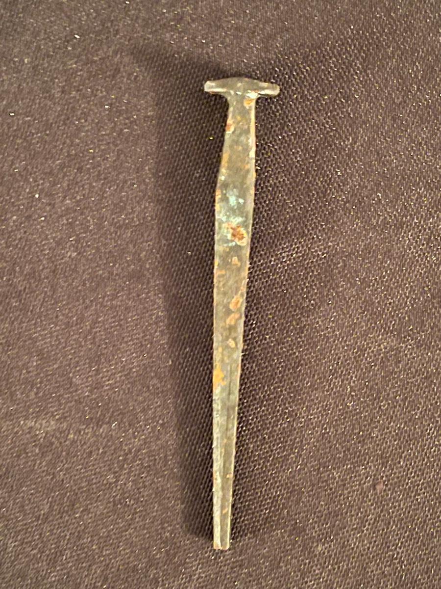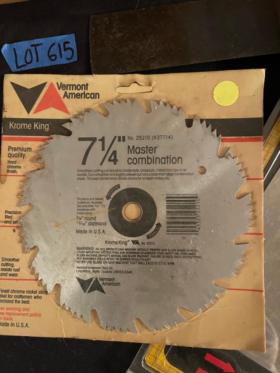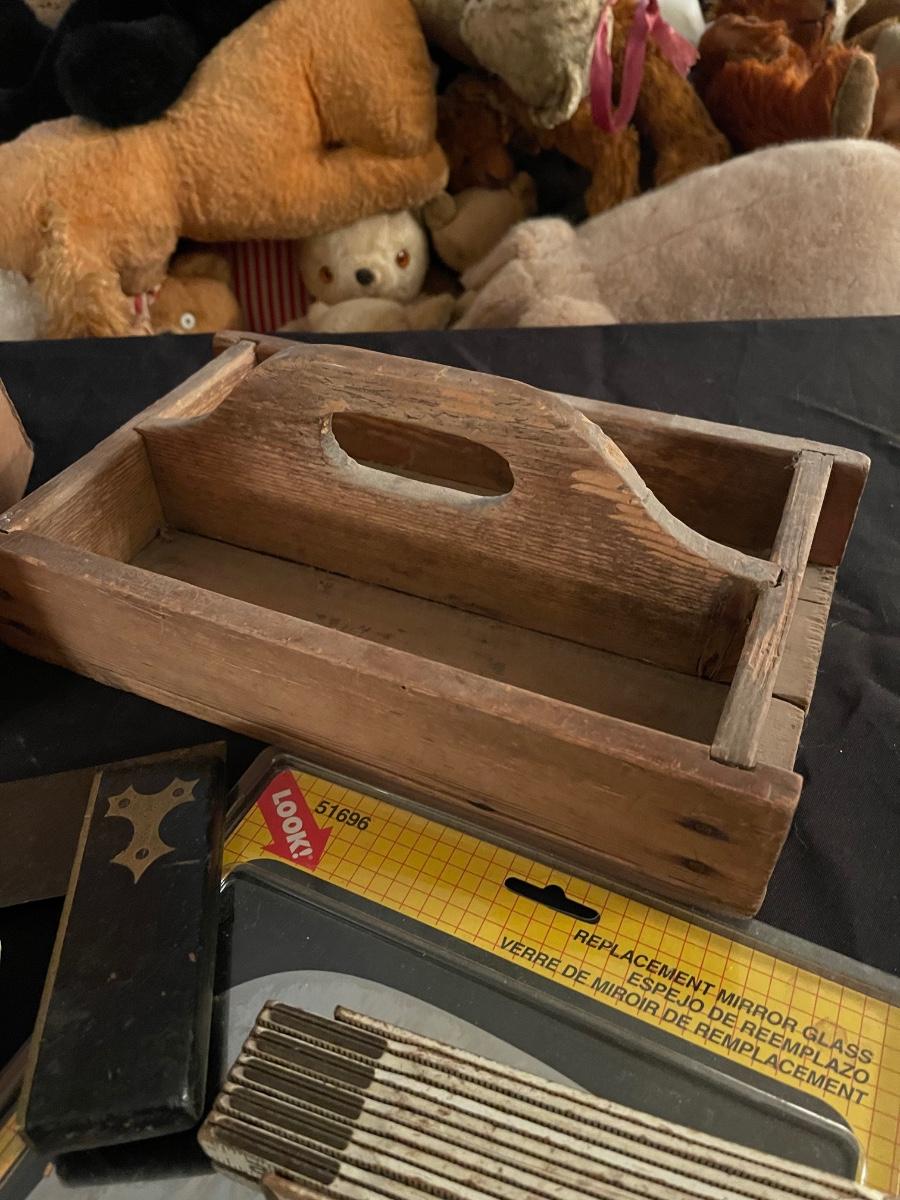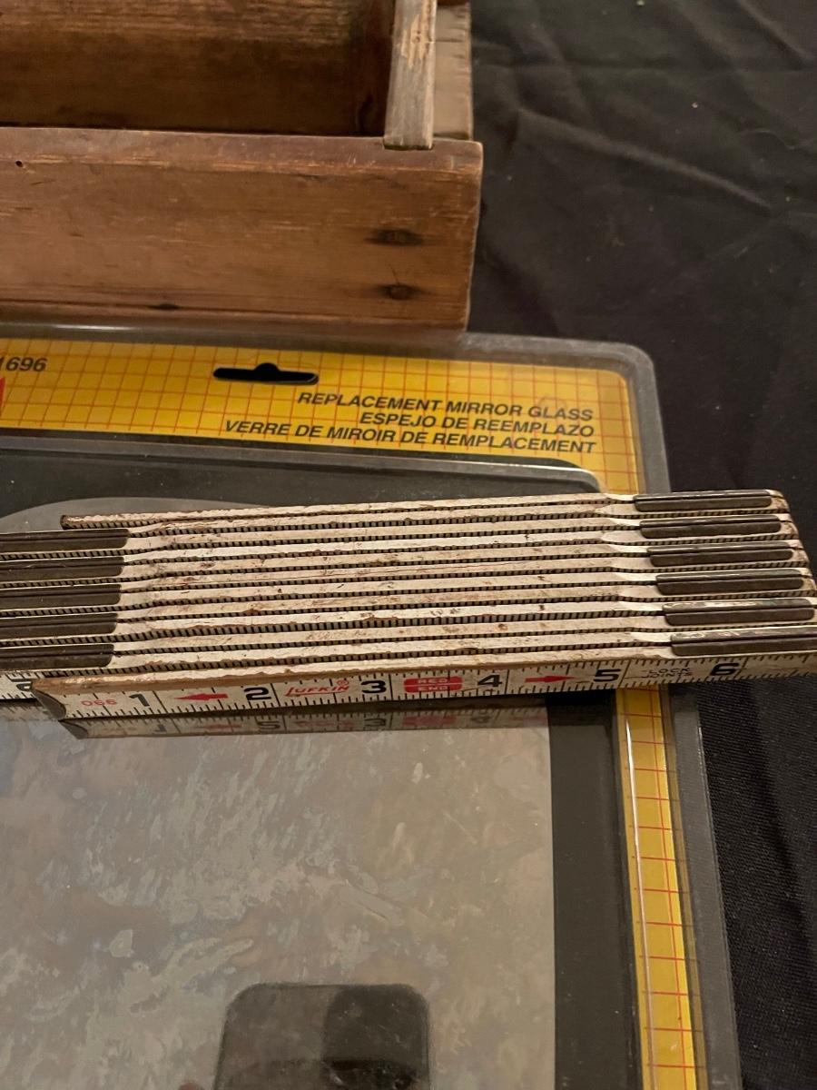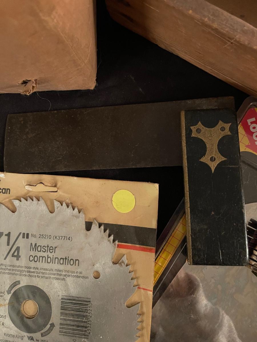 Box filled with approximately 10lbs full of square handmade nails for flooring, quality solid wood tool carrier/tray, 7-1/4" saw blade (new), replacement mirror glass, level, extendable level.