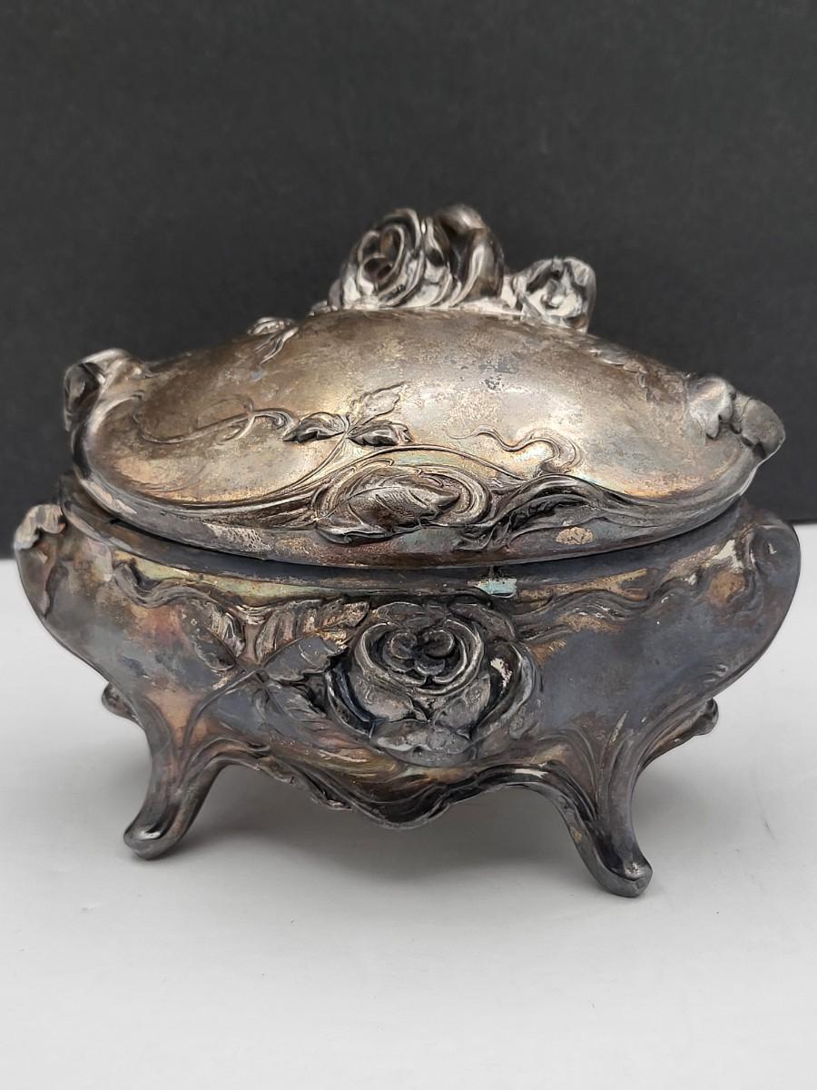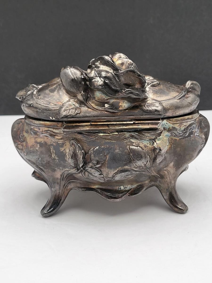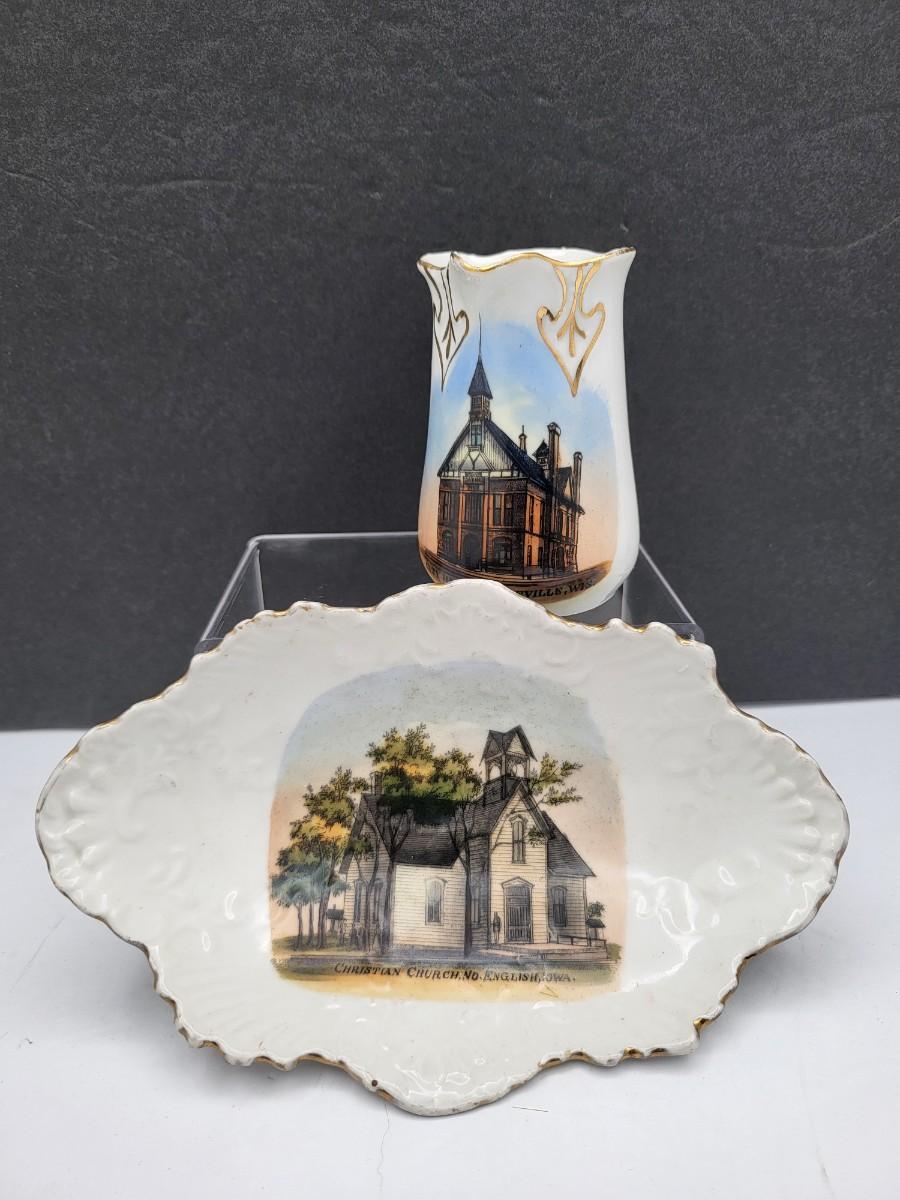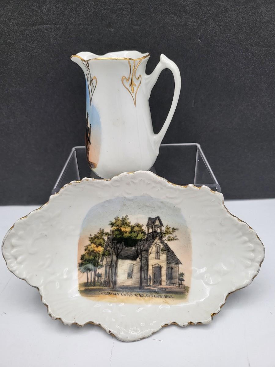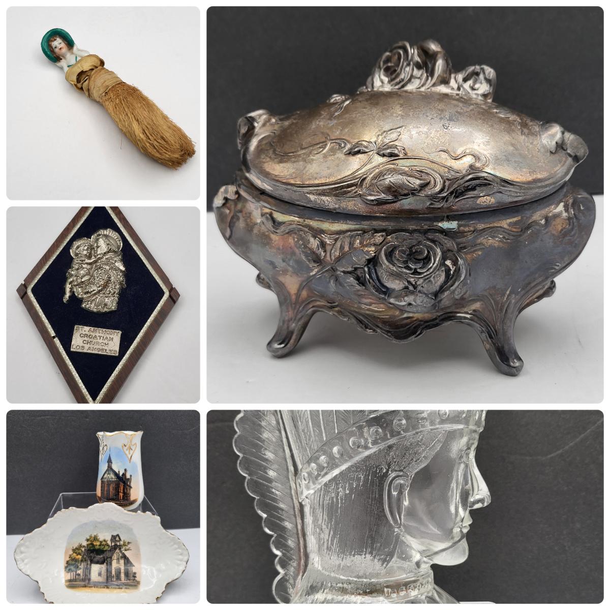 Indian cup, metal jewelry casket, religious plaque, Weimar Germany porcelain pitcher and trinket dish.