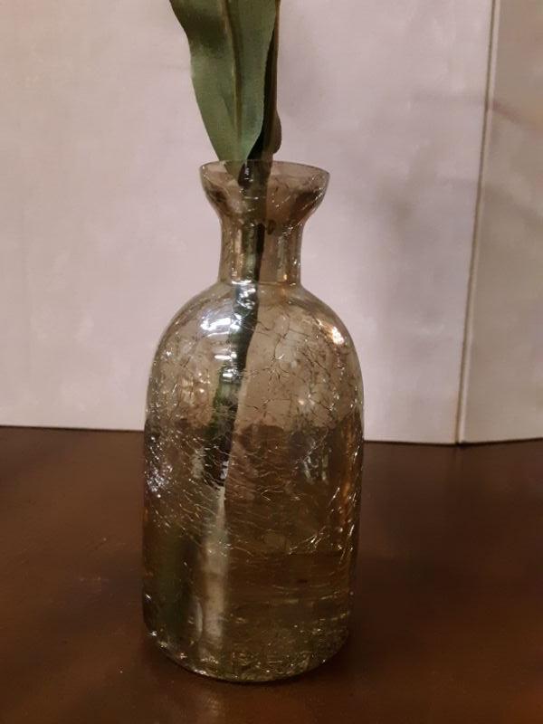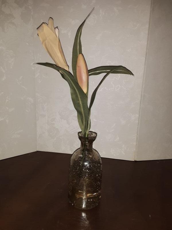 Very unique vase, grey/green glass with crackle; lilies attached inside