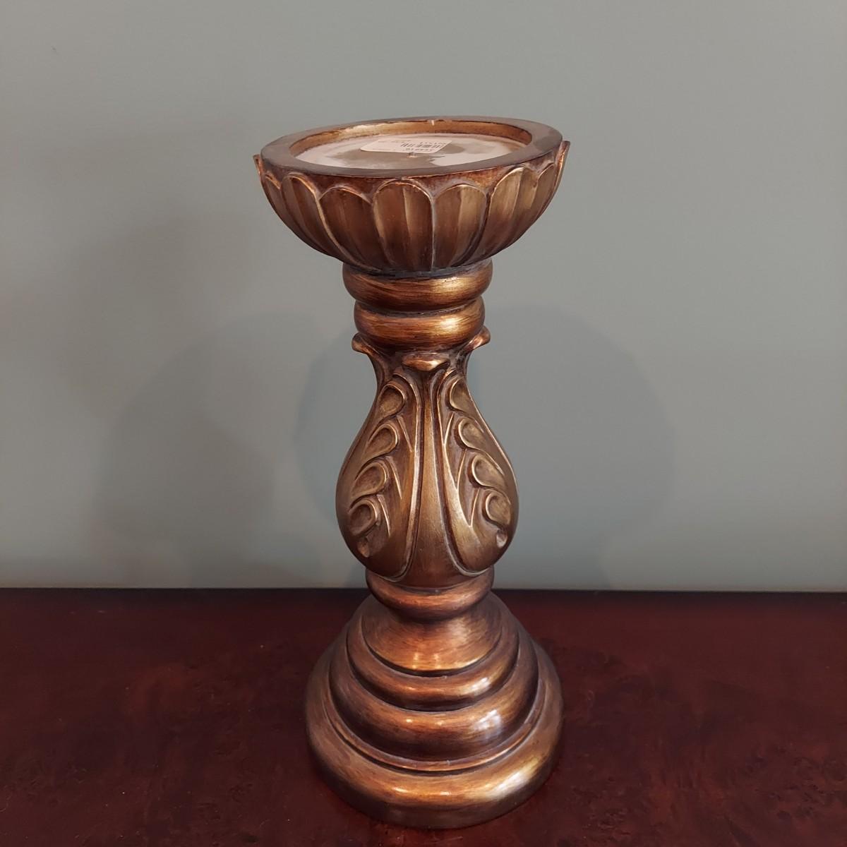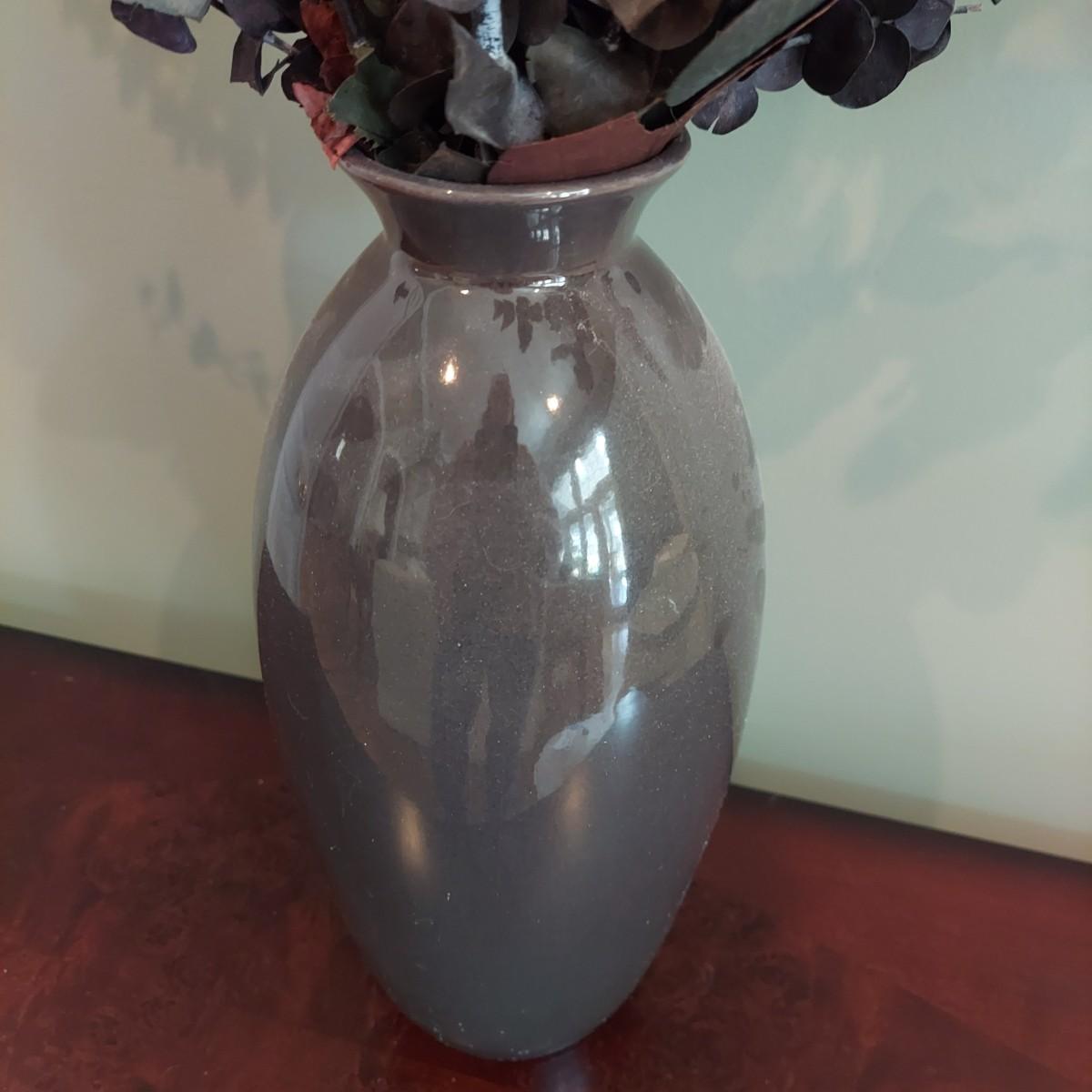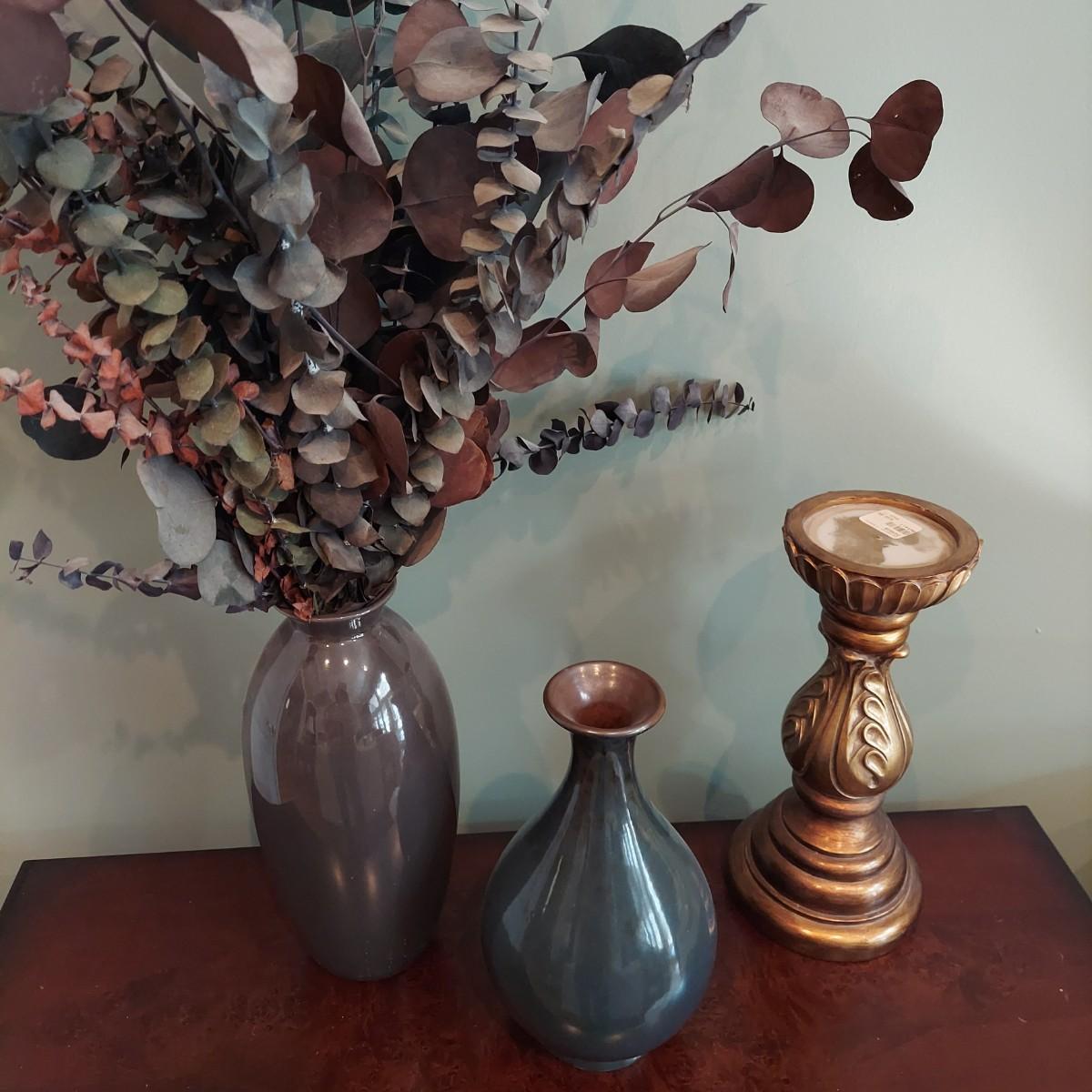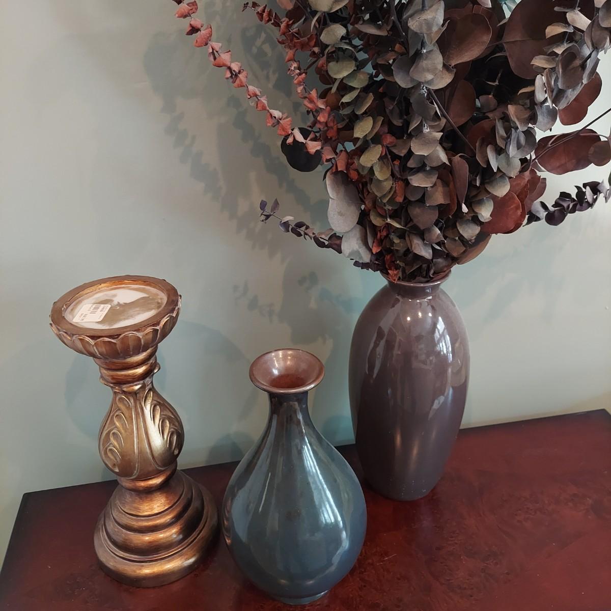 Three pieces of home decor including a ceramic vase with a dried eucalyptus arrangement. Plus another ceramic vase and a carved wood candle holder. Tallest vase is 12"H alone and 32"H with plants. Please see photos for details. Local pickup only.