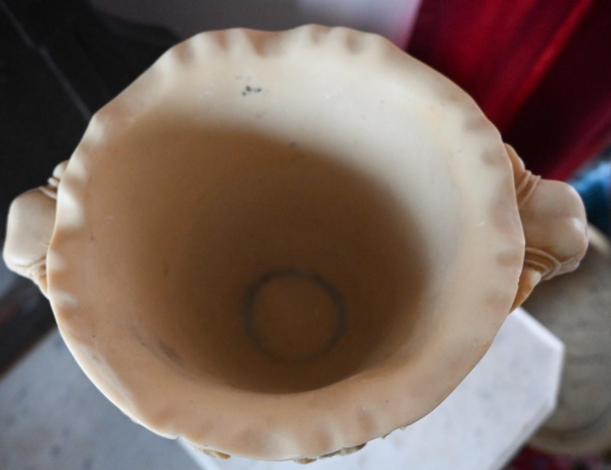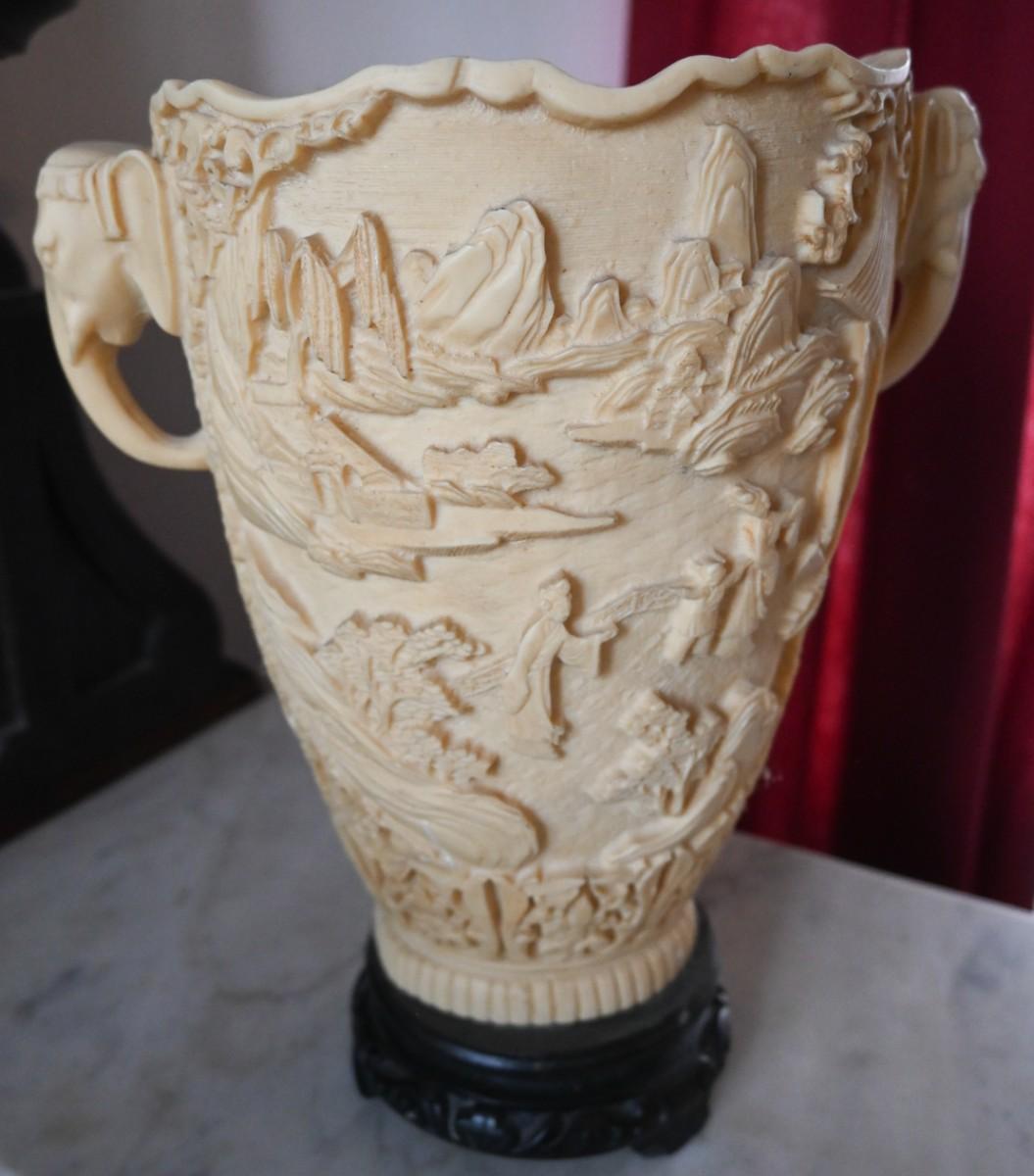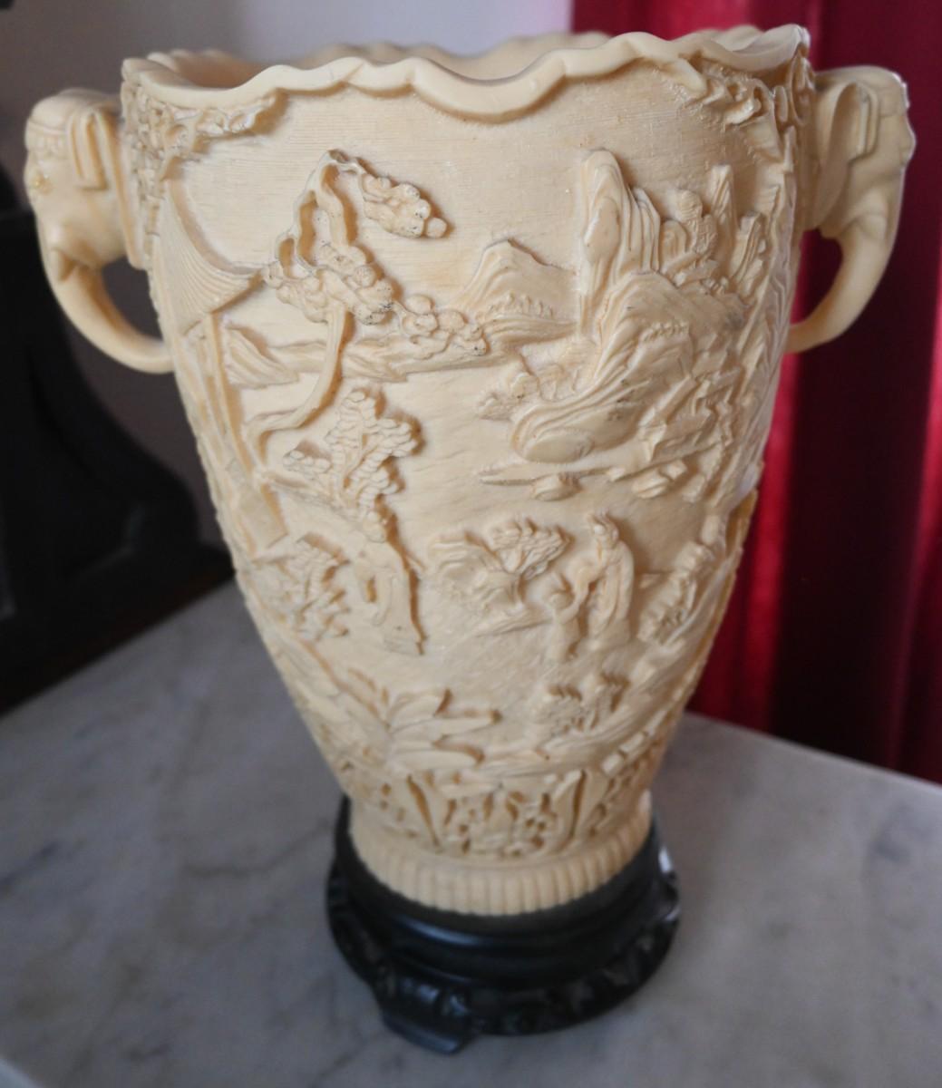 CARVED COMPOSITE / SOAPSTONE? VASE WITH ELEPHANT HANDLES (3 OF 3)