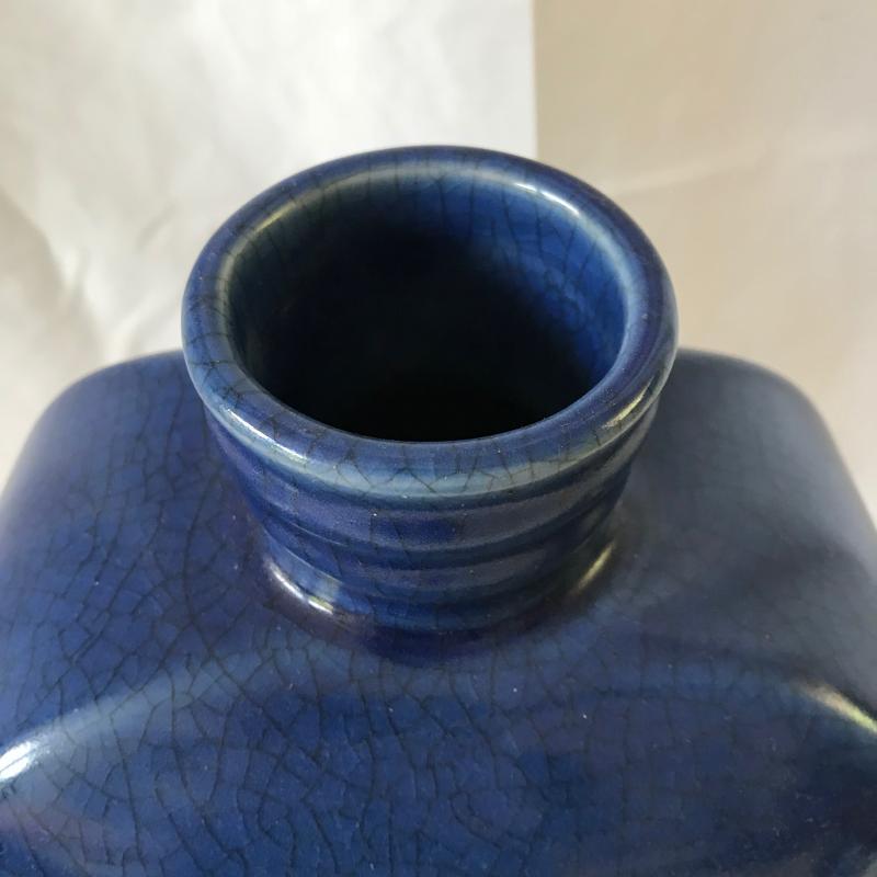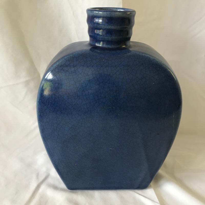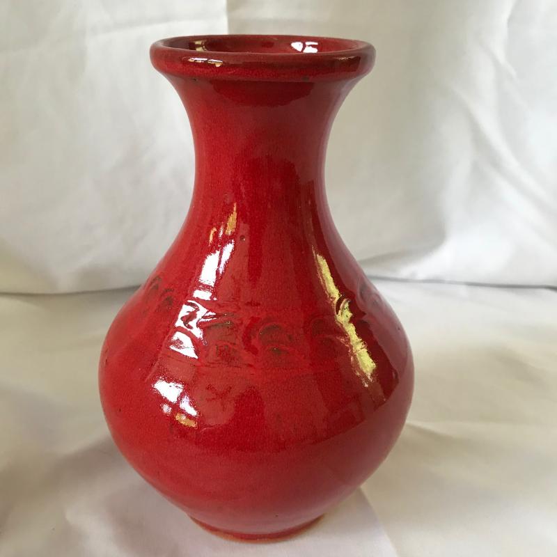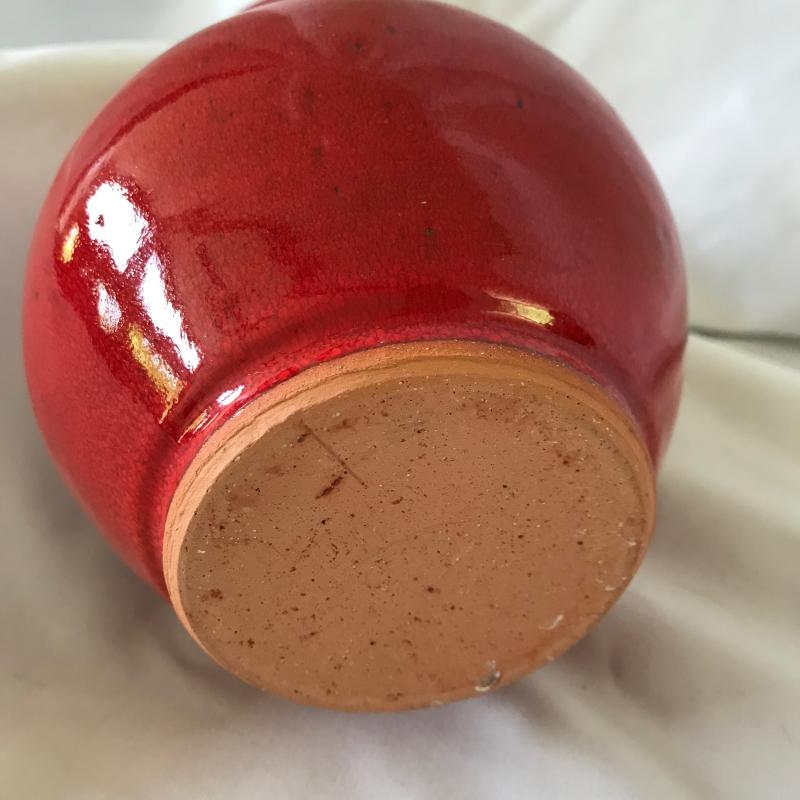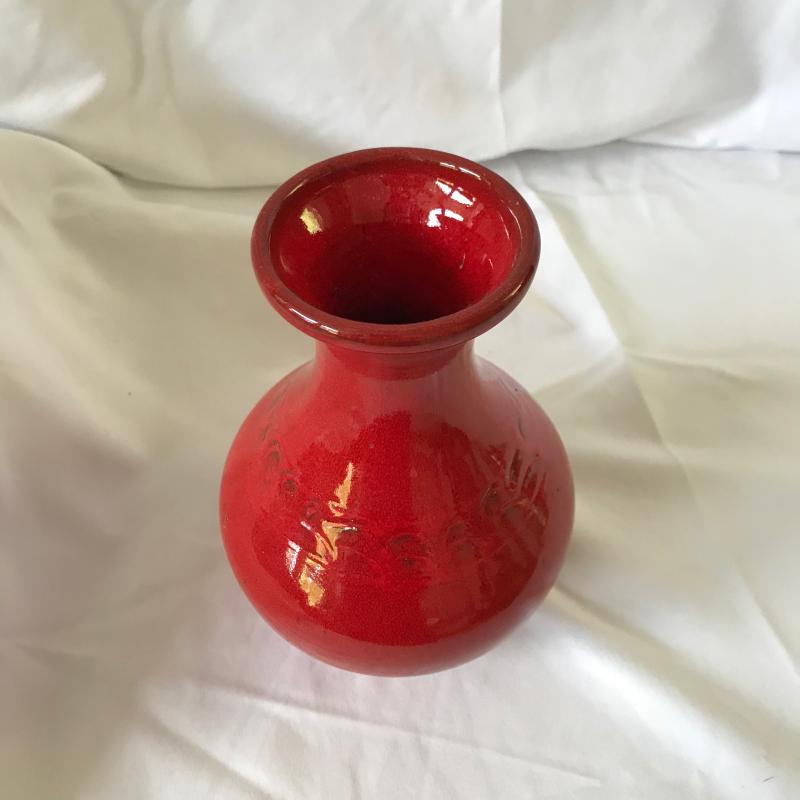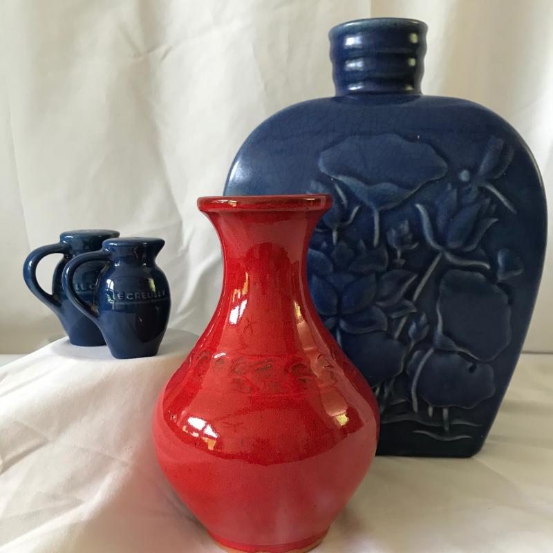 Lot contains two ceramic vases. Blue vase is approx. 12” tall and 9” wide, red vase is approx. 8” tall. Lot also includes pair of blue Le Creuset Salt and pepper shakers. Shipping available or local pickup in Hendersonville, NC.