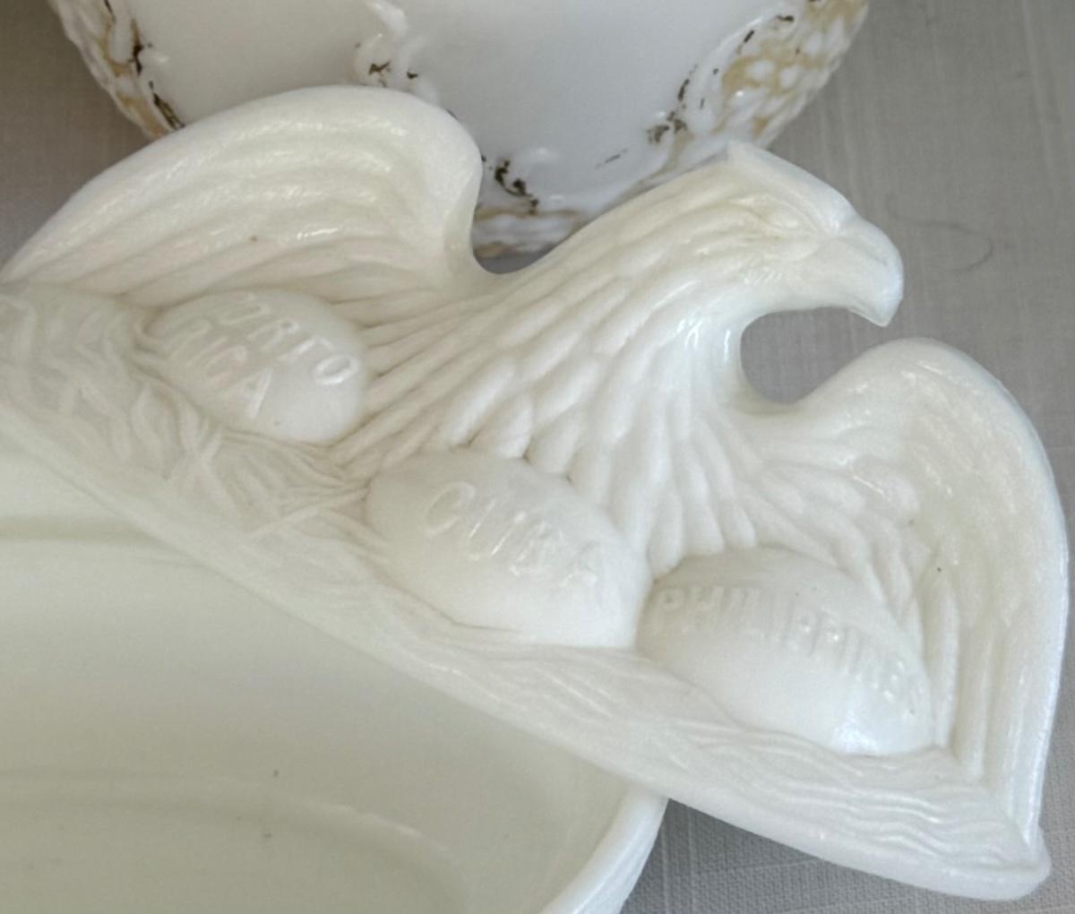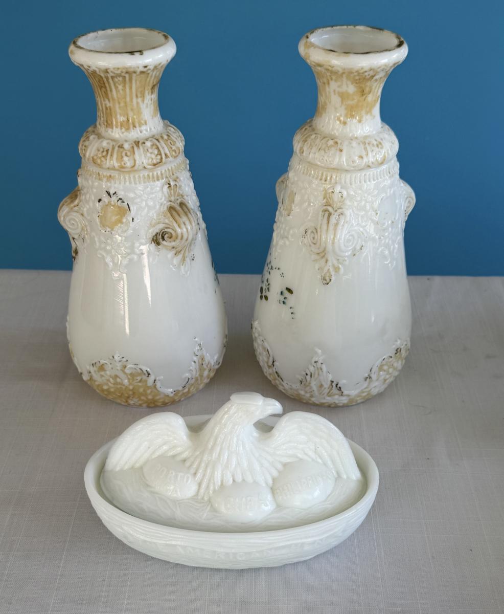 Early 1900s Milk Glass Vases, Spanish Am War era Eagle on nest w/eggs labeled Porto Rica, Cuba, Philippines.