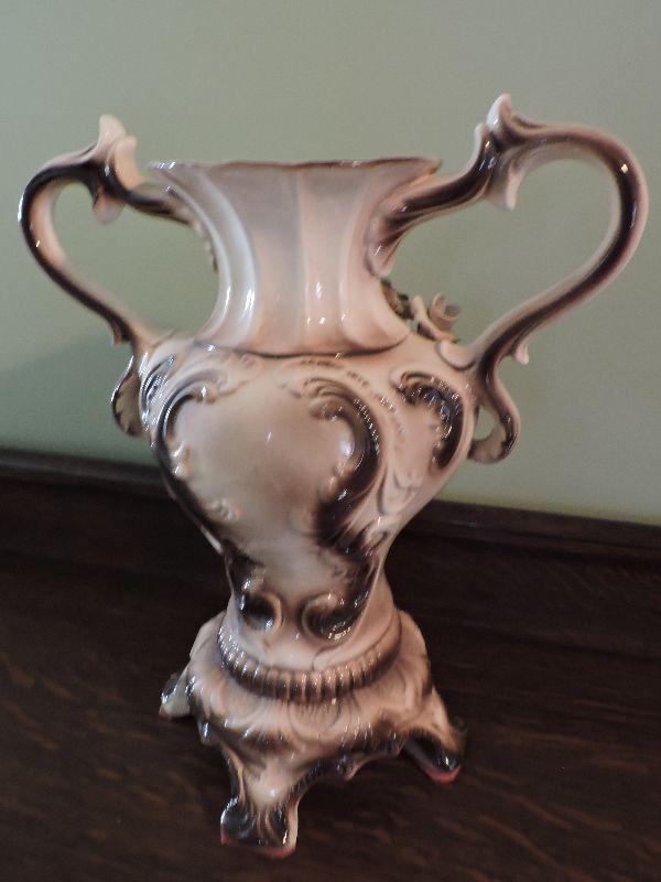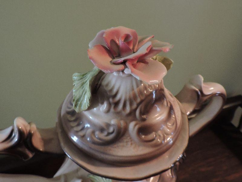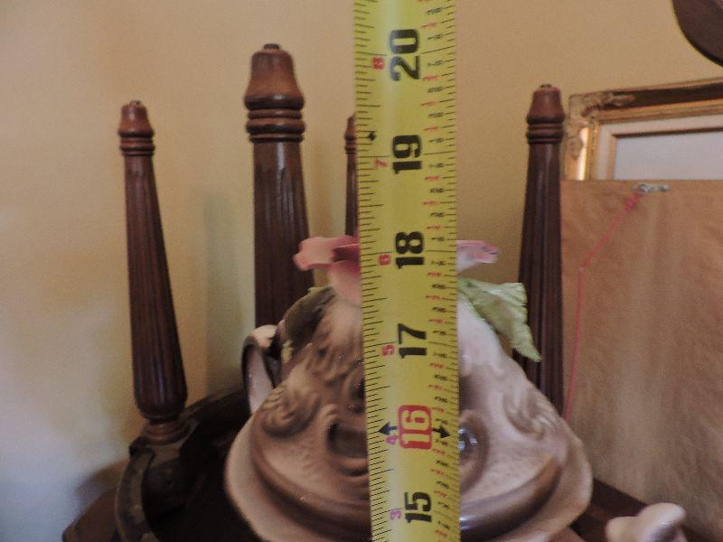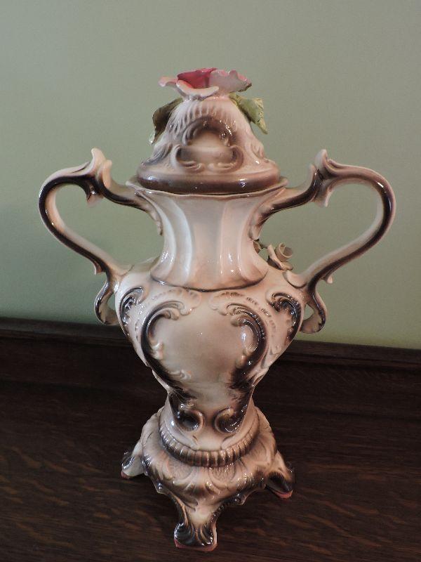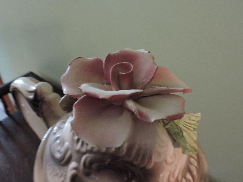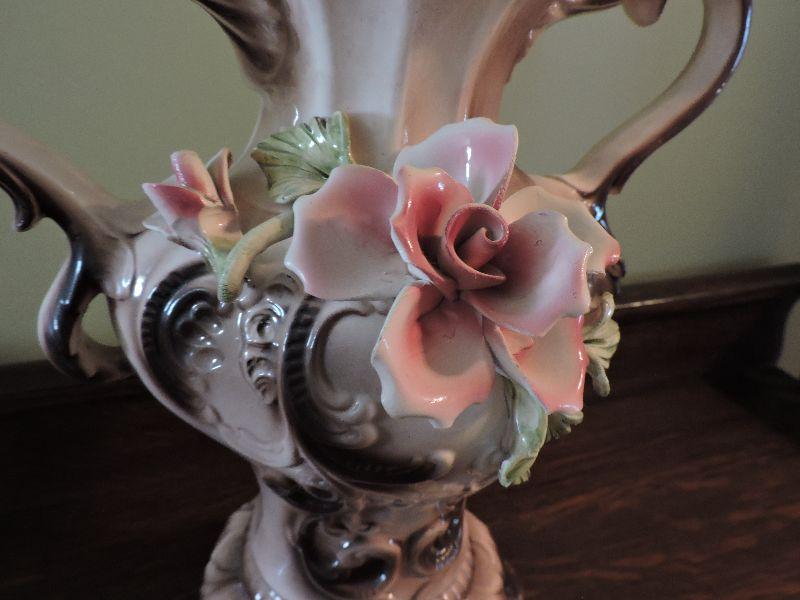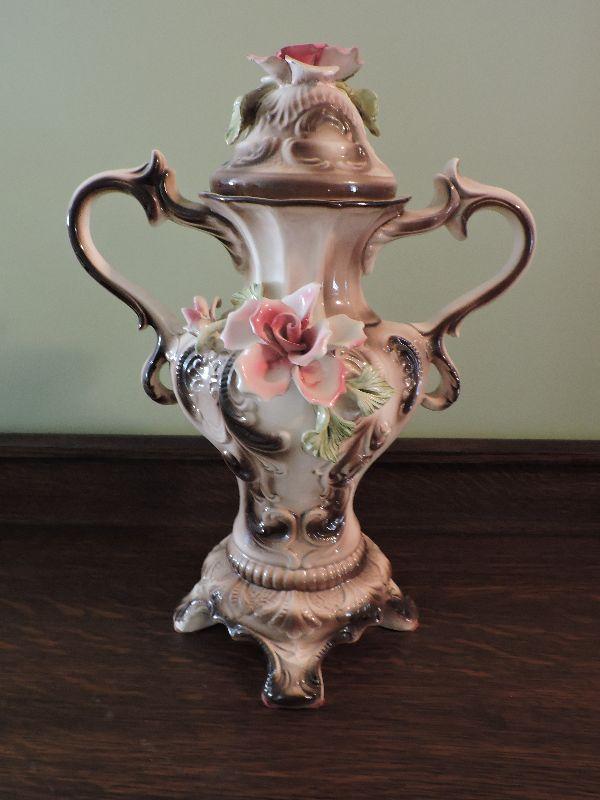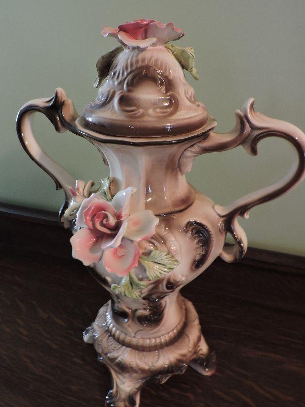 Beautiful urn/vase with capodimonte style flowers. Please read Terms and Conditions before placing a bid. Pick up is Friday, October 25th between 4 and 7, and Saturday, October 26th between 9 and 1. Props included in photos are not included in listing. All measurements are approximate. Comes from home with cats.