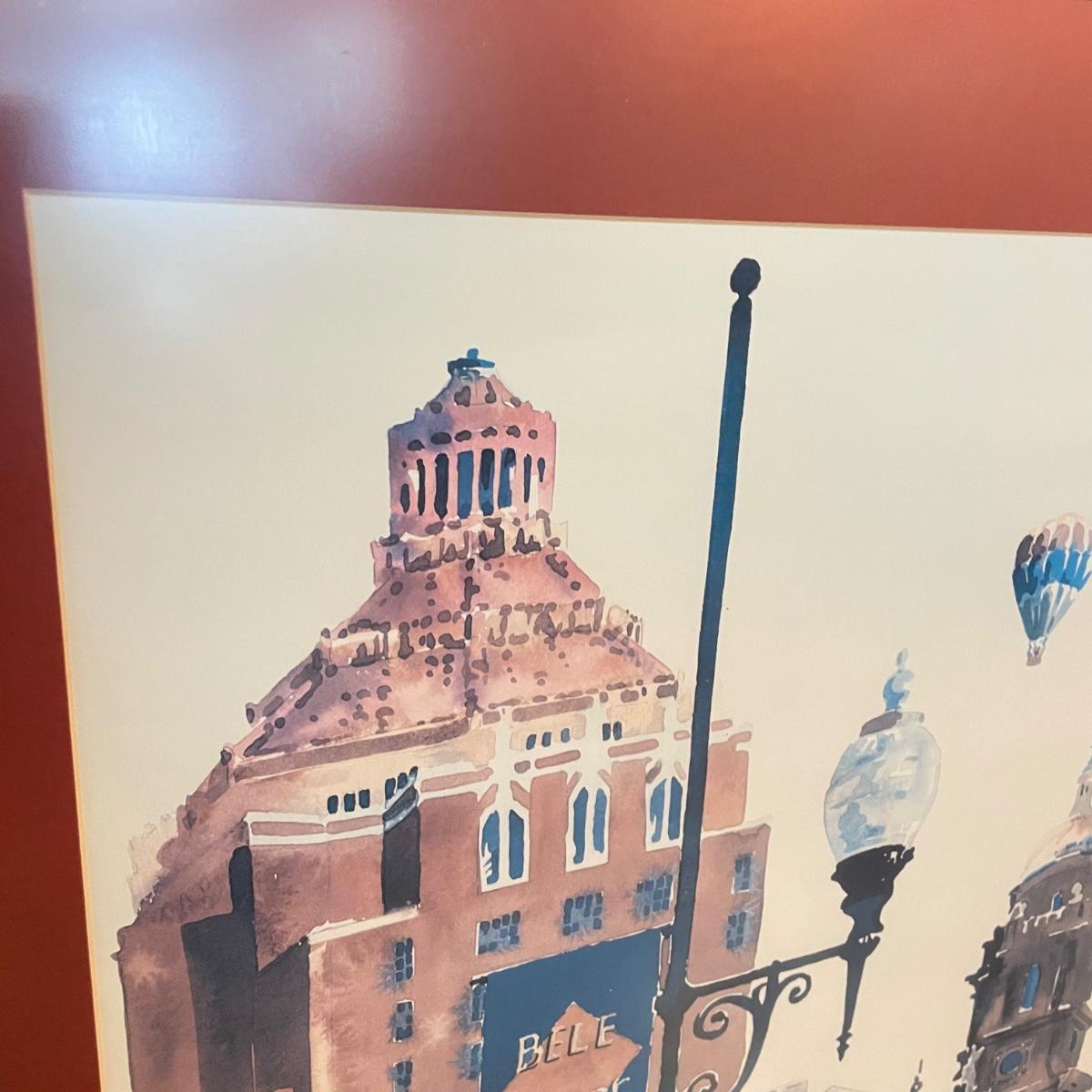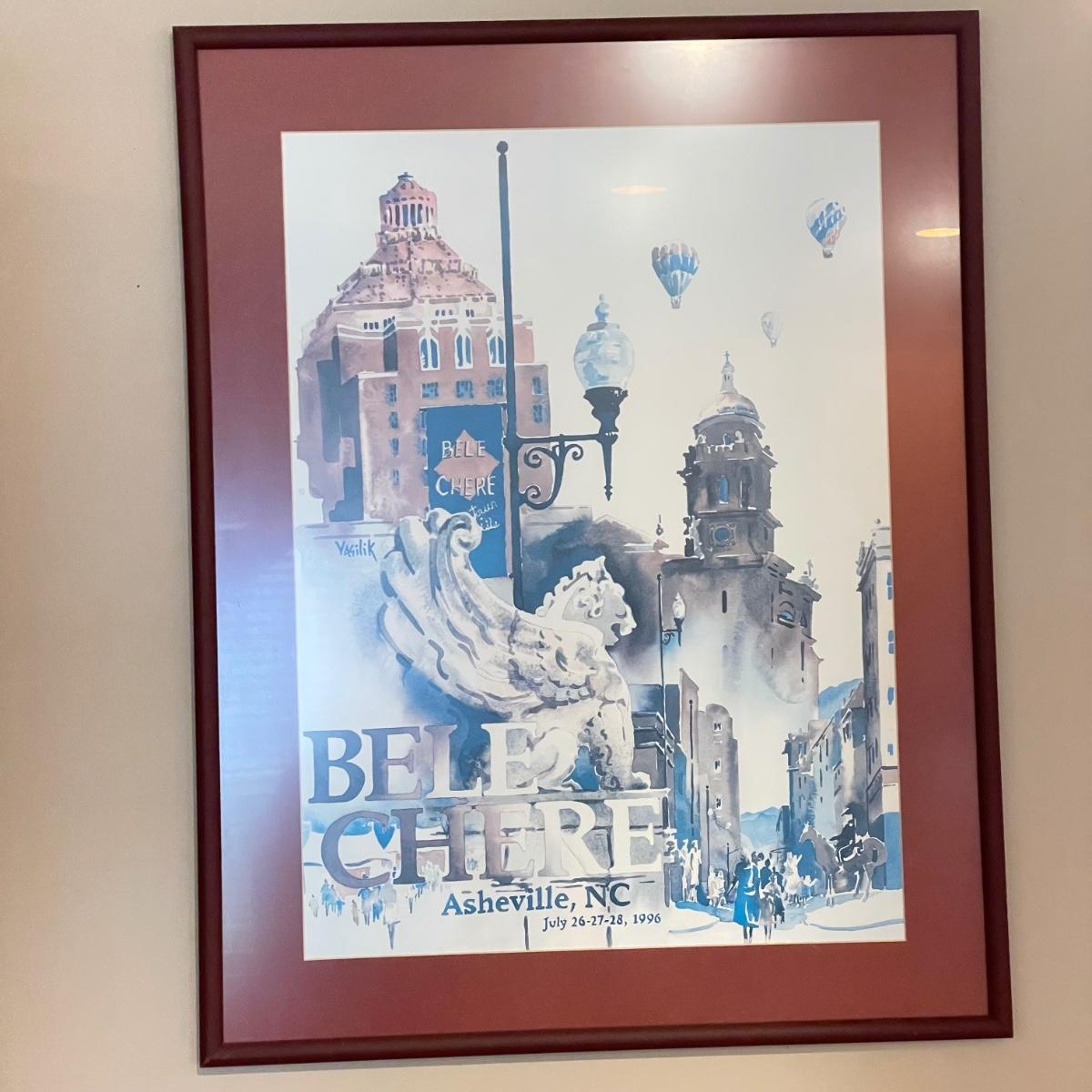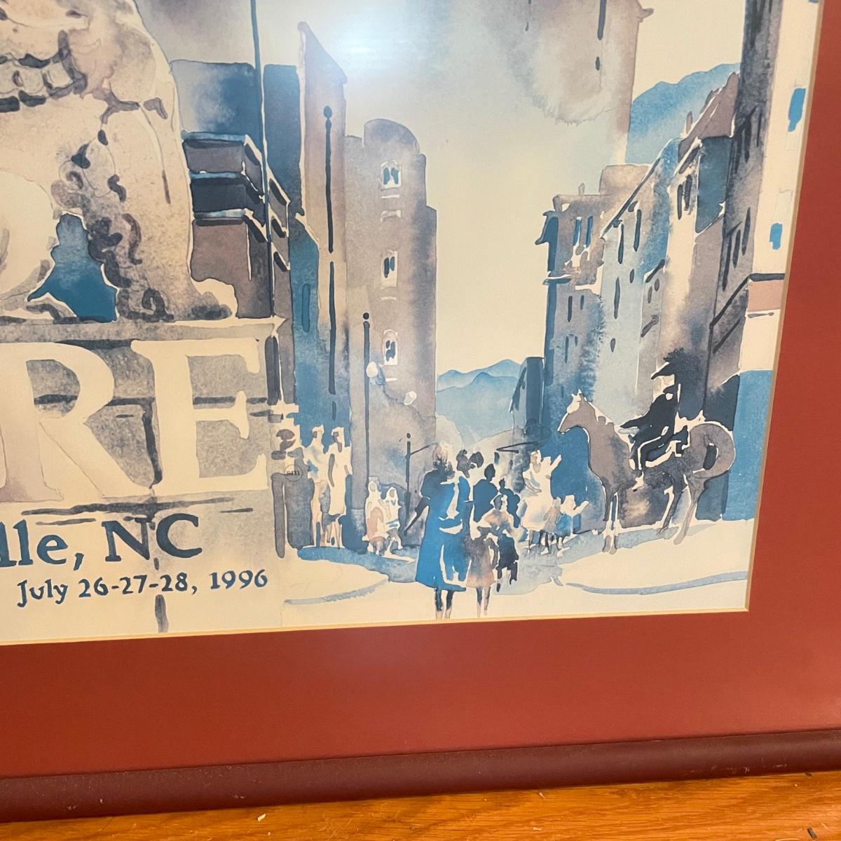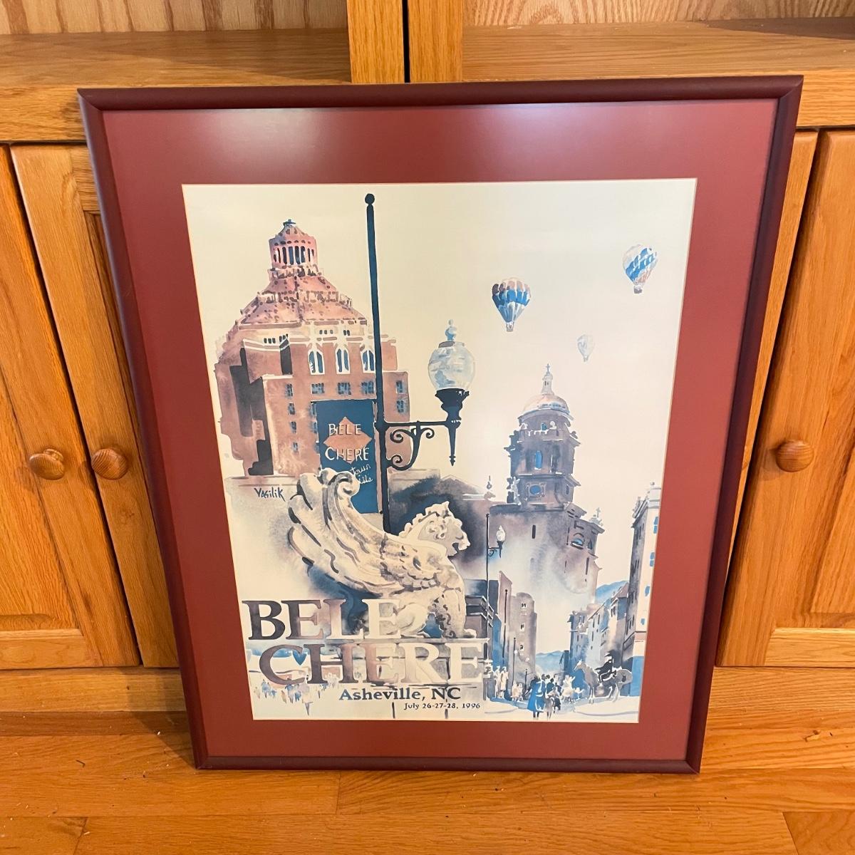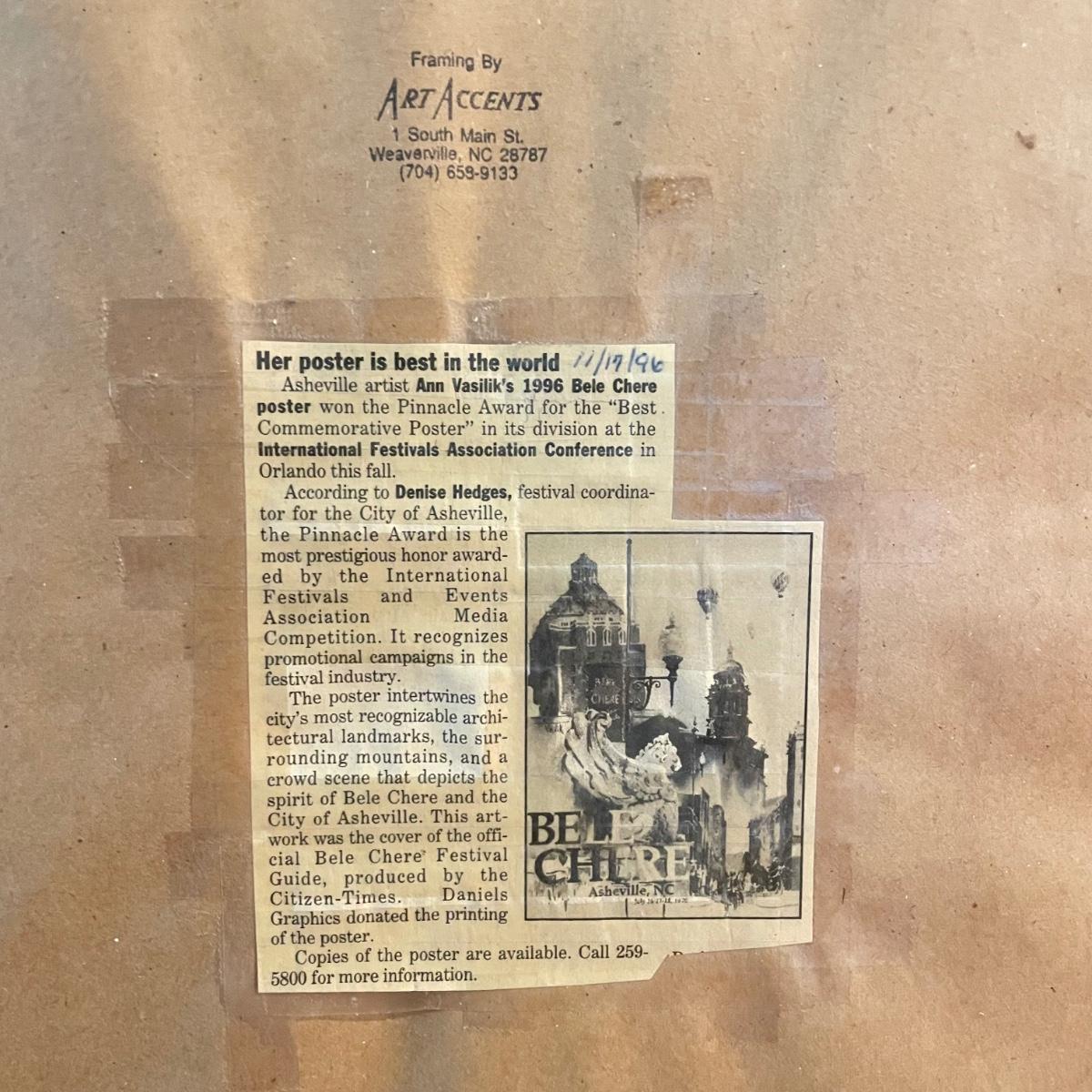 Another stunning Asheville art piece by Ann Vasilik. A newspaper clipping stated her 1996 poster won “Best Commemorative Poster” in its division at the International Festivals Association Conference. Poster is professionally framed behind glass. Frame measures 24” x 30”H. Shipping available. Shipping can be costly. We suggest contacting our preferred local shipping provider, Postage Express, with dimensions and getting an estimate before bidding: (828) 255-9250 or email shipping@postageexpressnc.com