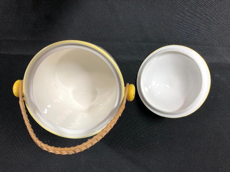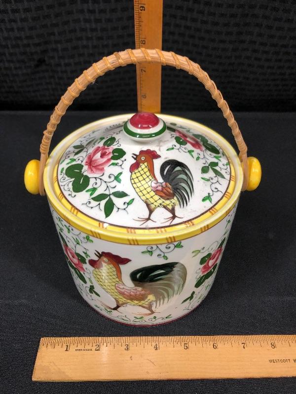 Vintage Ucagco majolica style biscuit jar. rustic rooster and rose pattern. Wicker handle. In good condition. Stands about 6" not including the handle. Has original sticker, a bit worn, still attached on the bottom. #020-00214