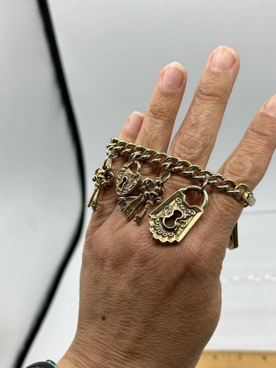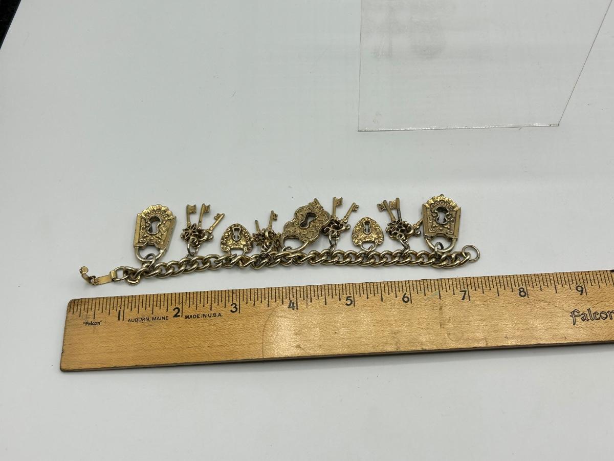 Vintage Retro Gold Tone Lock and Key Charm Bracelet