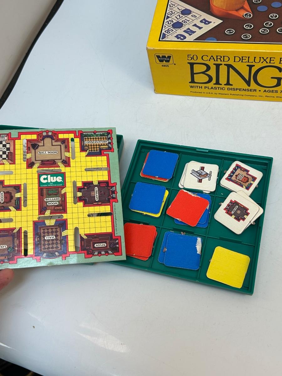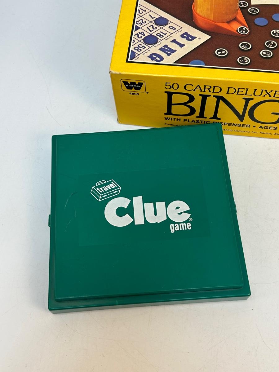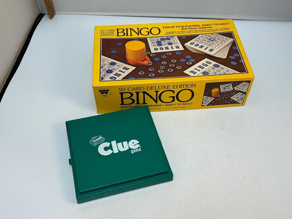 Travel CLUE Board Game & Deluxe Edition BINGO. Both in good used condition, not checked completely for pieces but look fairly complete.