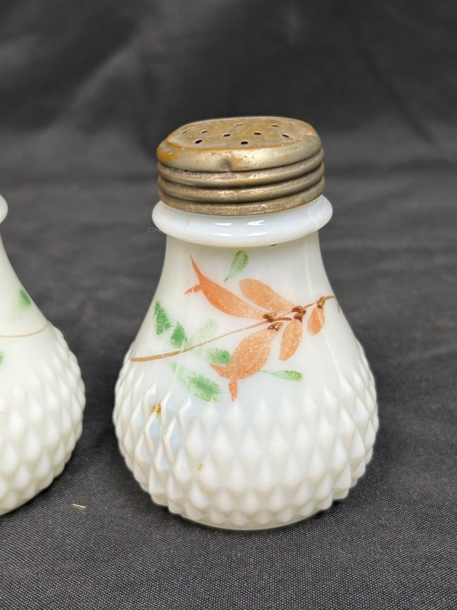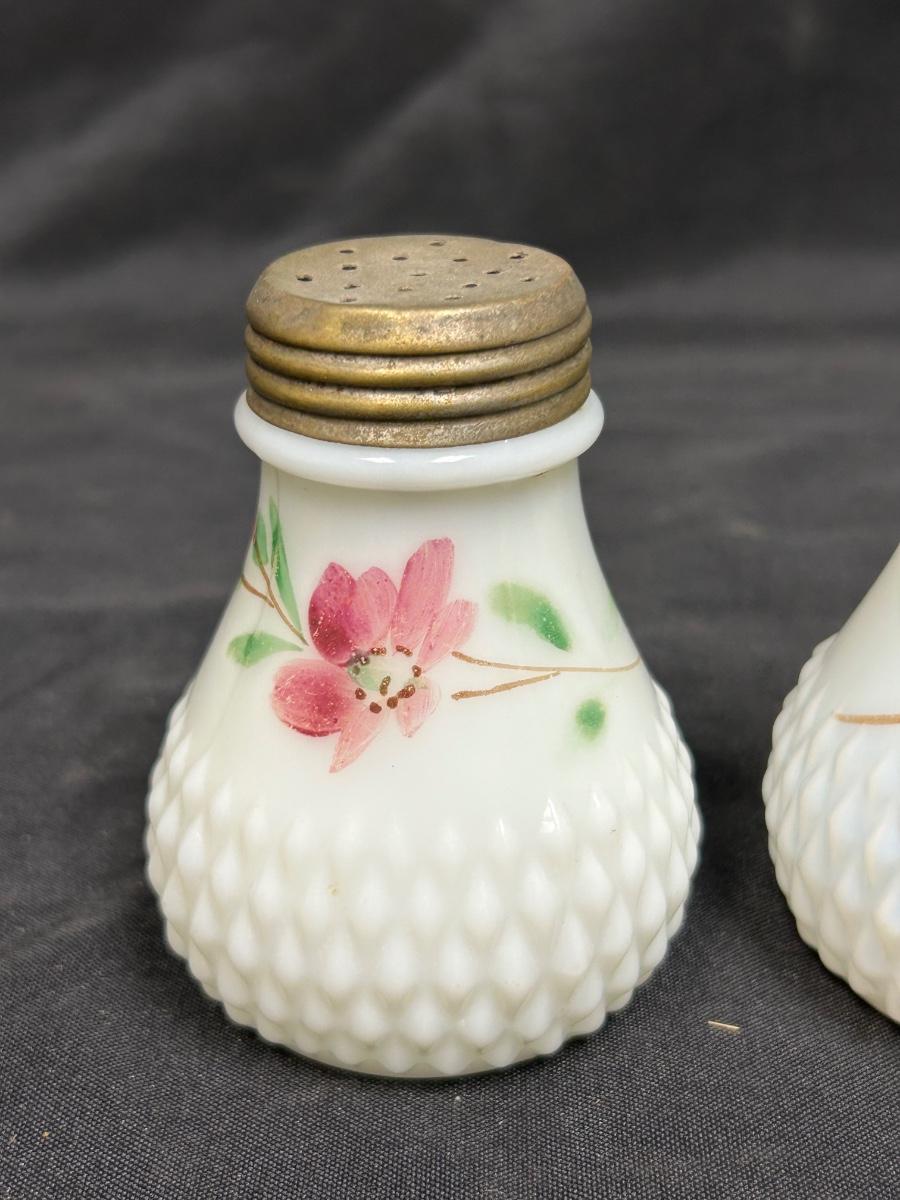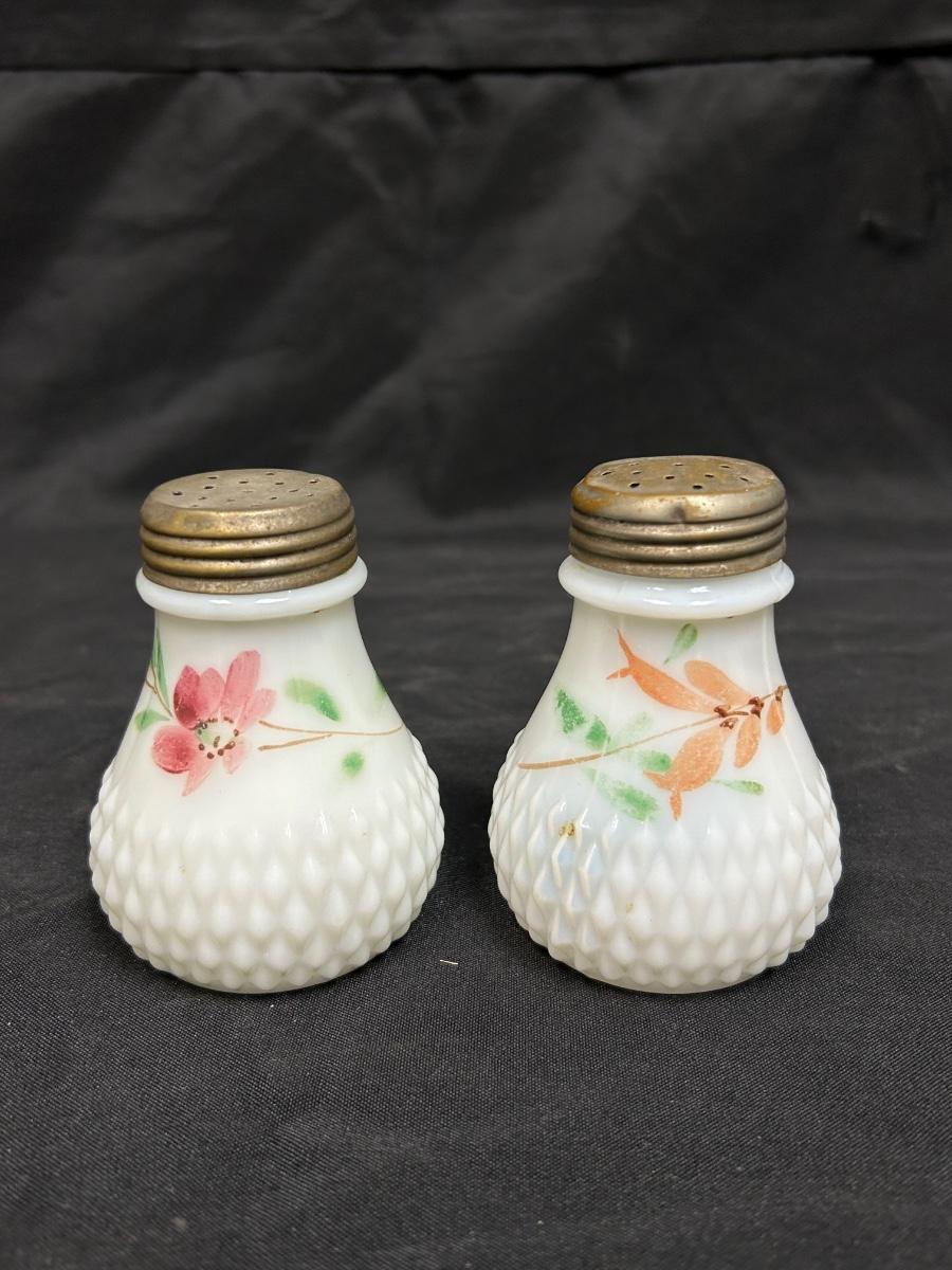 Pair of Vintage Hand Painted Flower Pattern Milk Glass Shakers