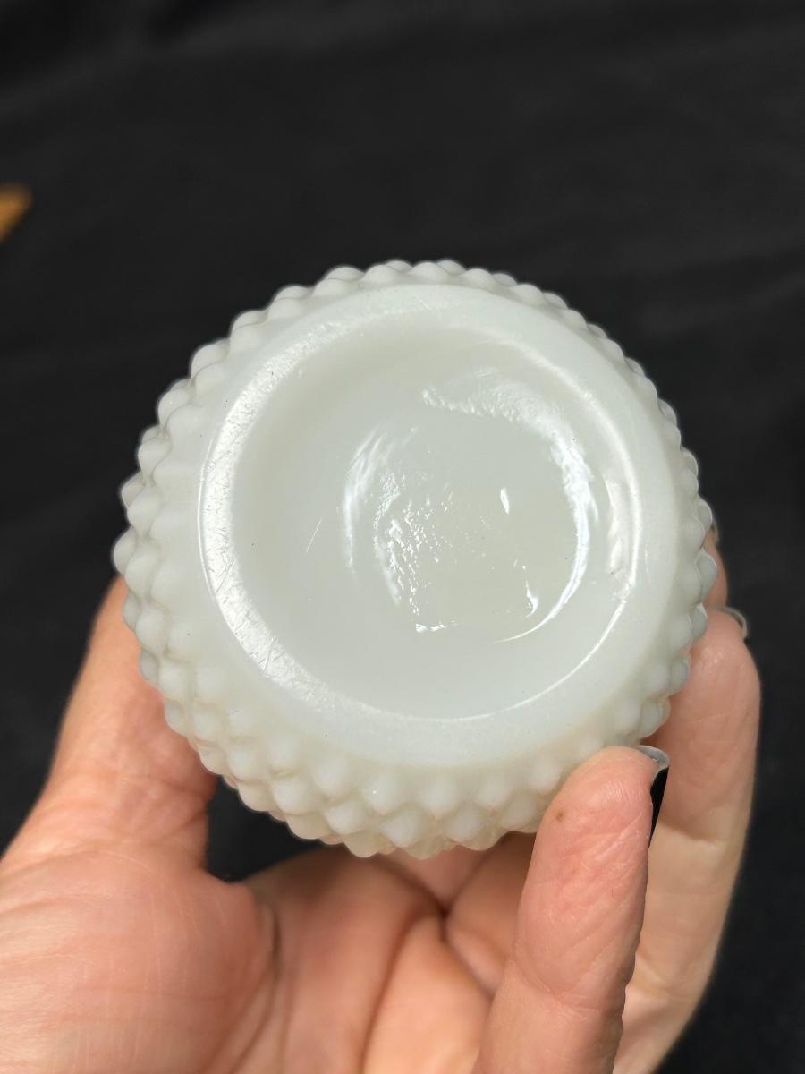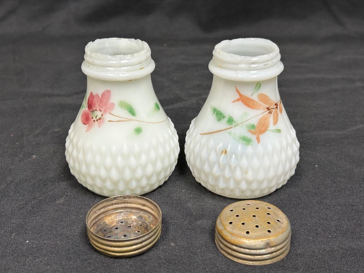 Pair of Vintage Hand Painted Flower Pattern Milk Glass Shakers. In good vintage condition. The opening edge of both shakers are chipped but unnoticed with caps on. Flower art has wear. About 3.5" size.