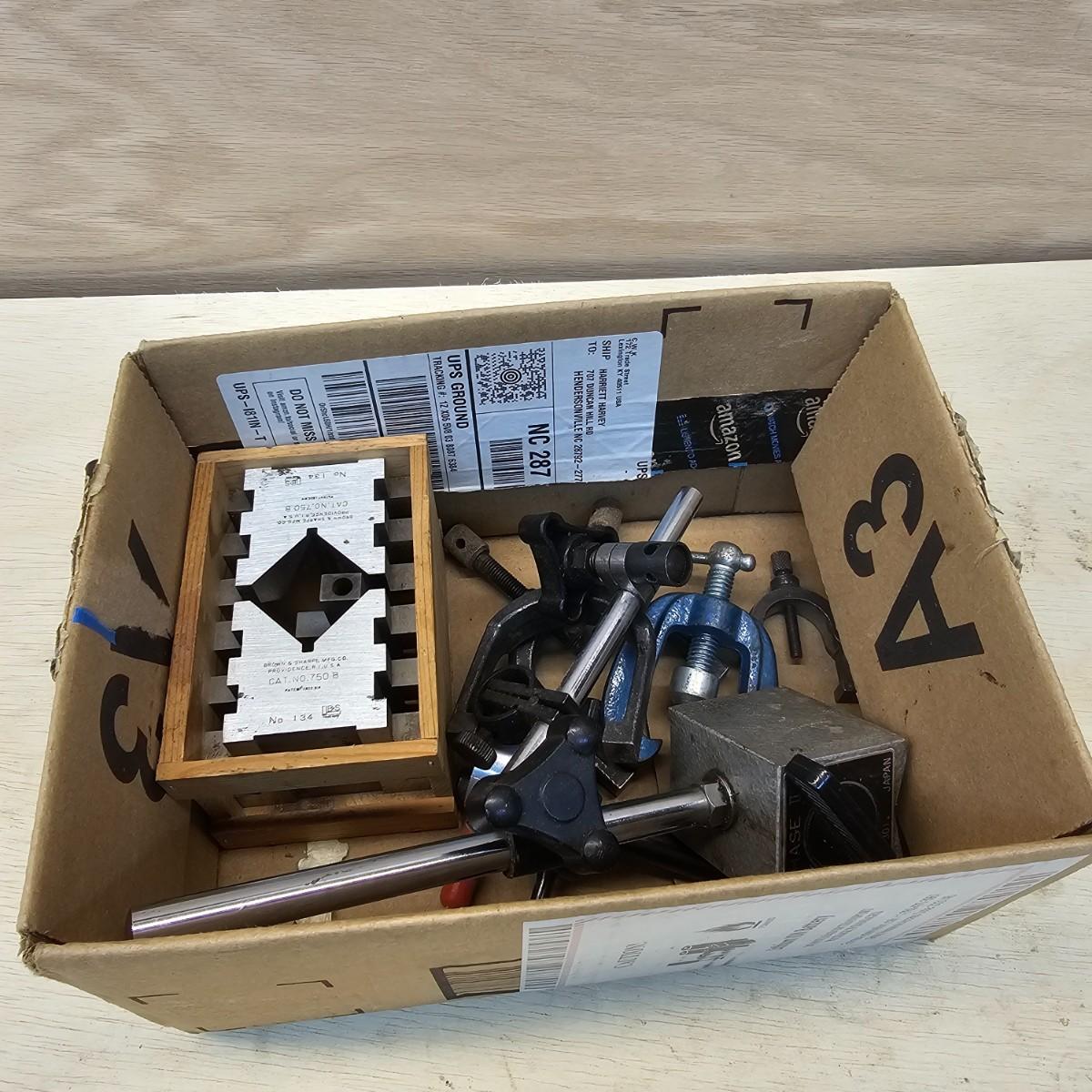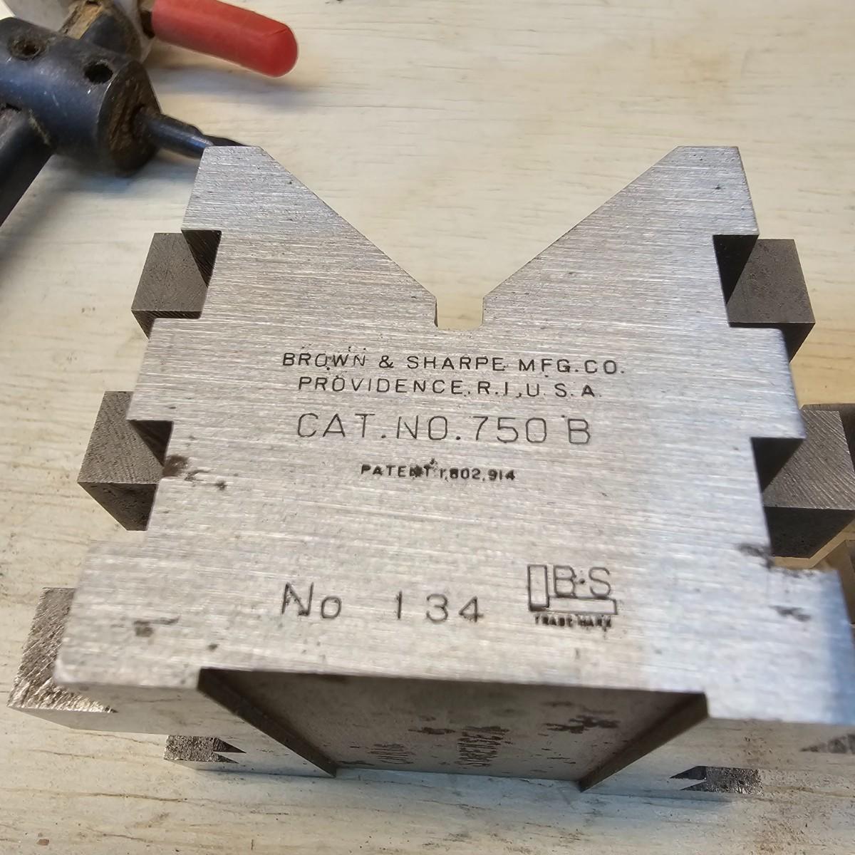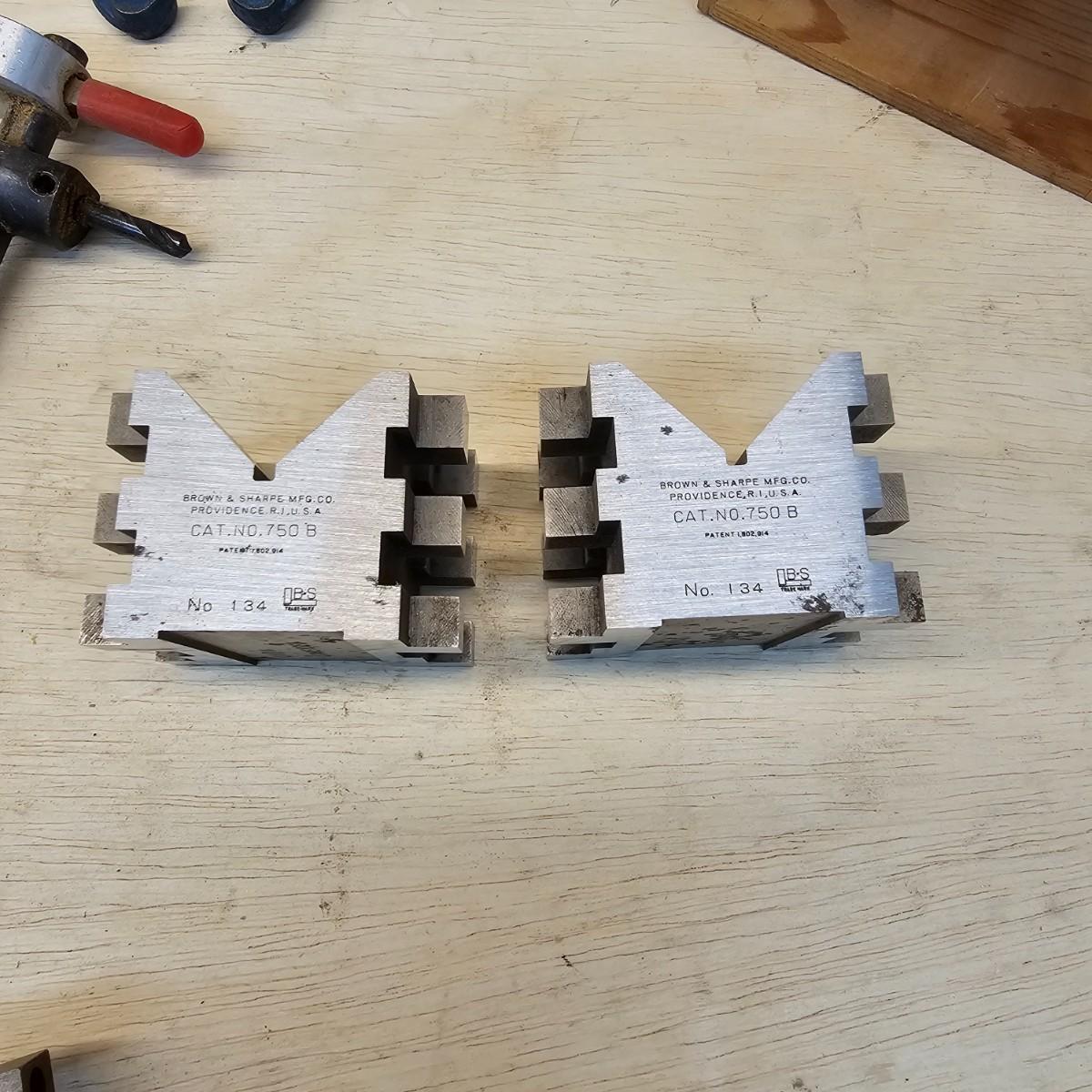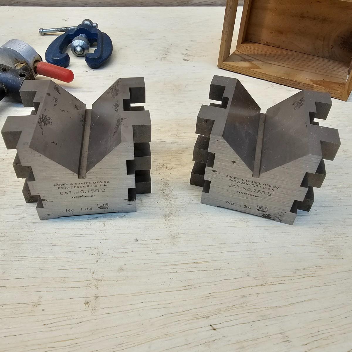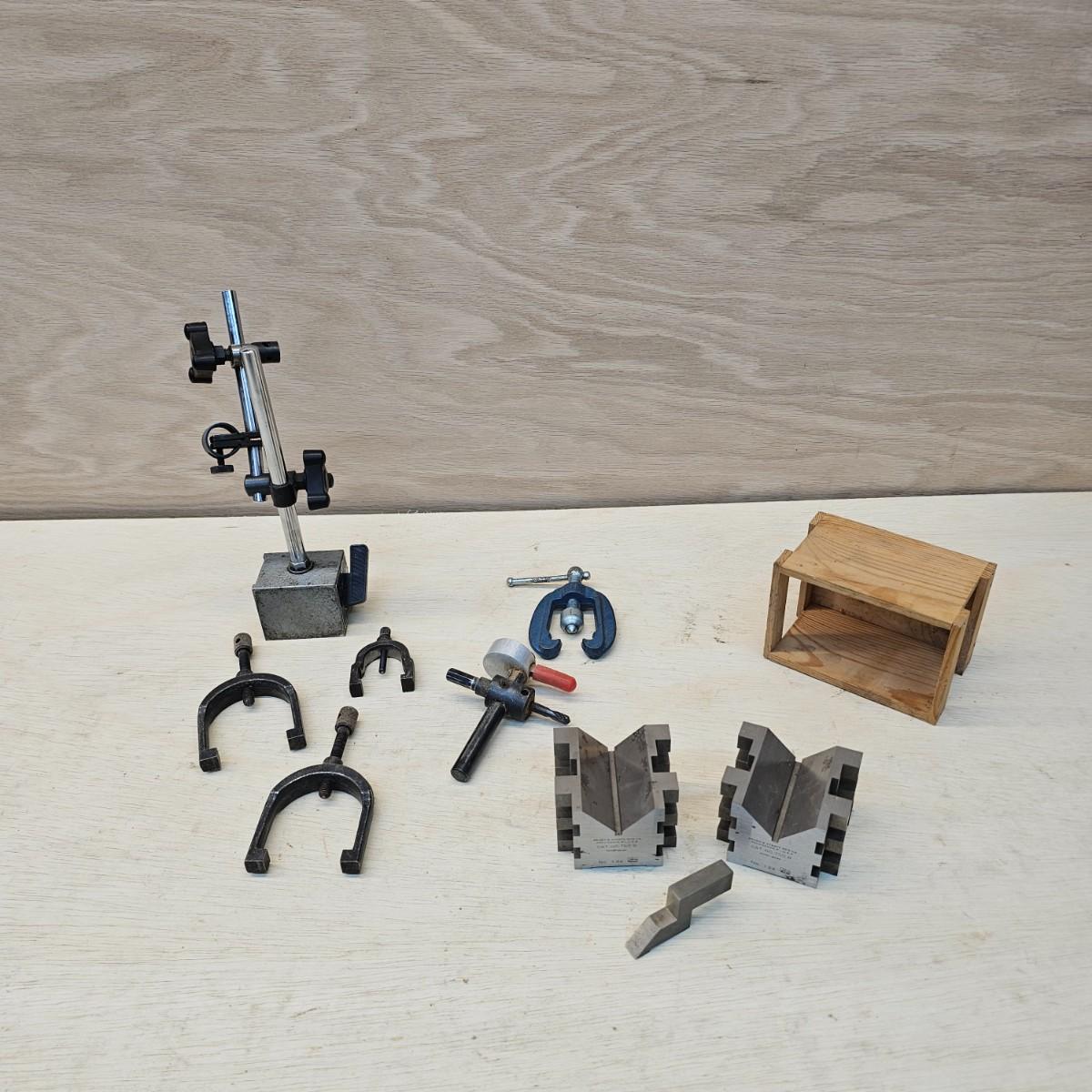 V-blocks for holding irregular pieces steady while working. One pair by Browne & Sharpe in wooden storage crate, 2.75" x 2.5" x 2"H. Precision machined. Three u-shaped blocks, largest 2.5" x 5". A pipe flaring tool and a drill circle cutter. Also an adjustable measuring device with on/off magnetic base, 1.5" x 3" x 9"H. See photos for details. Shipping available.