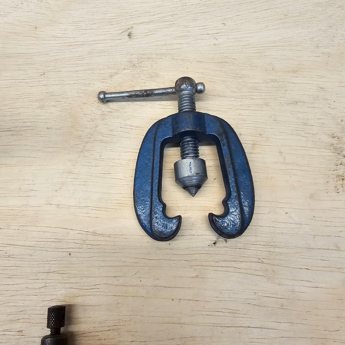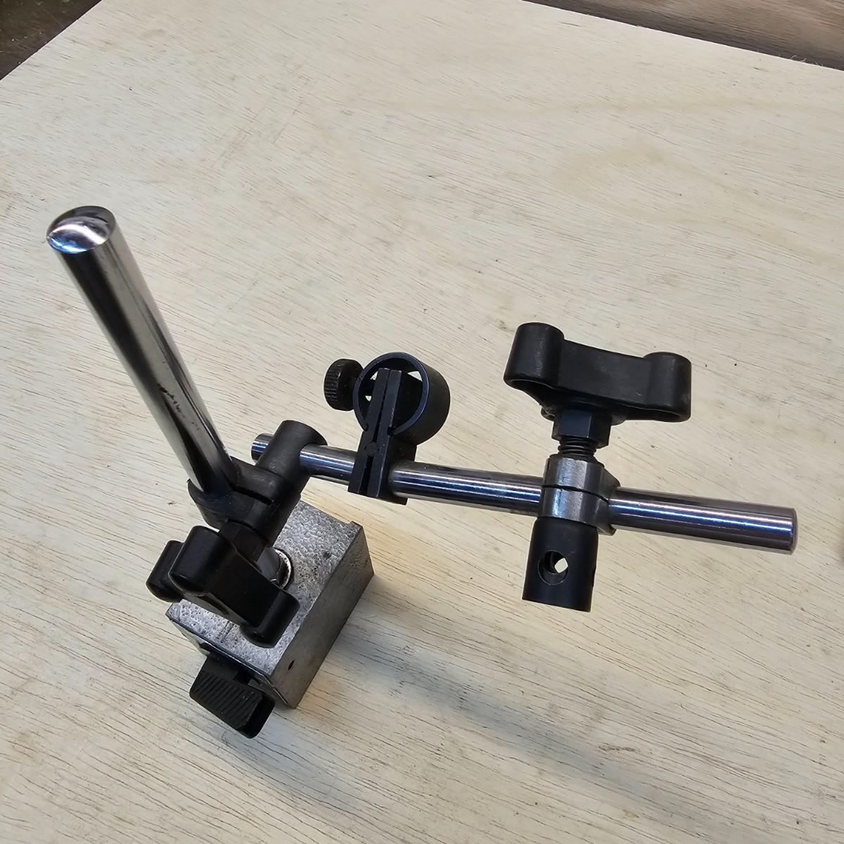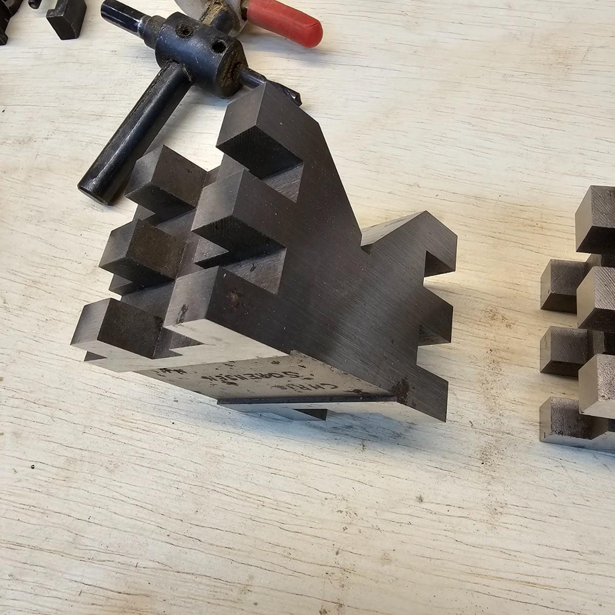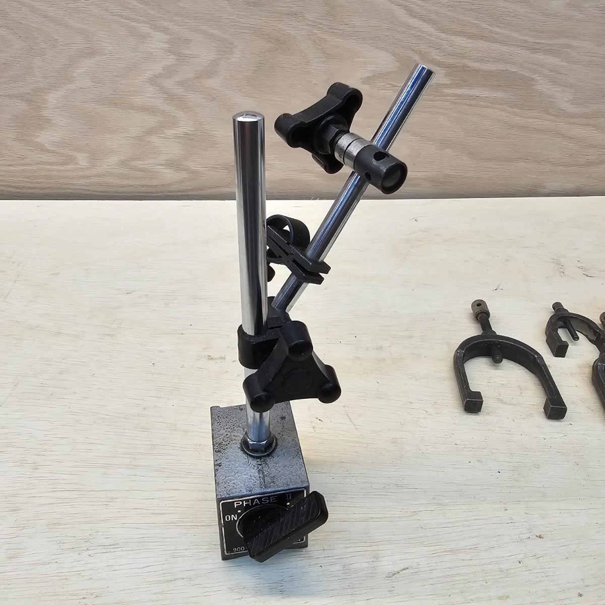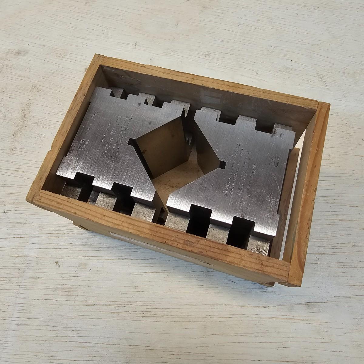 V-blocks for holding irregular pieces steady while working. One pair by Browne & Sharpe in wooden storage crate, 2.75" x 2.5" x 2"H. Precision machined. Three u-shaped blocks, largest 2.5" x 5". A pipe flaring tool and a drill circle cutter. Also an adjustable measuring device with on/off magnetic base, 1.5" x 3" x 9"H. See photos for details. Shipping available.