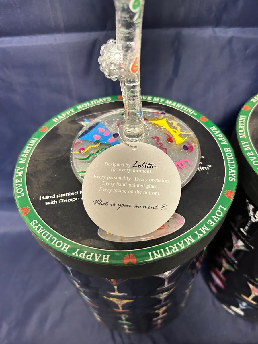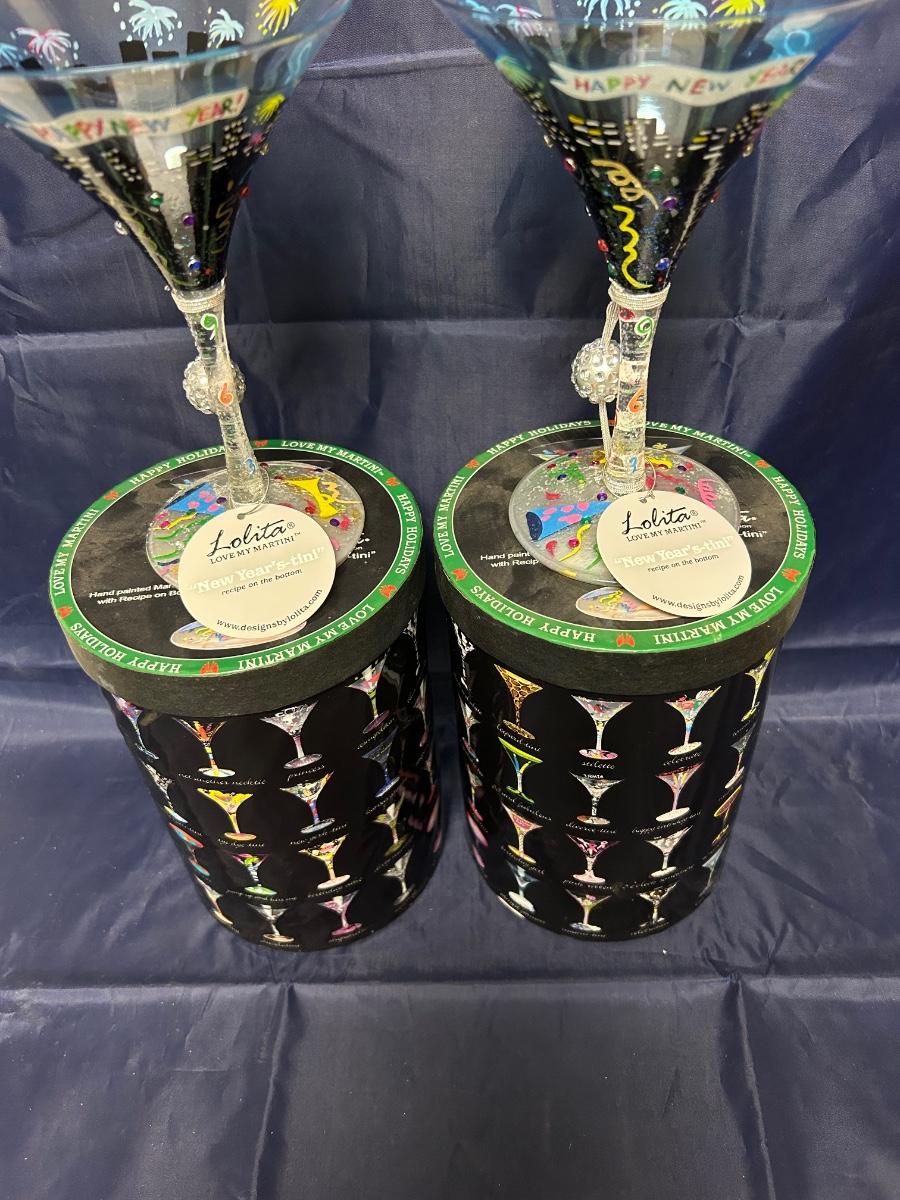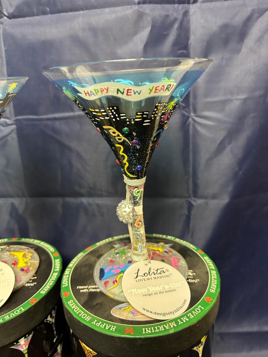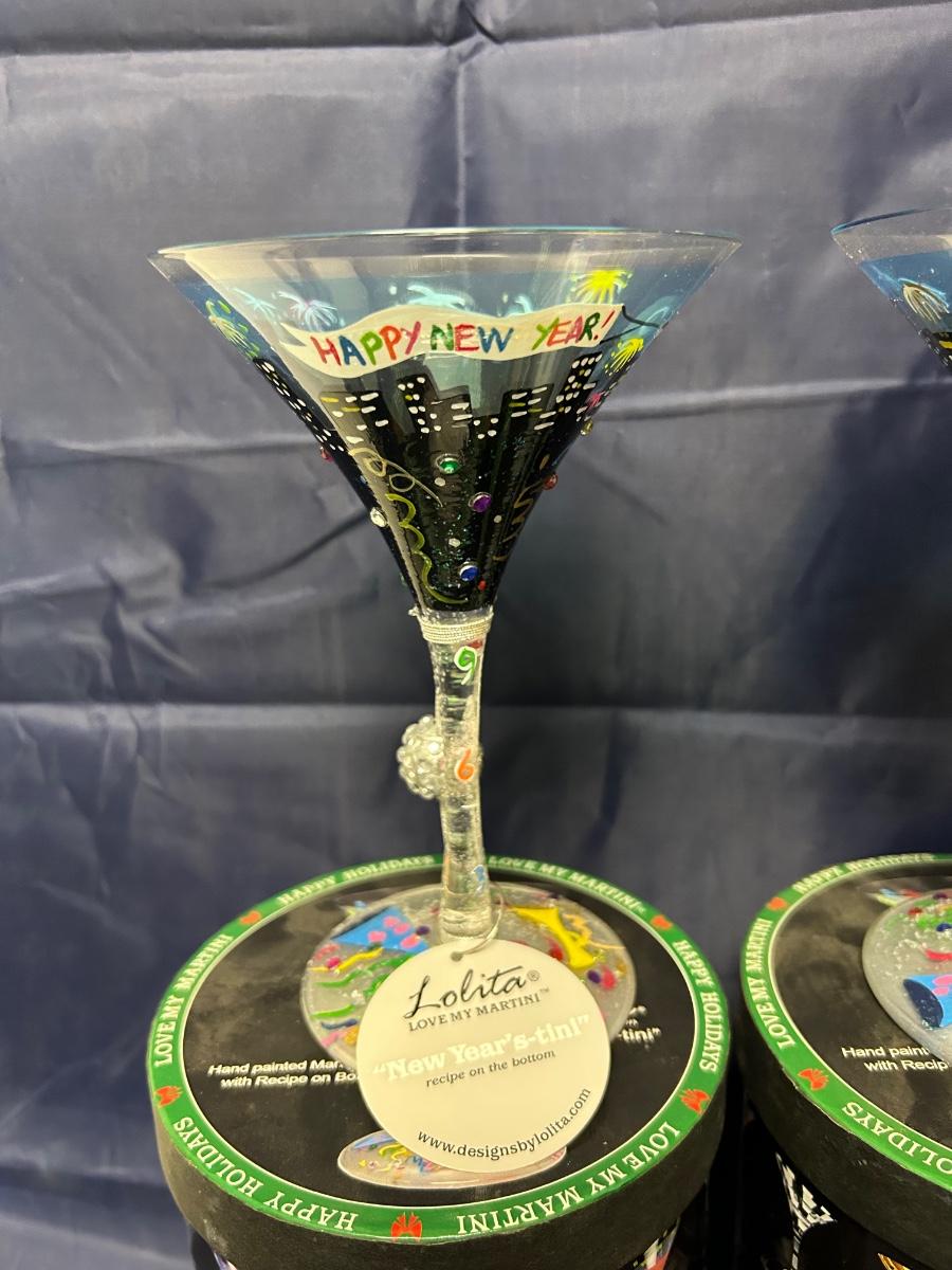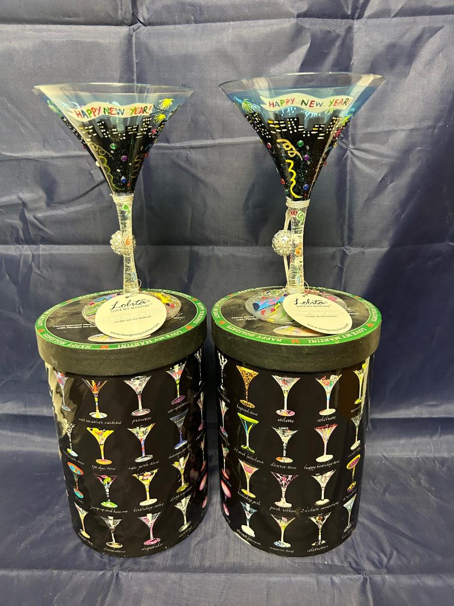 Pair of Lolita New Years Eve Martini Drink Glasses with Original Boxes. Both seem to be new with tag still attached to glass.