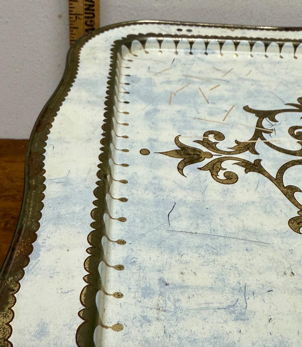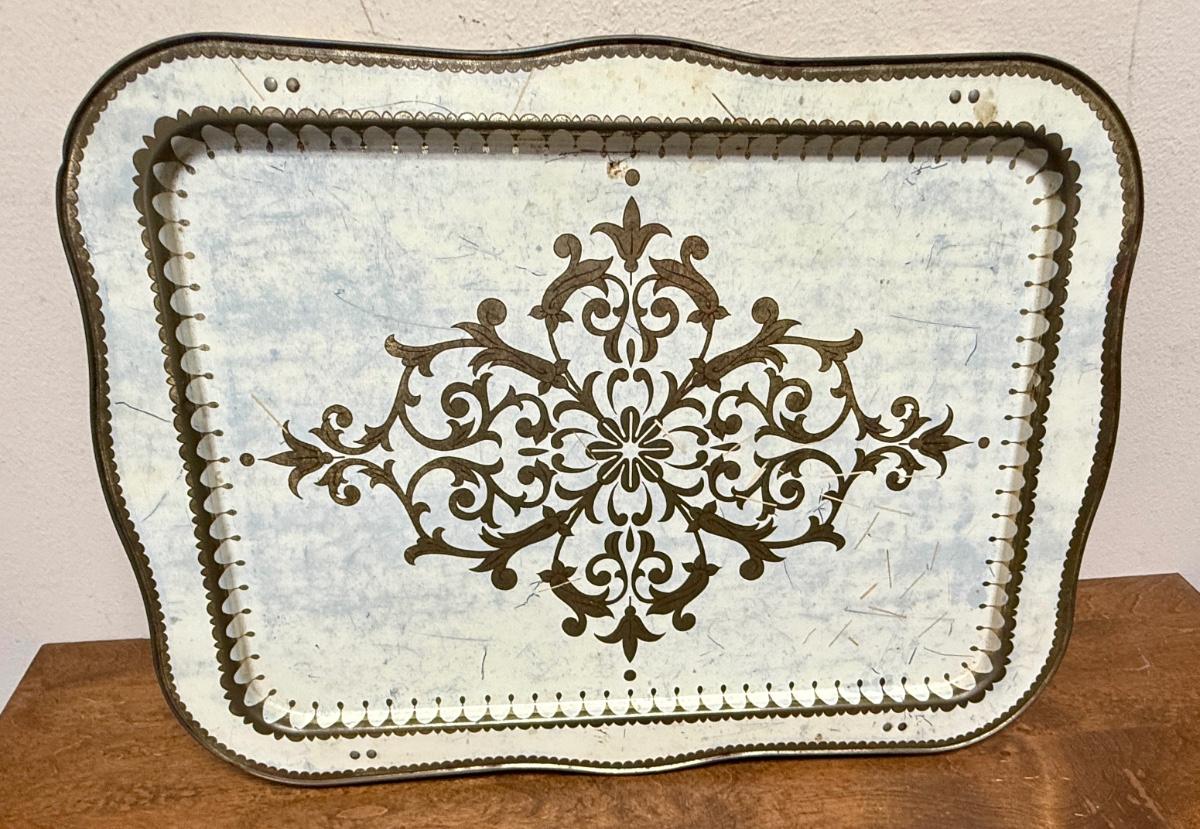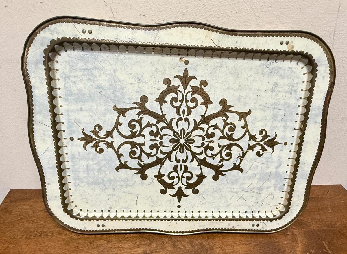 Gold-tone geometric pattern on the top surface. Good to fair condition, no damage.