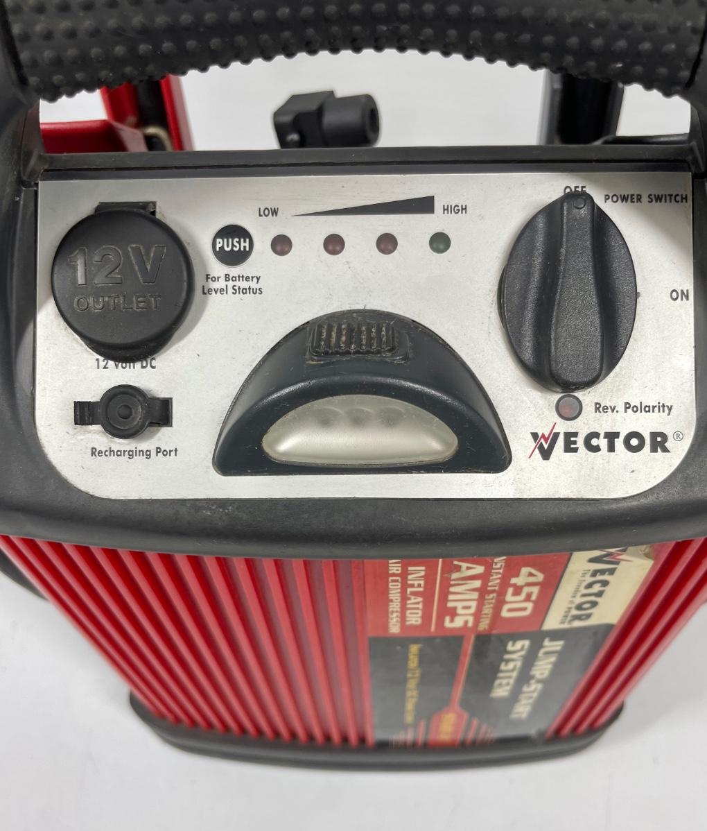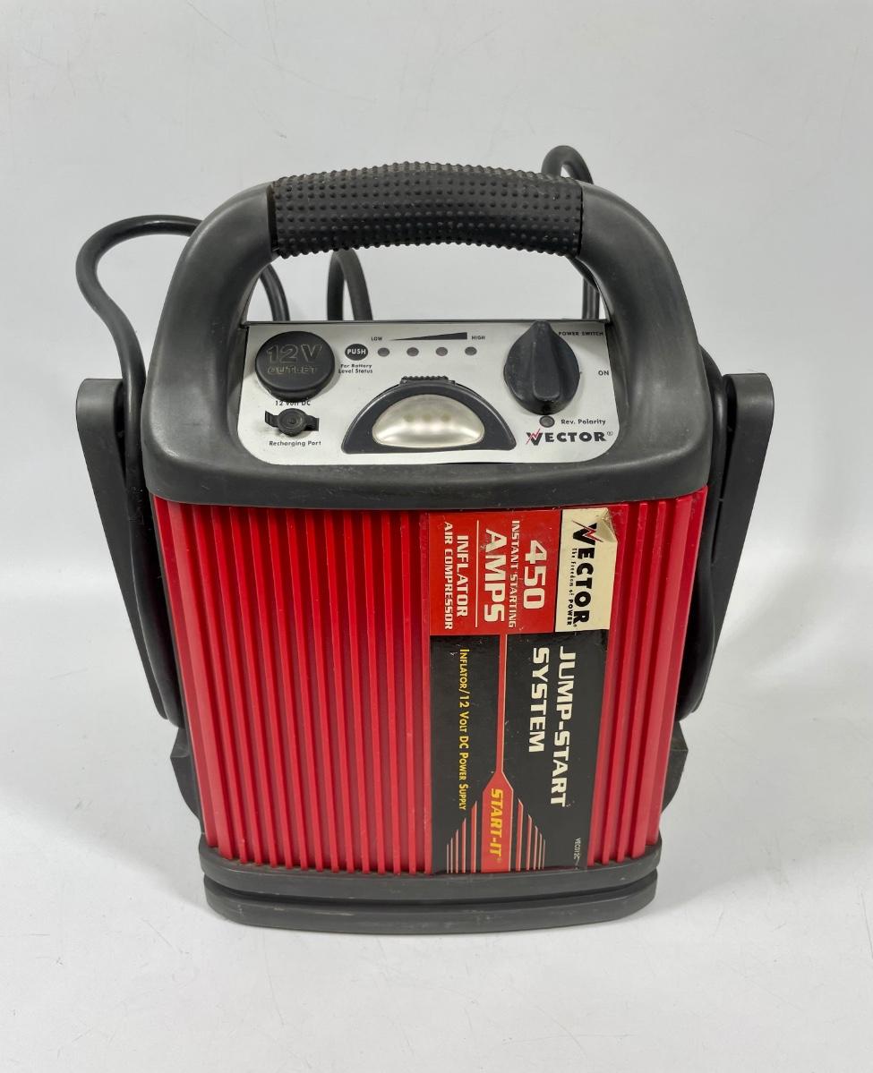 Vector 450-Amp Portable Jump Starter with 260 PSI Inflator. Untested. NOTE: Does not include wall plug in charging cord, but it is available on Amazon.