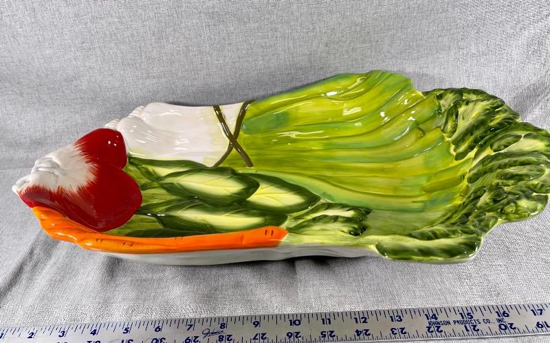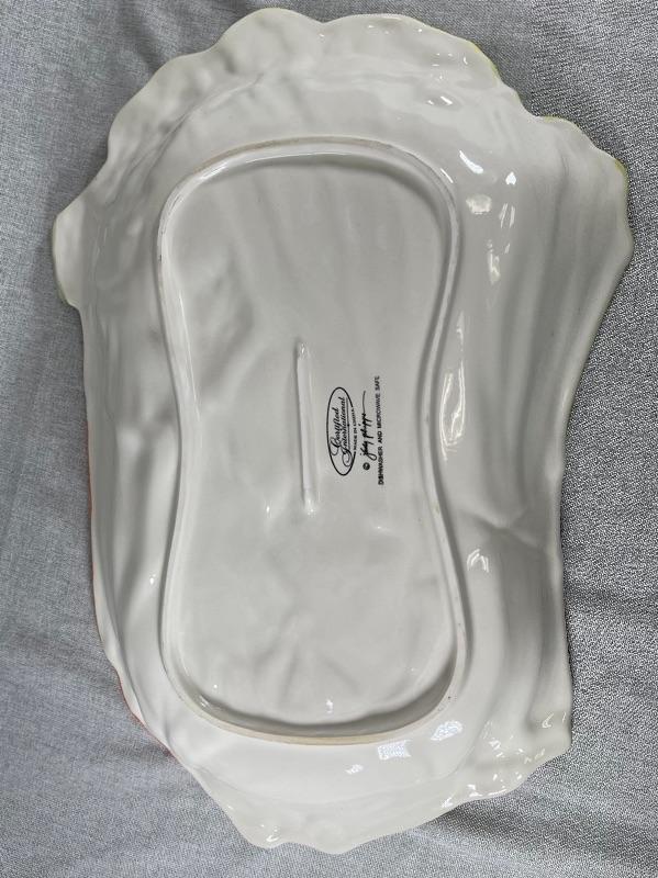 Oversized serving platter bowl in a garden vegetable design from Judy Phipps for Certified International. Almost 20" length. Good condition.
