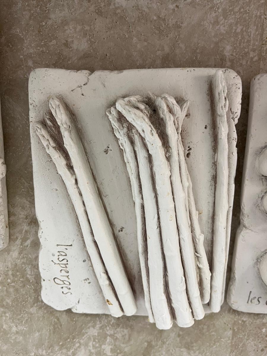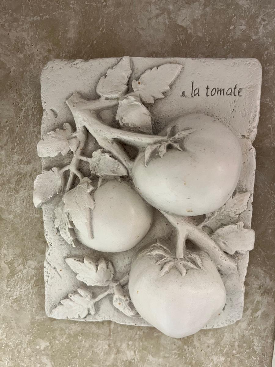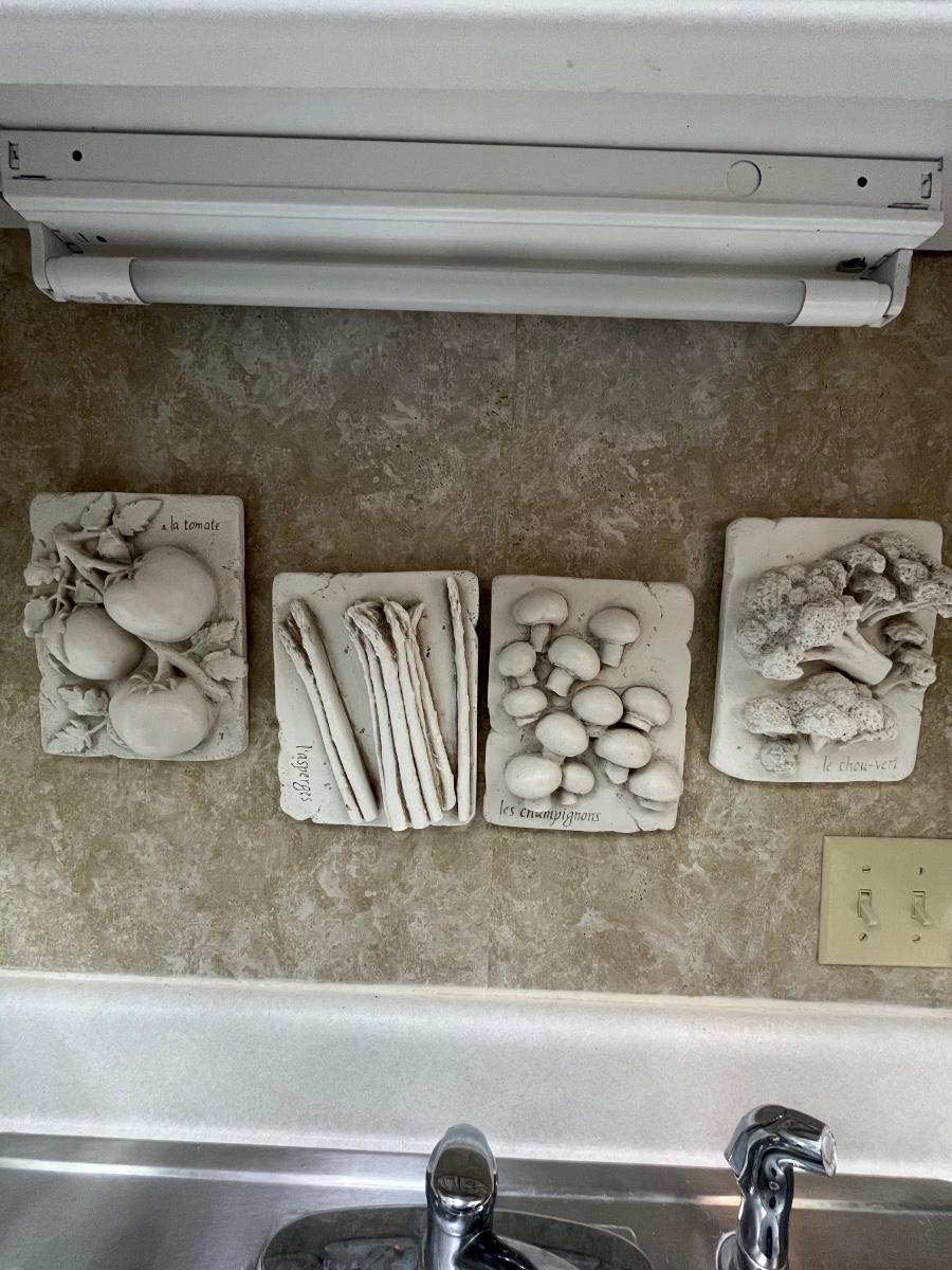 Lot includes four pieces of vegetable artwork with the name in French. Pieces measure 7” x 9” and are made of a lightweight resin like material.