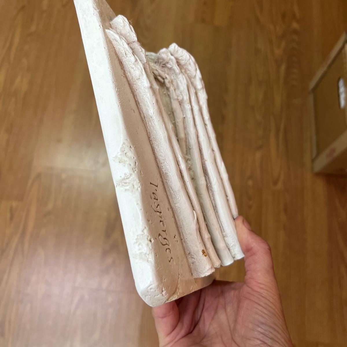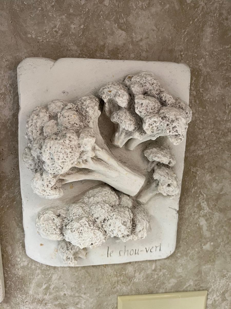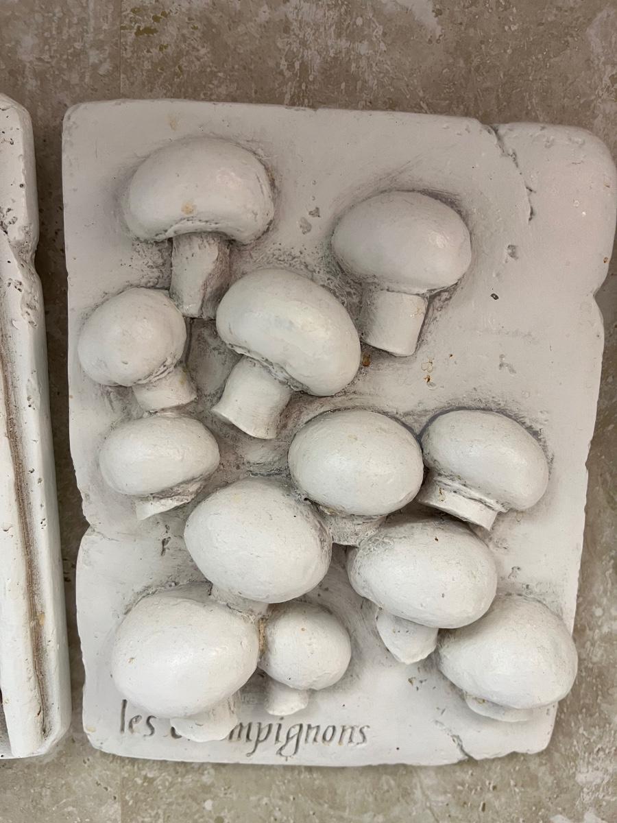 Lot includes four pieces of vegetable artwork with the name in French. Pieces measure 7” x 9” and are made of a lightweight resin like material.