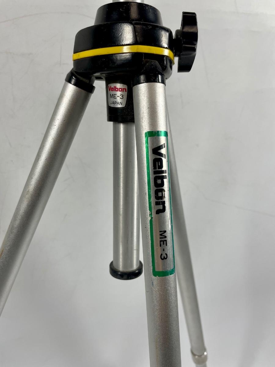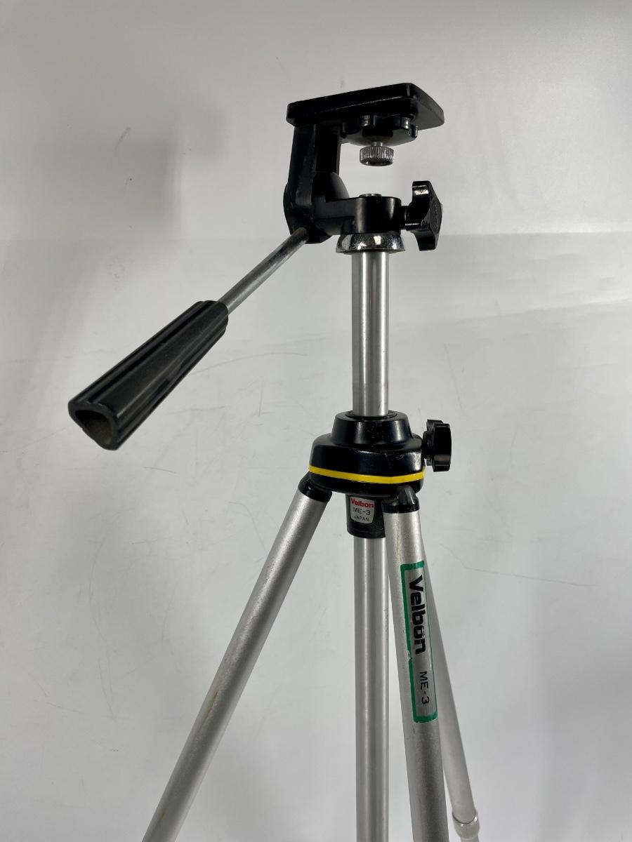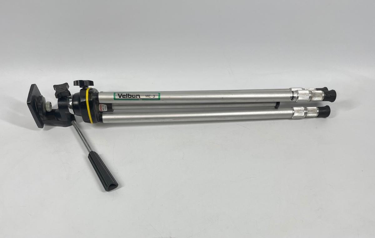 Velbon ME-3 Camera tripod with aluminum telescoping legs. Made in Japan. Collapsed size is 22” long, maximum height when fully extended is 57”.