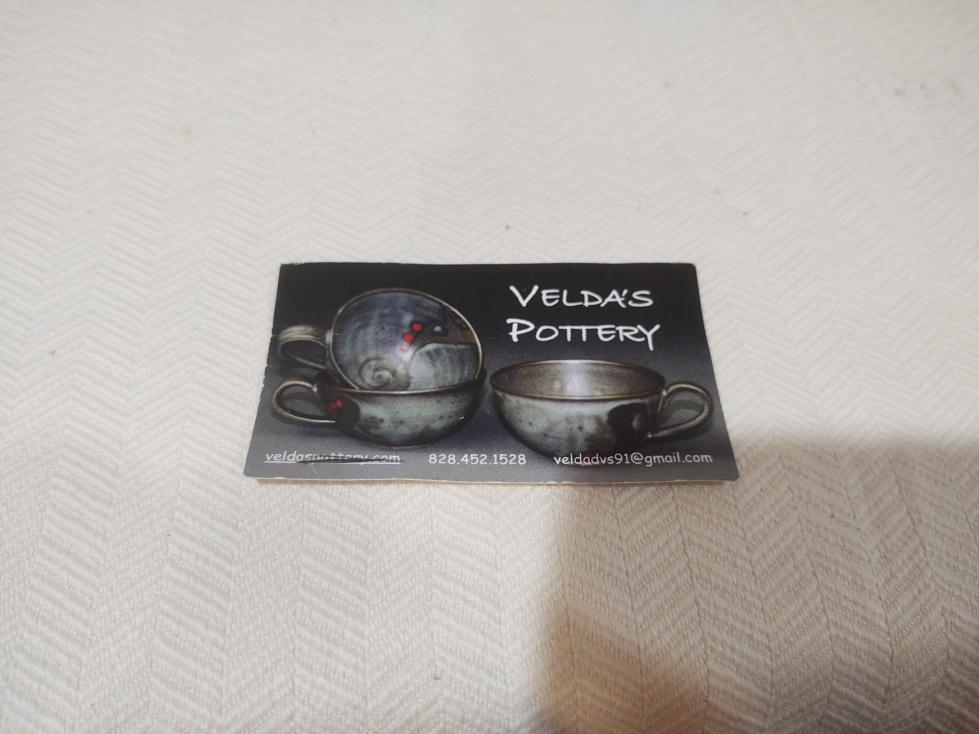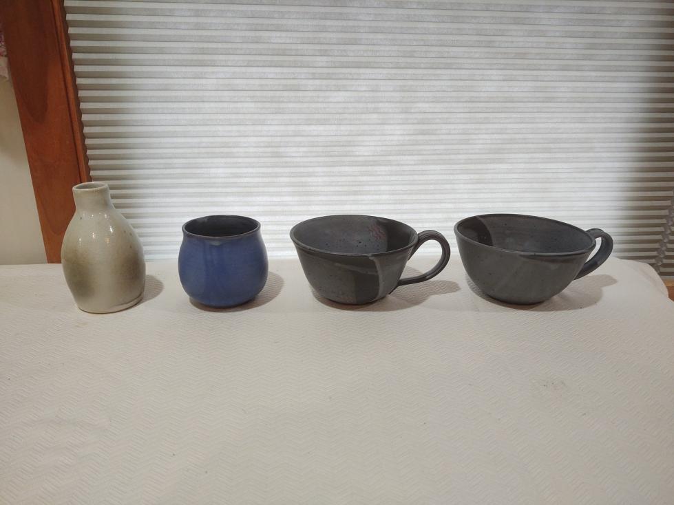 Made at Velda's Pottery . First piece on the left is 6"x4". Second piece is 5.5" tall. The two bowls are 3.5"x4".