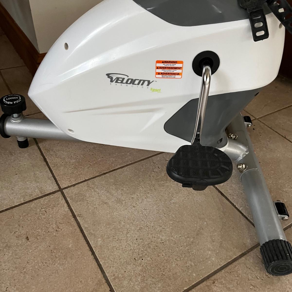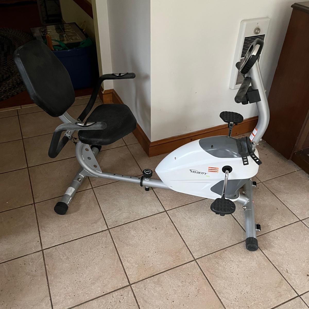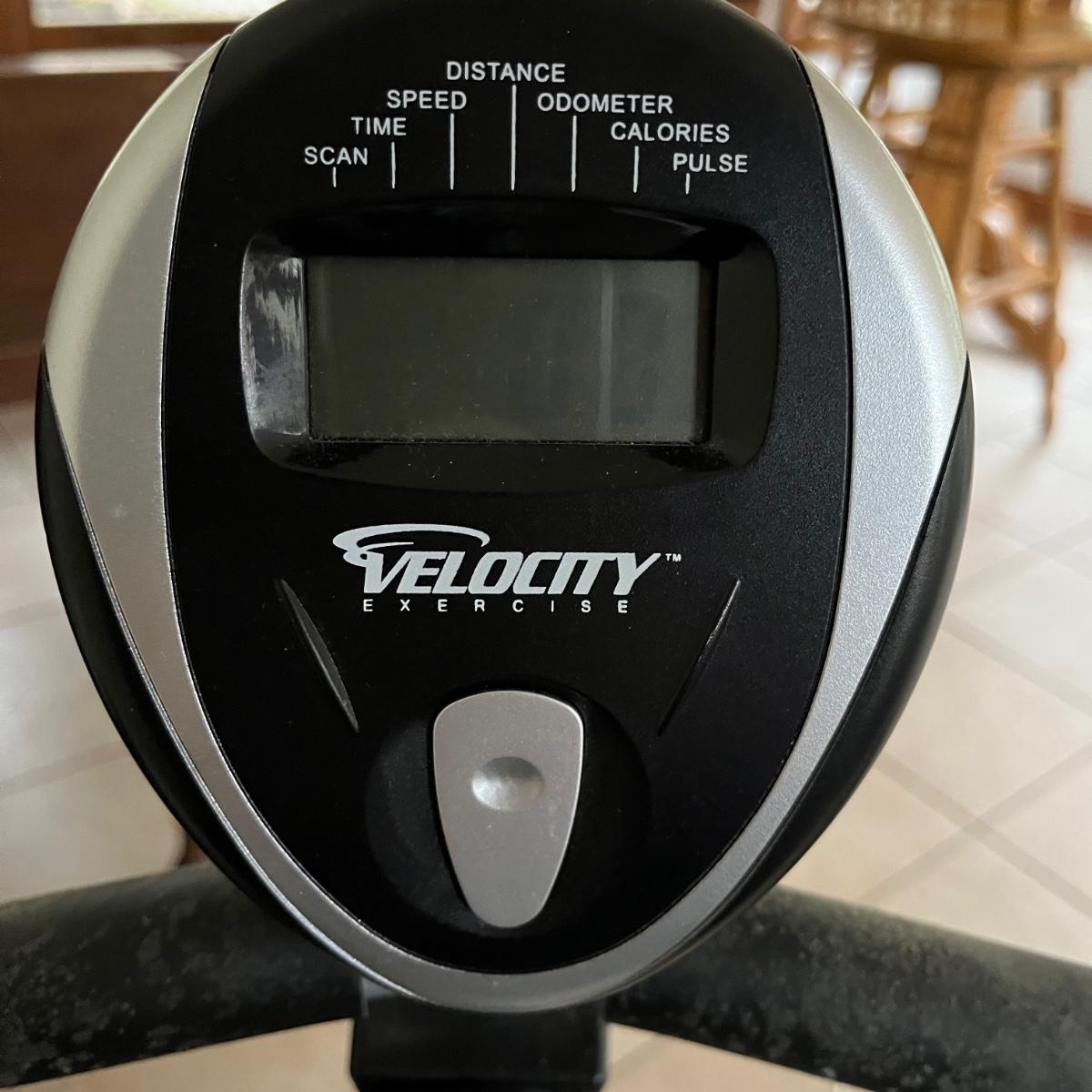This exercise machine is a Velocity recumbent Sport exercise bicycle. Display appears to need new battery. Bicycle measures 23.5” x 48” x 37”.