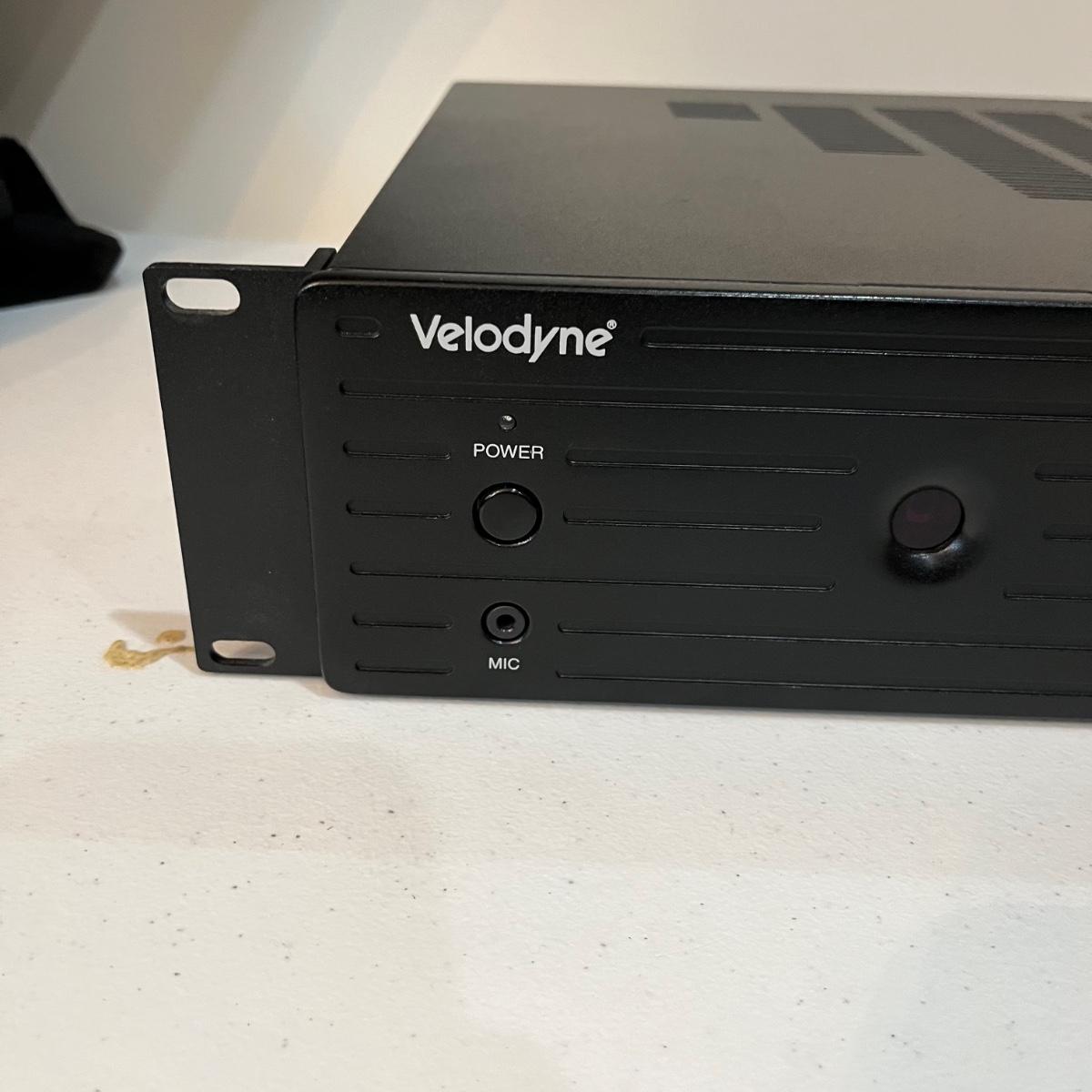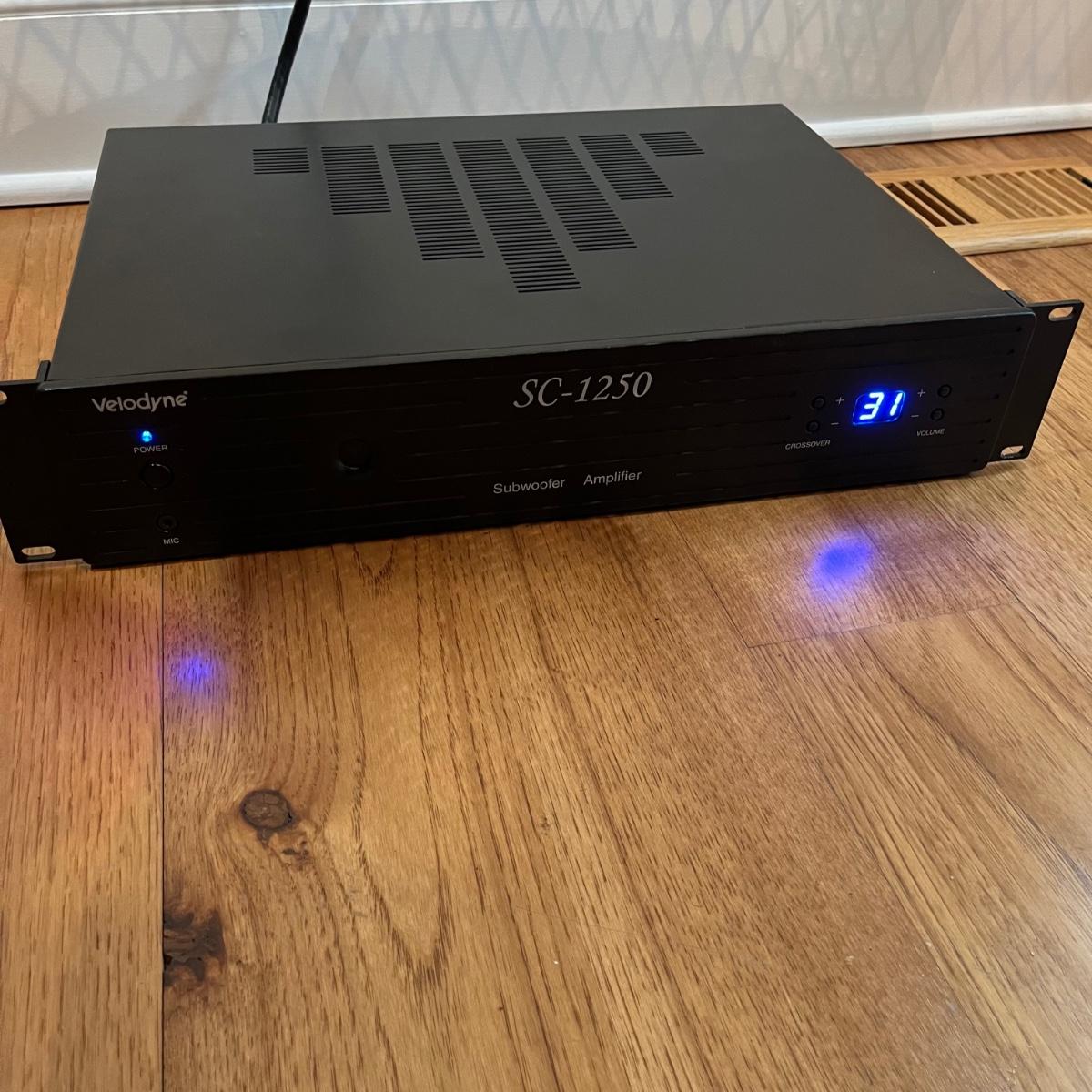Lot includes a Velodyne Subwoofer Amplifier model # SC-1250. Machine powered on when plugged in. Machine measures 19” x 12” x 3.5”.
