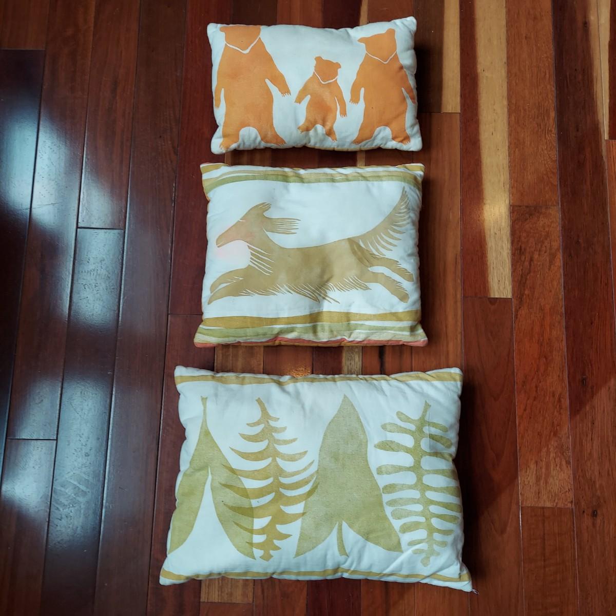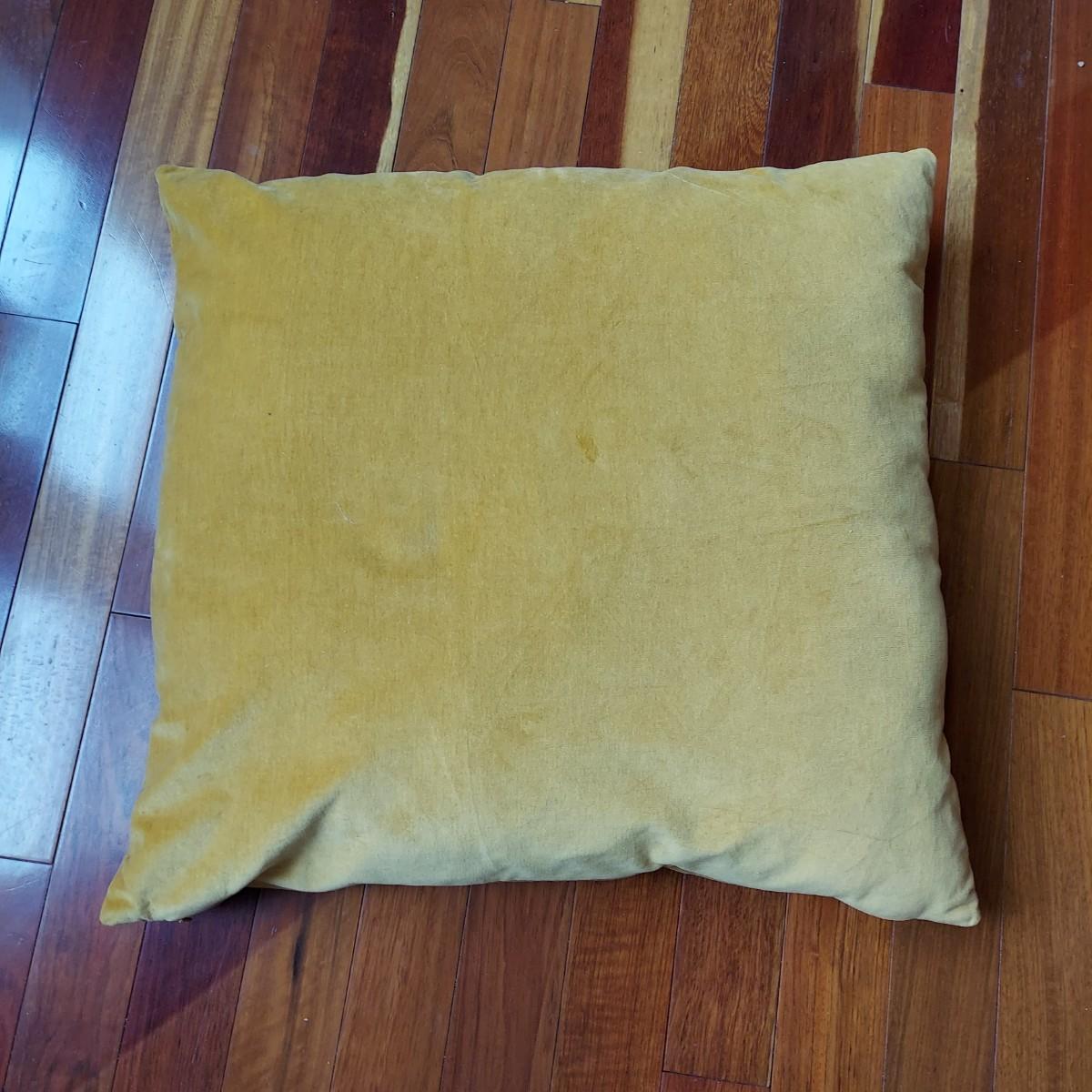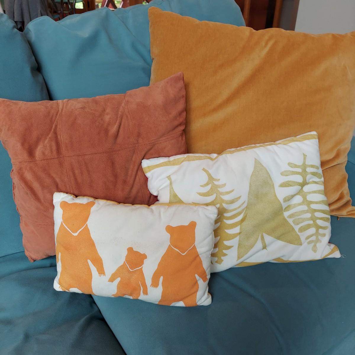 Five throw pillows in shades of rust and gold. The large gold velour pillow is 22 x 24". The medium sized rust coloted micro fiber pillow is 17 x 18". The small printed pillows are various sizes 12-16" long. The small pillows need cleaned. Please see photos. These items are from a pet owned home. Shipping available. Shipping certain items can be costly. We suggest contacting our preferred local shipping provider, Postage Express, with dimensions and getting an estimate before bidding: (828) 670-5501 or postageexpress@yahoo.com.