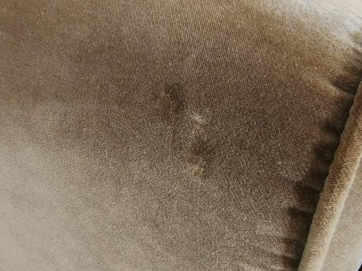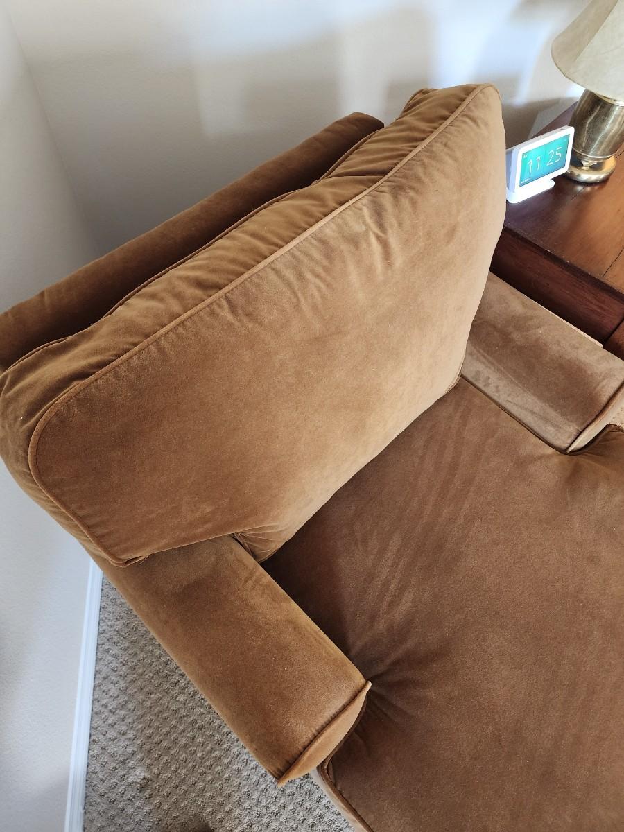 Beautiful and comfortable, Very clean, but for some cat hair. Needs to be brushed off. One small spot (about 1.5") on right arm which we have not attempted to clean.