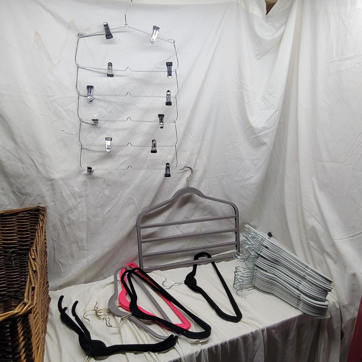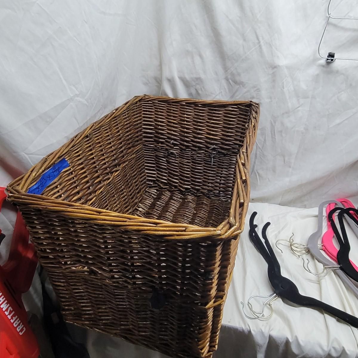 Hangers look unused, as does wicker basket, measurements for basket in photo