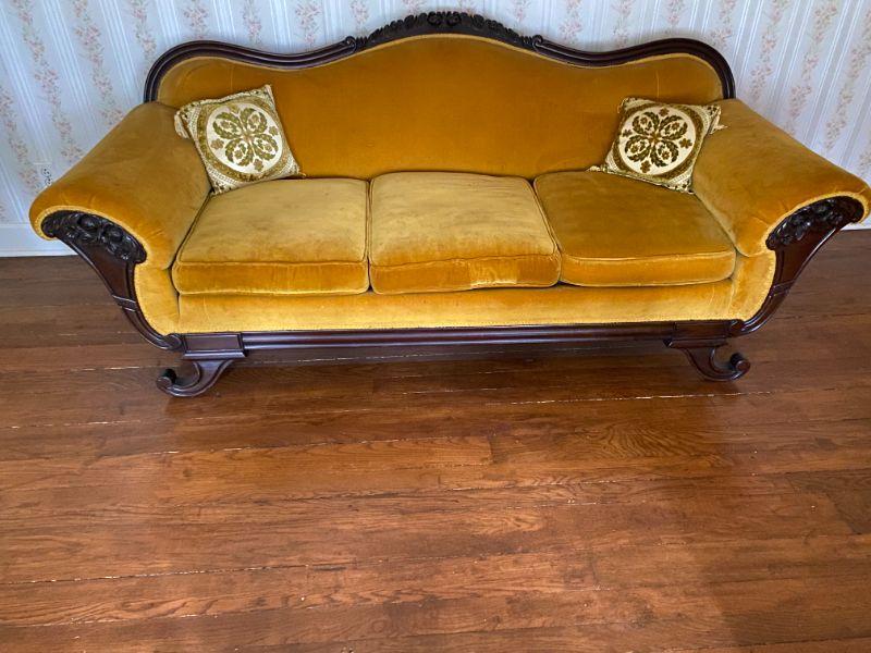 Mustard Yellow velvet sofa, 82x32x34.5T