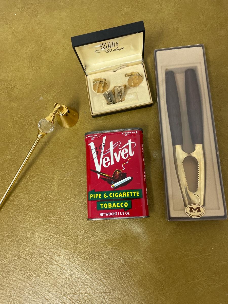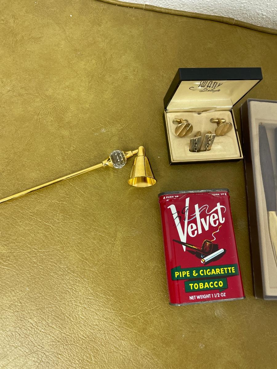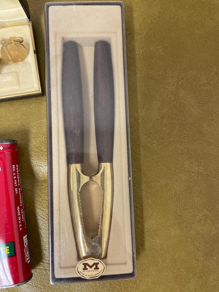 Writing on can, brass snuffer, cufflinks and nutcracker