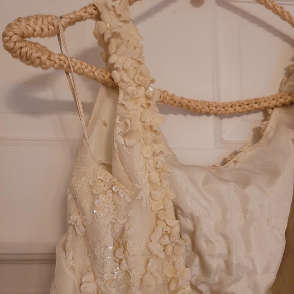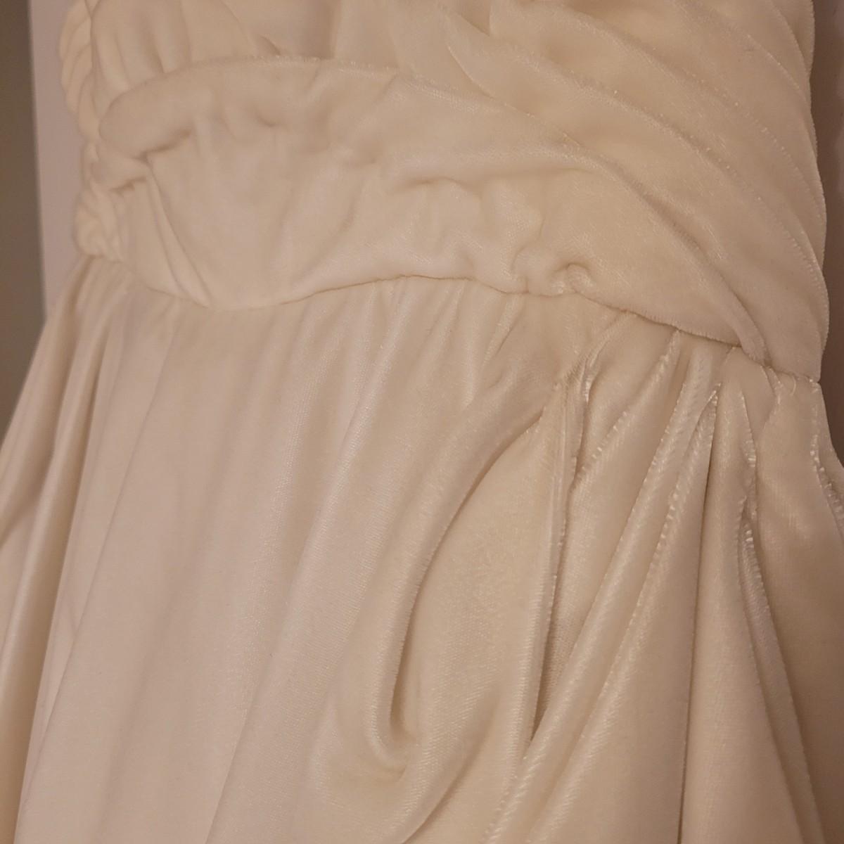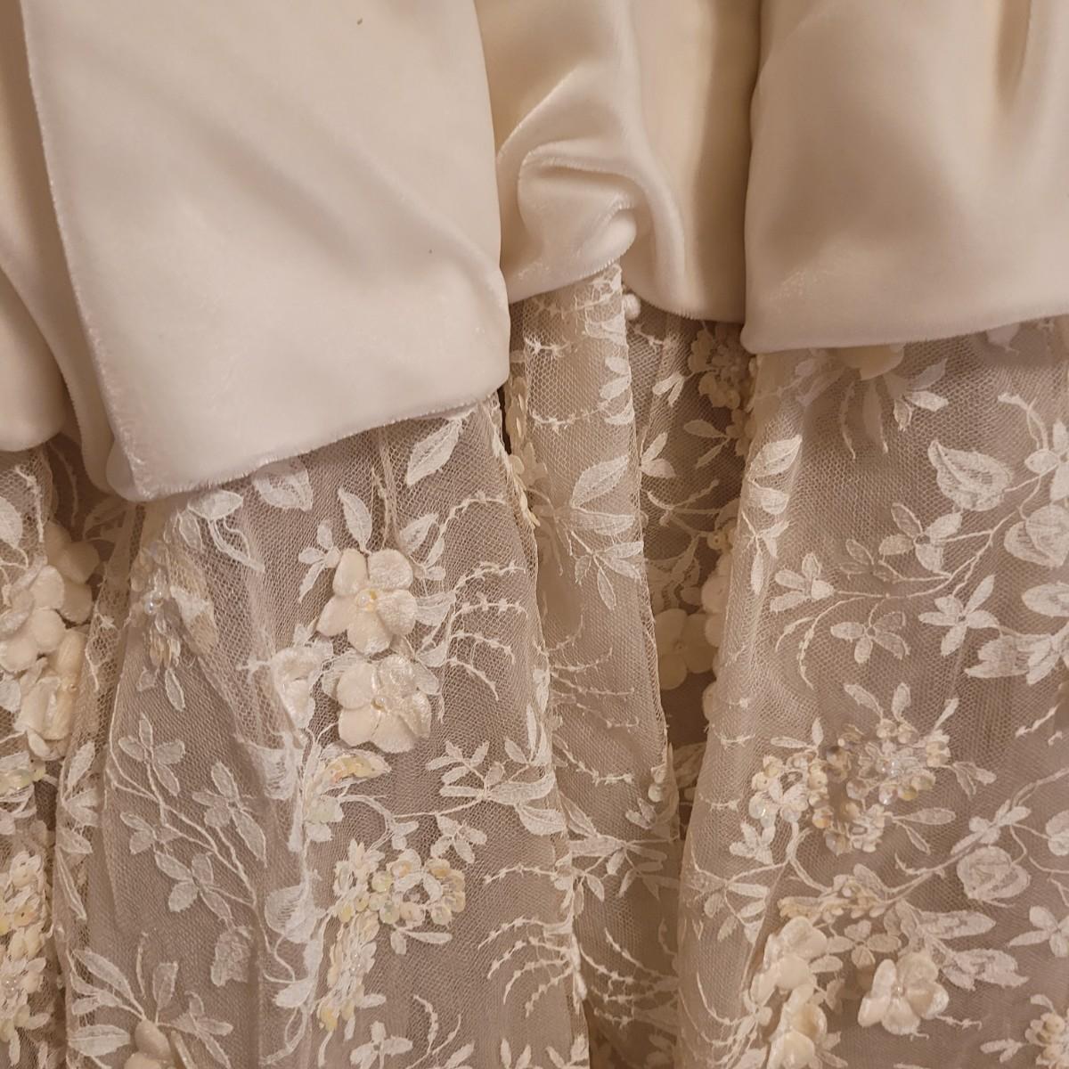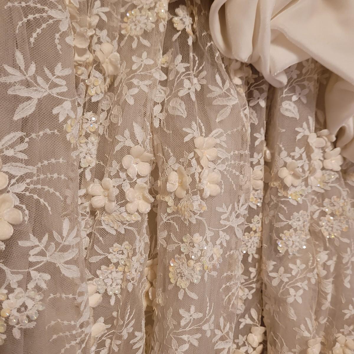 This beautiful, luxurious velveteen wedding-like gown has embroidered floral tulle with sequins at the neckline and hemline. Bust measures approximately 24”, waist 27”, and 60” length measured from top of shoulder strap to bottom hem. Shipping available.