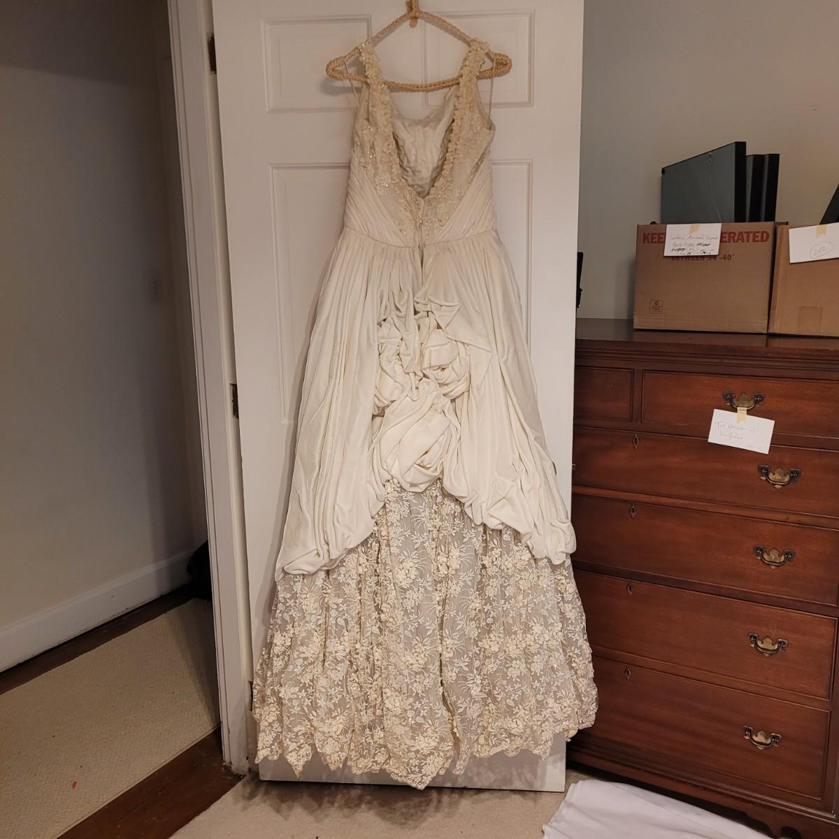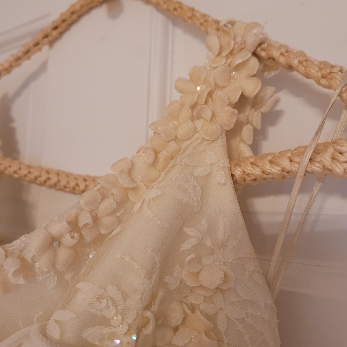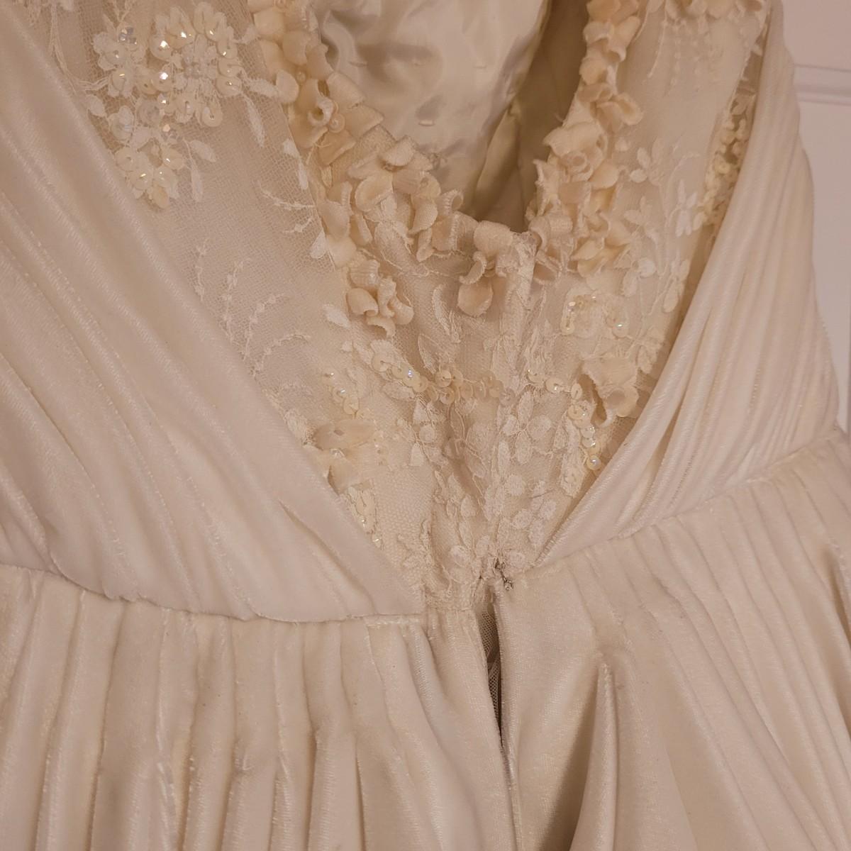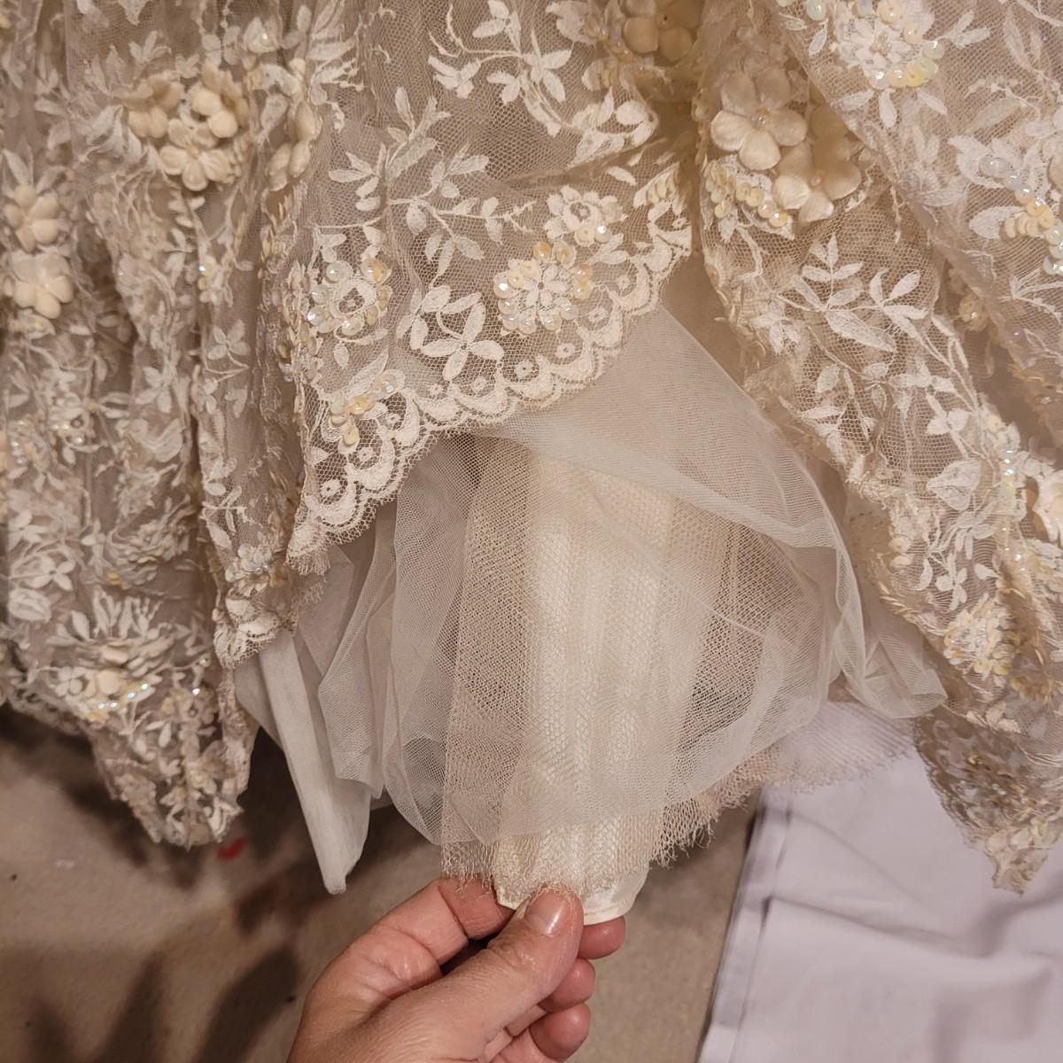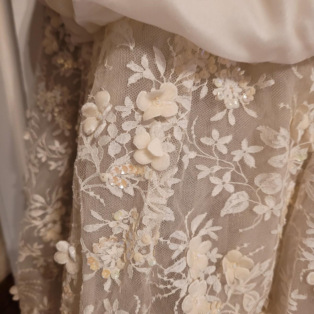 This beautiful, luxurious velveteen wedding-like gown has embroidered floral tulle with sequins at the neckline and hemline. Bust measures approximately 24”, waist 27”, and 60” length measured from top of shoulder strap to bottom hem. Shipping available.