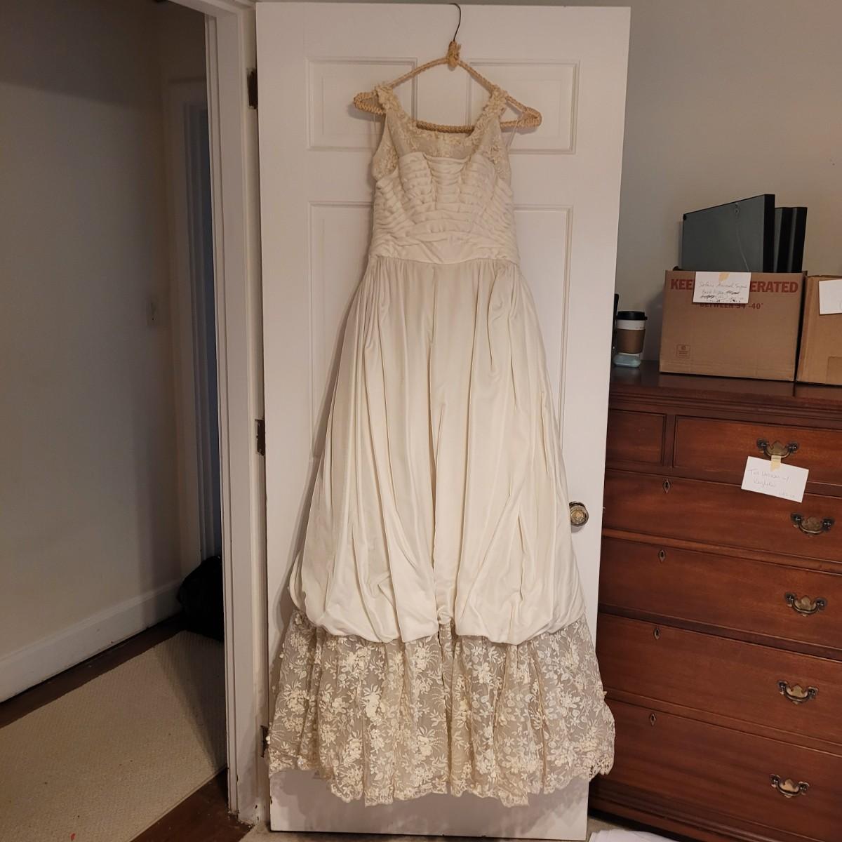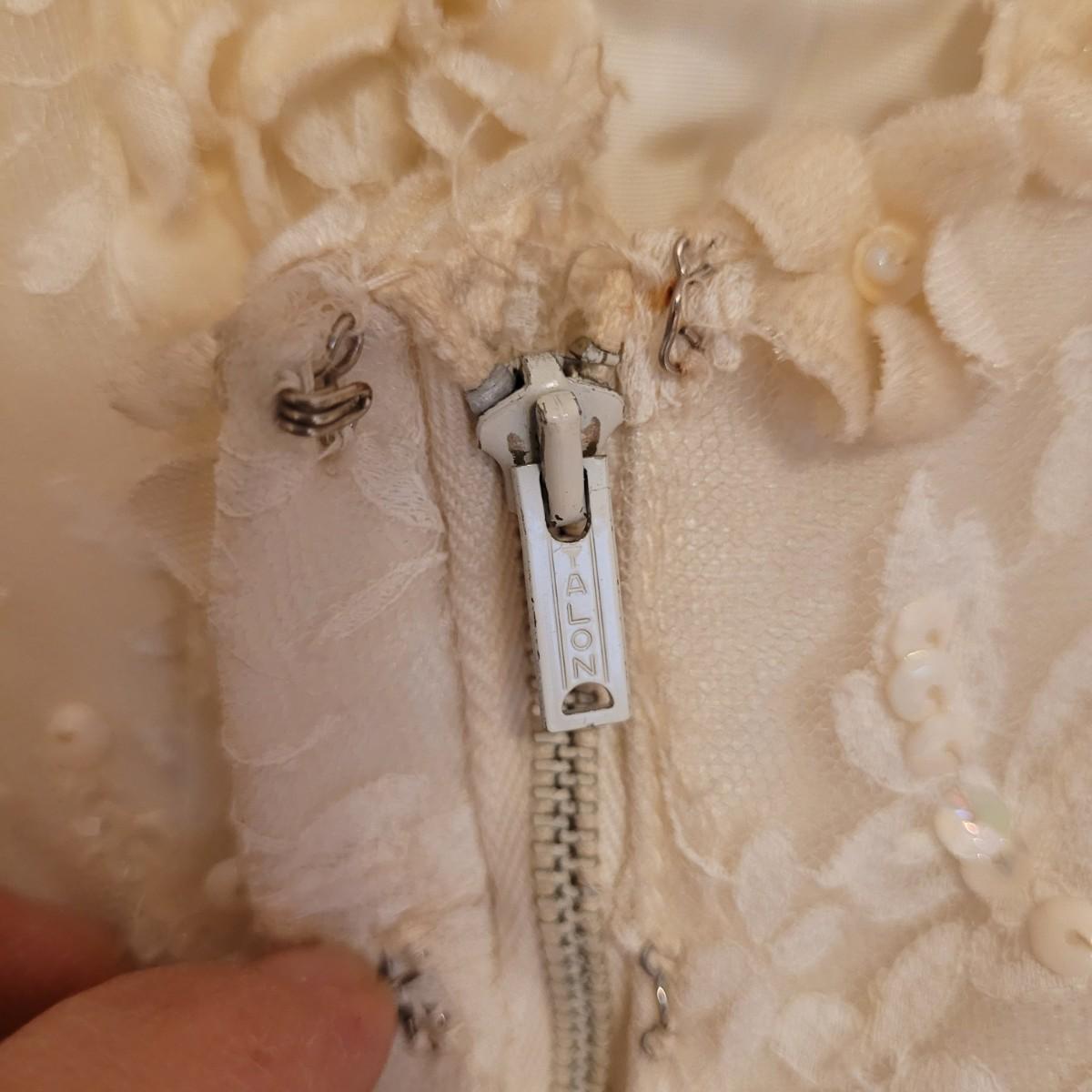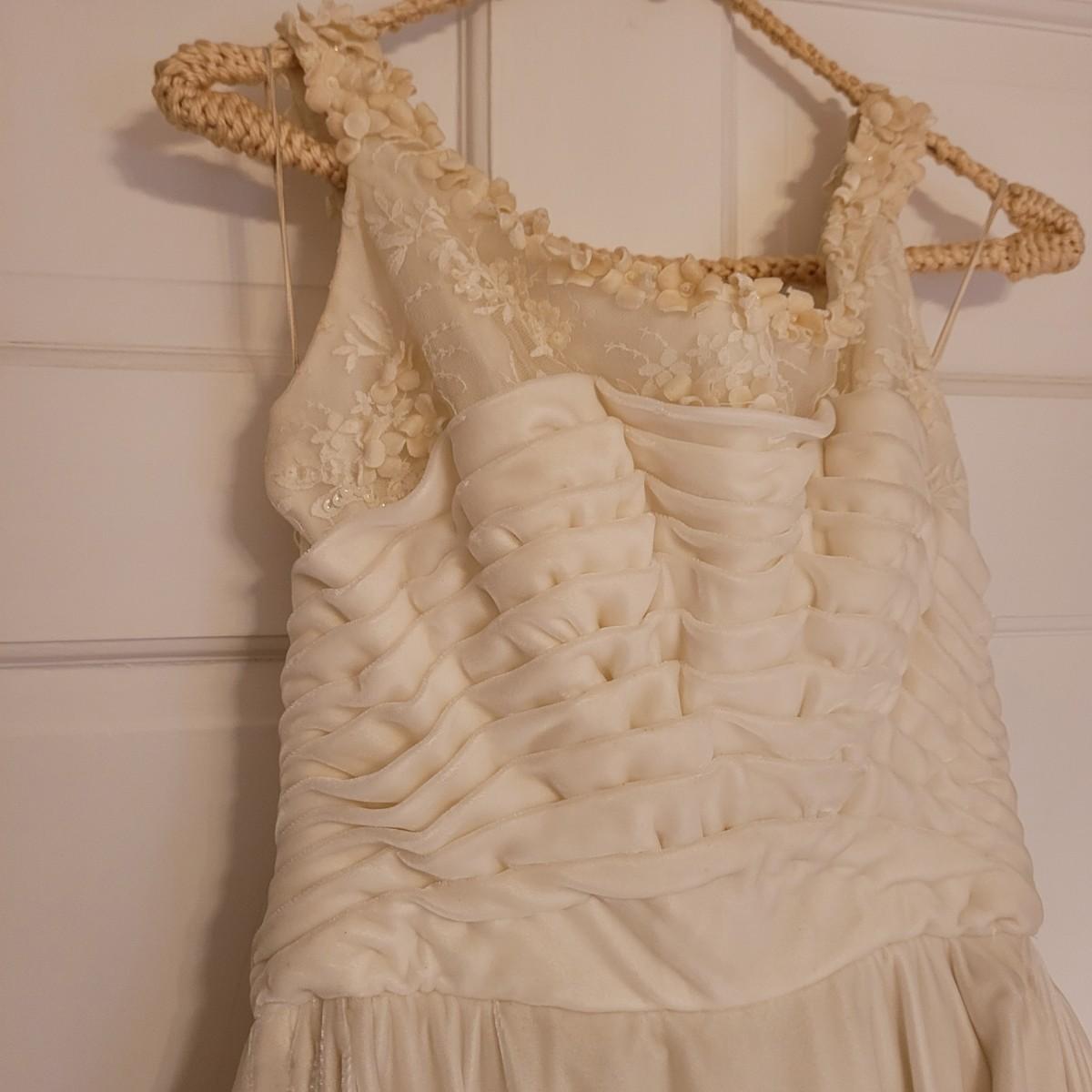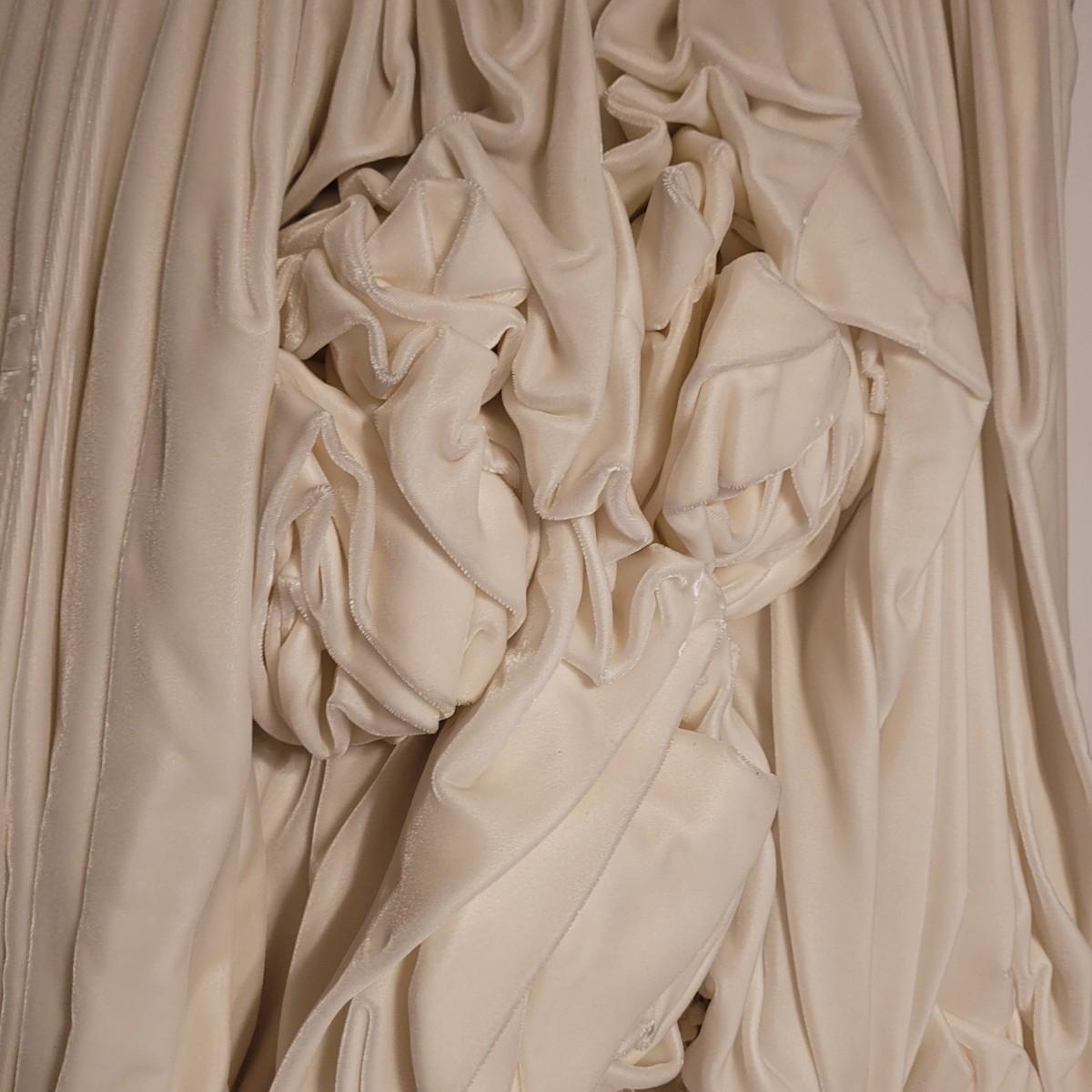 This beautiful, luxurious velveteen wedding-like gown has embroidered floral tulle with sequins at the neckline and hemline. Bust measures approximately 24”, waist 27”, and 60” length measured from top of shoulder strap to bottom hem. Shipping available.