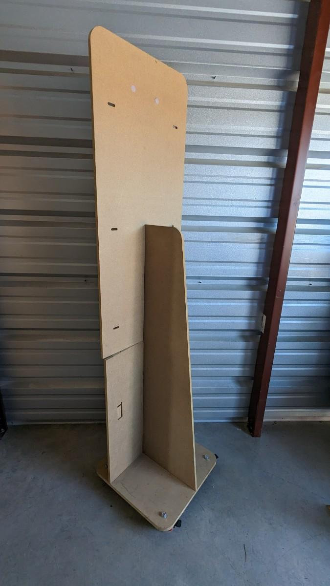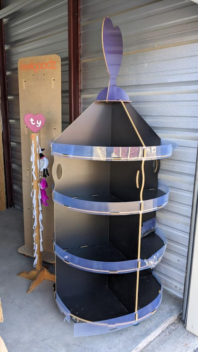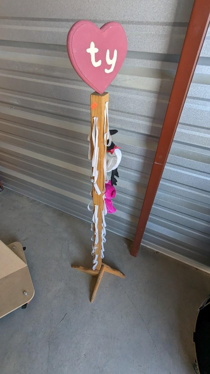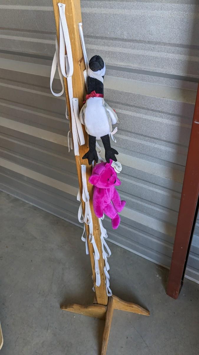 71.5" tall x 18" wide particle board FeelGoodz brand rolling board, that is collapsible with locking wheels, good for hanging small artwork or use the platform alone. Homemade 53.5" TY Beanie Baby tree (Beanie babies not included), some elastics have been repaired or are missing. As well as 77" tall, 16 compartment, former TY cradle on wheels, plastic guards have seen better days with a couple missing, all in all a great piece still, rolls very well, with a face lift it would be perfect. No shipping. 2616
