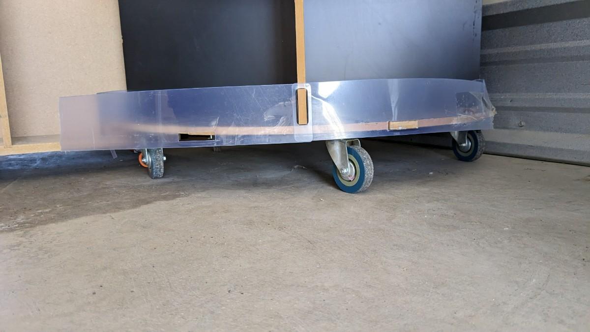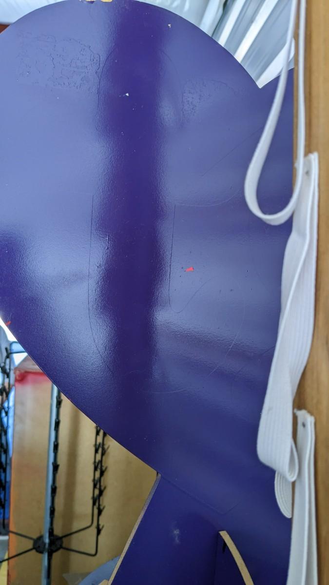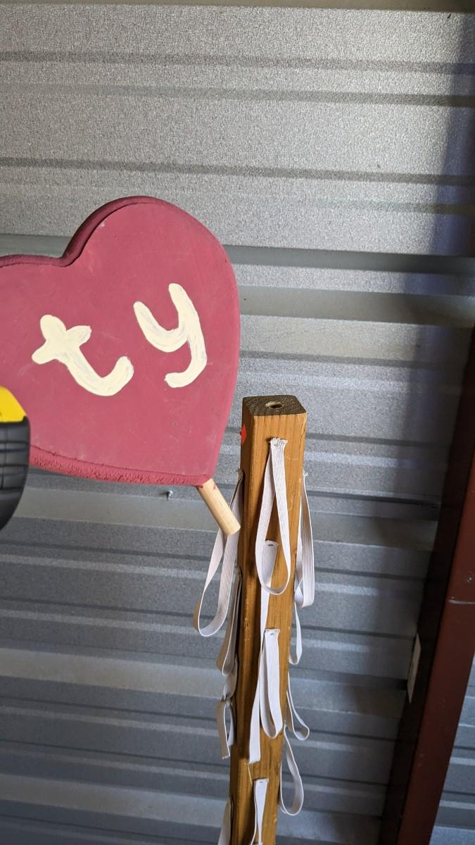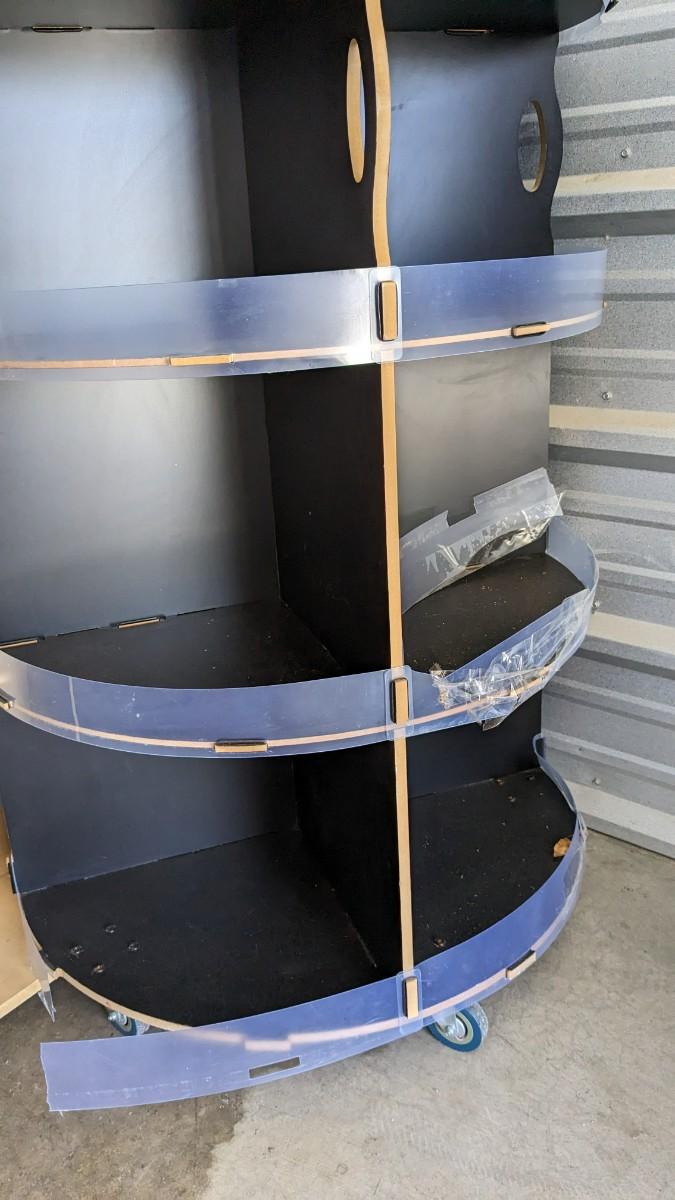 71.5" tall x 18" wide particle board FeelGoodz brand rolling board, that is collapsible with locking wheels, good for hanging small artwork or use the platform alone. Homemade 53.5" TY Beanie Baby tree (Beanie babies not included), some elastics have been repaired or are missing. As well as 77" tall, 16 compartment, former TY cradle on wheels, plastic guards have seen better days with a couple missing, all in all a great piece still, rolls very well, with a face lift it would be perfect. No shipping. 2616