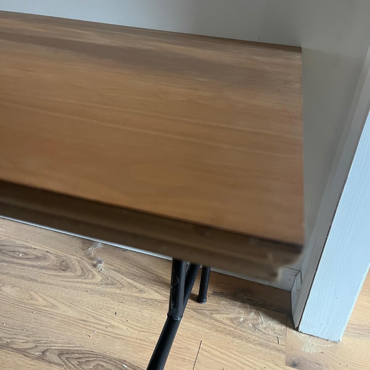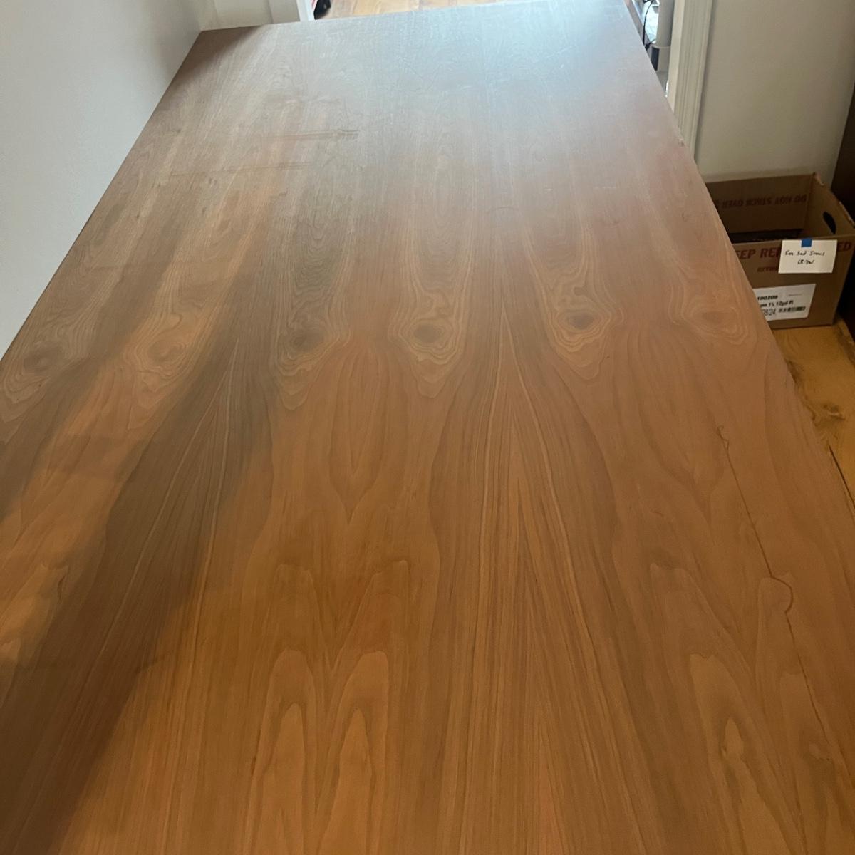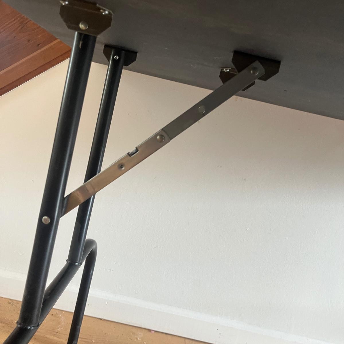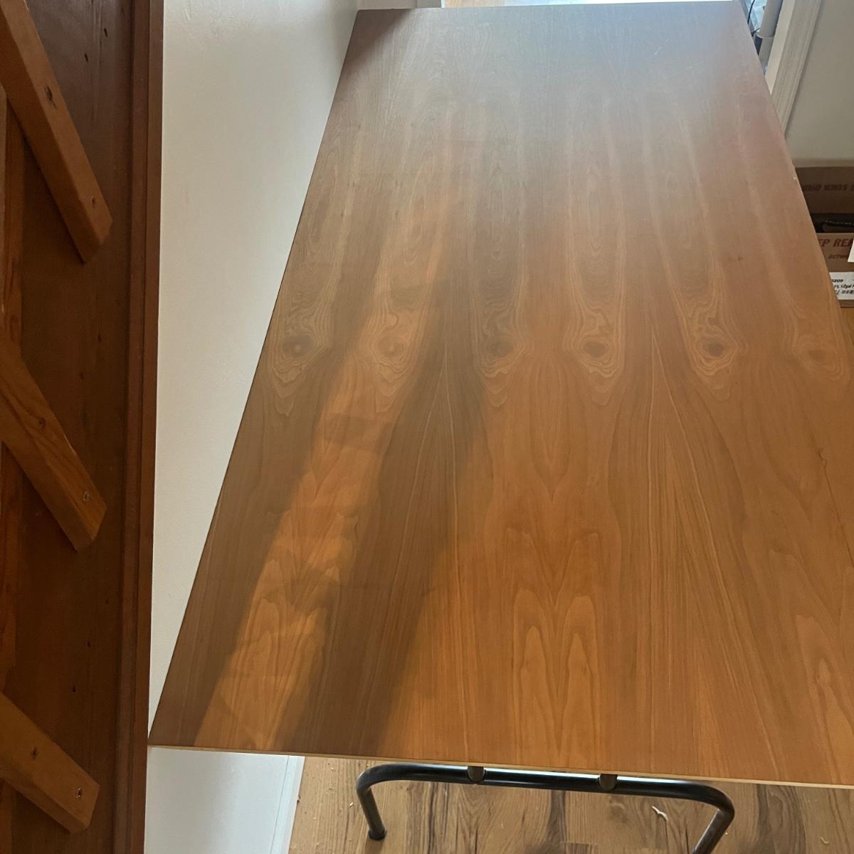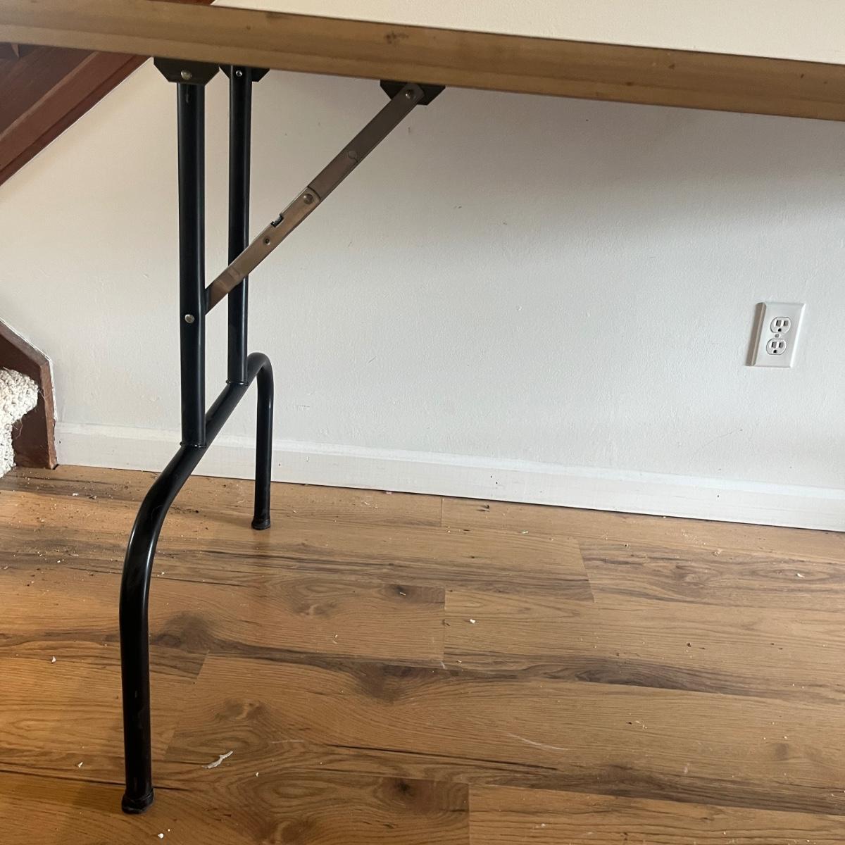 This sturdy table has a veneered top and side with folding metal legs. Table measures 36” x 72” x 30”H. It is much heavier than a standard folding table.