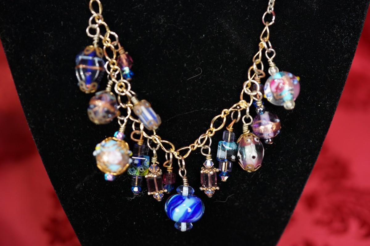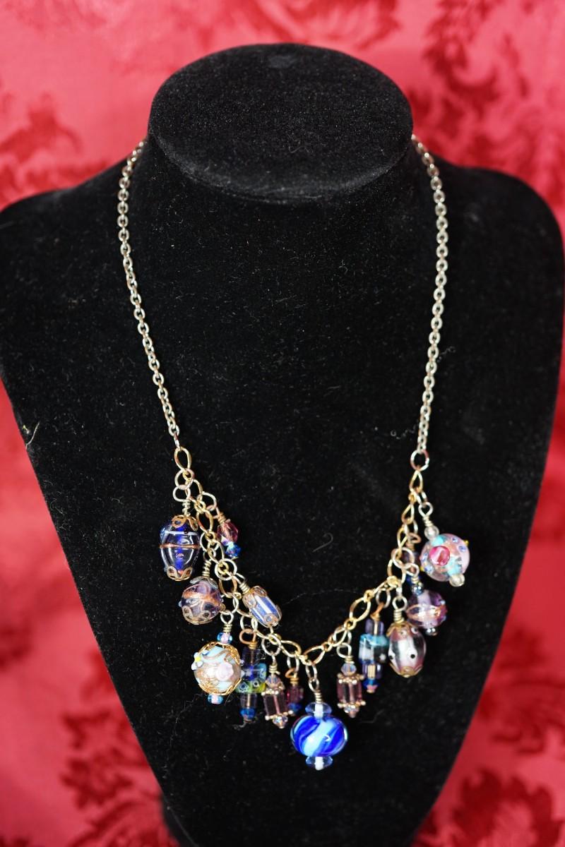 venetian glass /art glass beads made into a necklace. originally the necklace was a bracelet has you can see from the brass chain and then the silver chain was added to make it into a necklace.