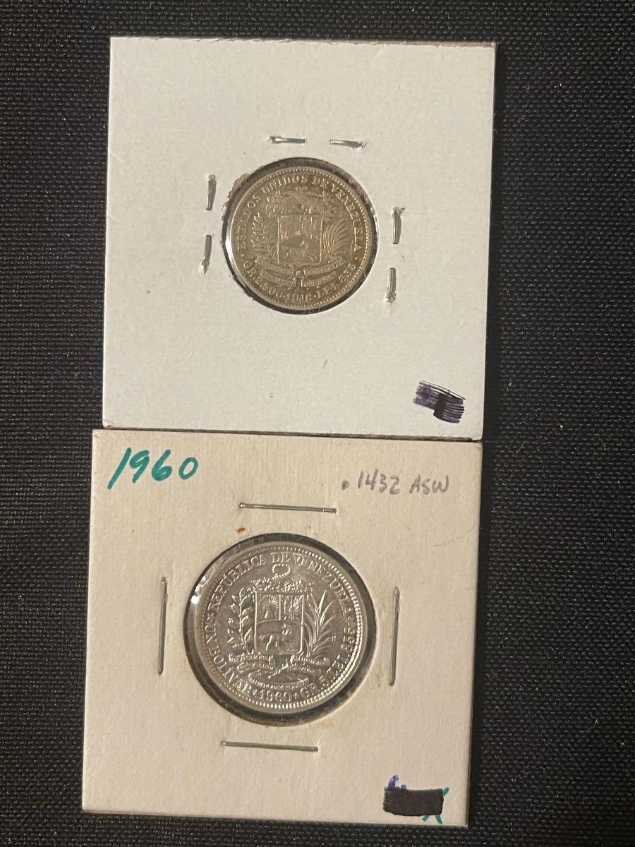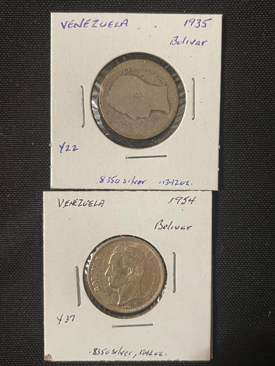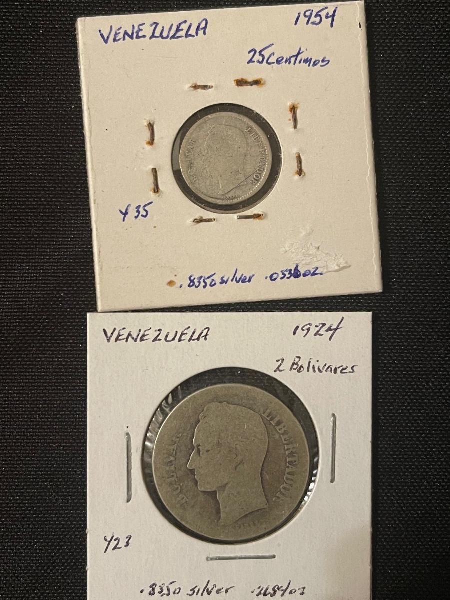 (6) Venezuela -1954 25 centimes, 1946 1/2 Bolivar, 1935 bbl, 1924 2 bol., 1960 bol., 1954 bol.