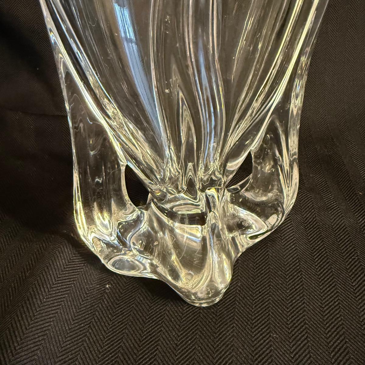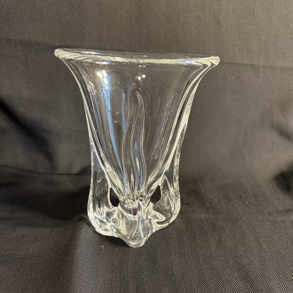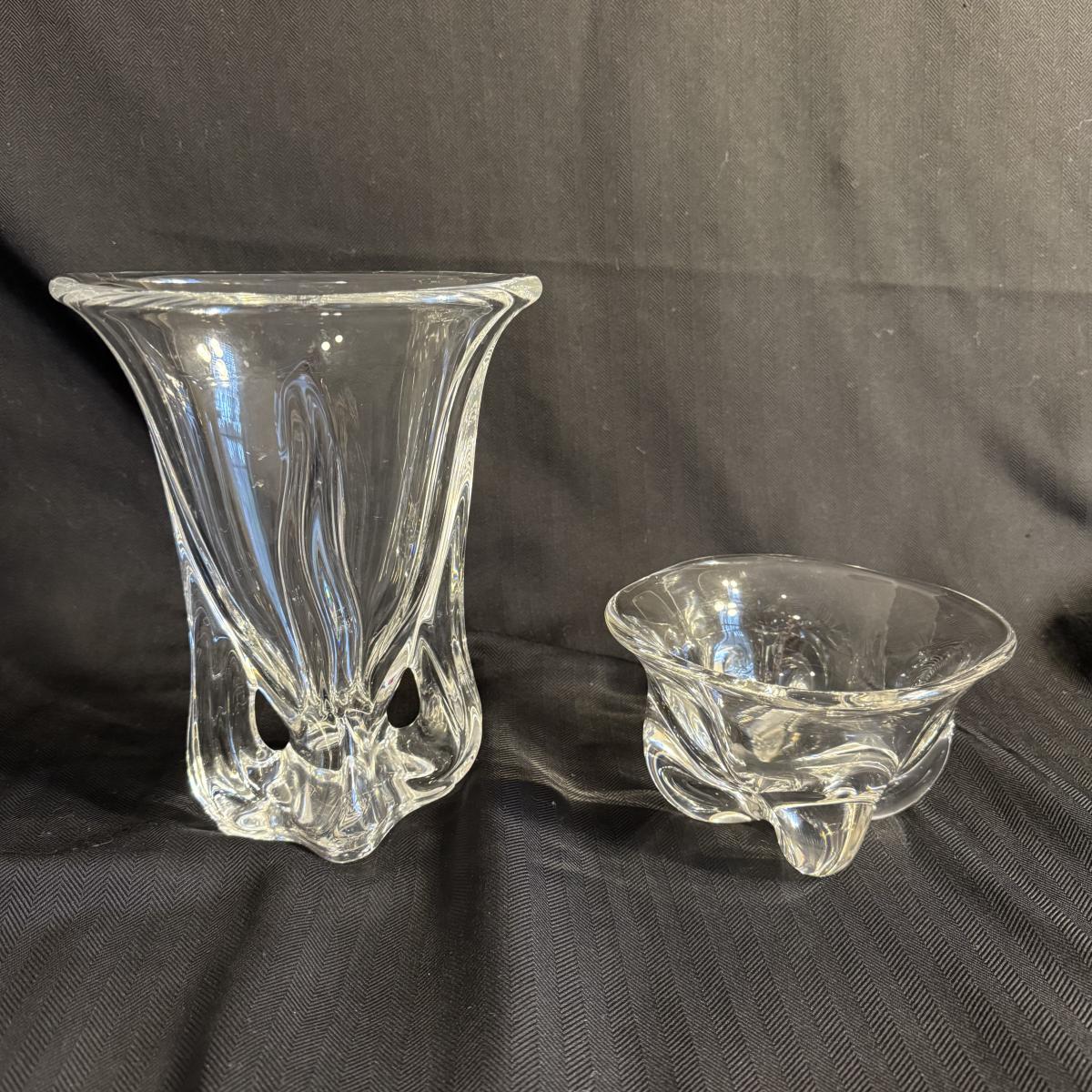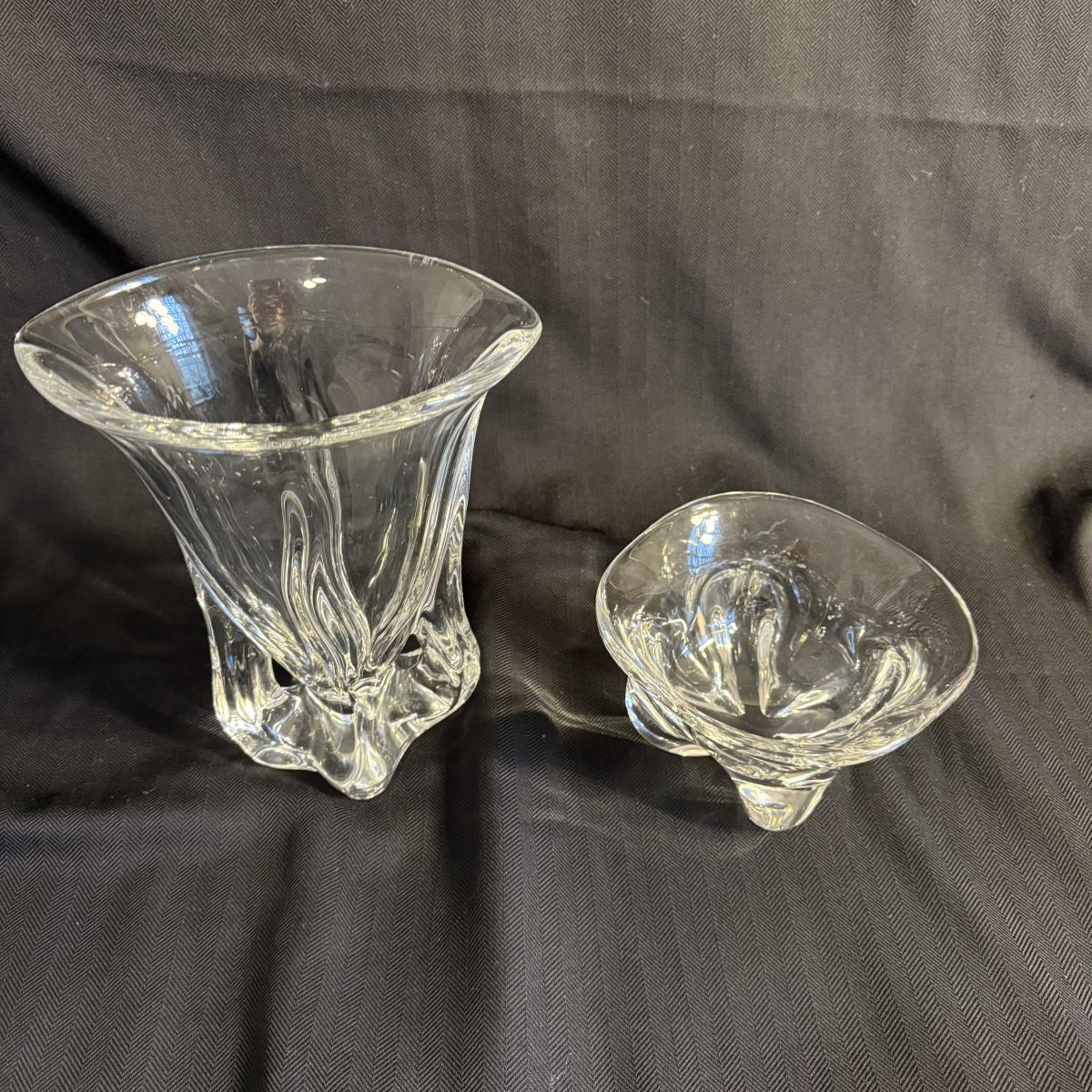 This lot contains two vases that appear to be crystal. The first is a spectacular Vanmes Le Chatel crystal art vase. This vase is a trophy style and measures 7” x 5” x 9”H. The next piece is another crystal shallow vase or dish. This item is not stamped but does have a similar design to the Vennes Le Chatel. This item measures 6” x 6” x 3.5”H. Shipping available. Shipping can be costly. We suggest contacting our preferred local shipping provider, Postage Express, with dimensions and getting an estimate before bidding: (828) 255-9250 or shipping@postageexpressnc.com.