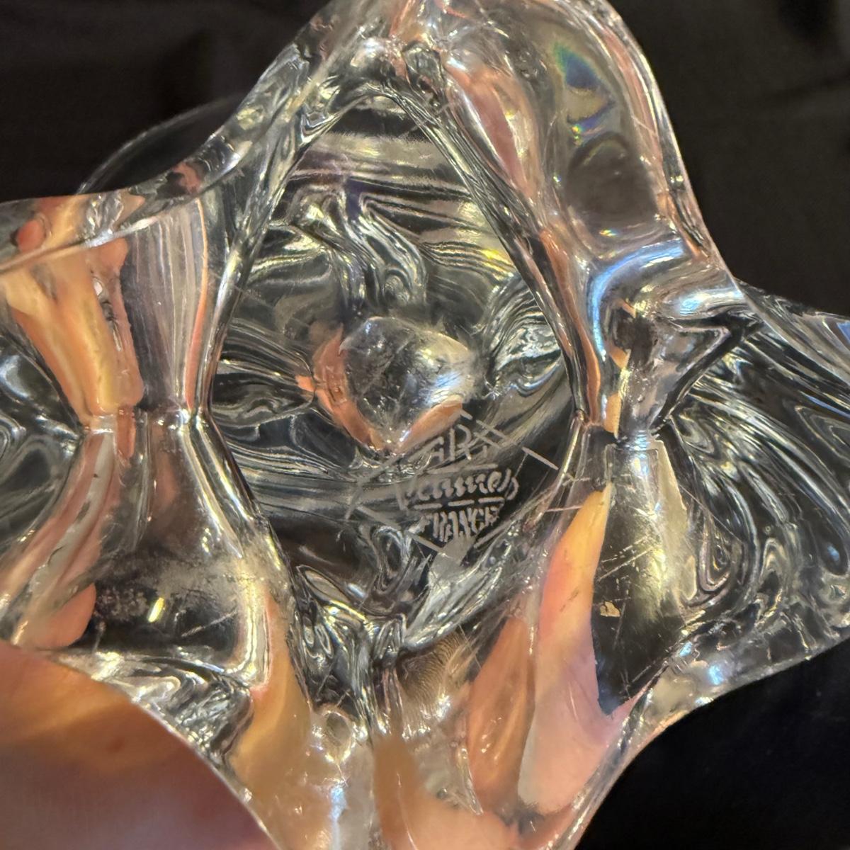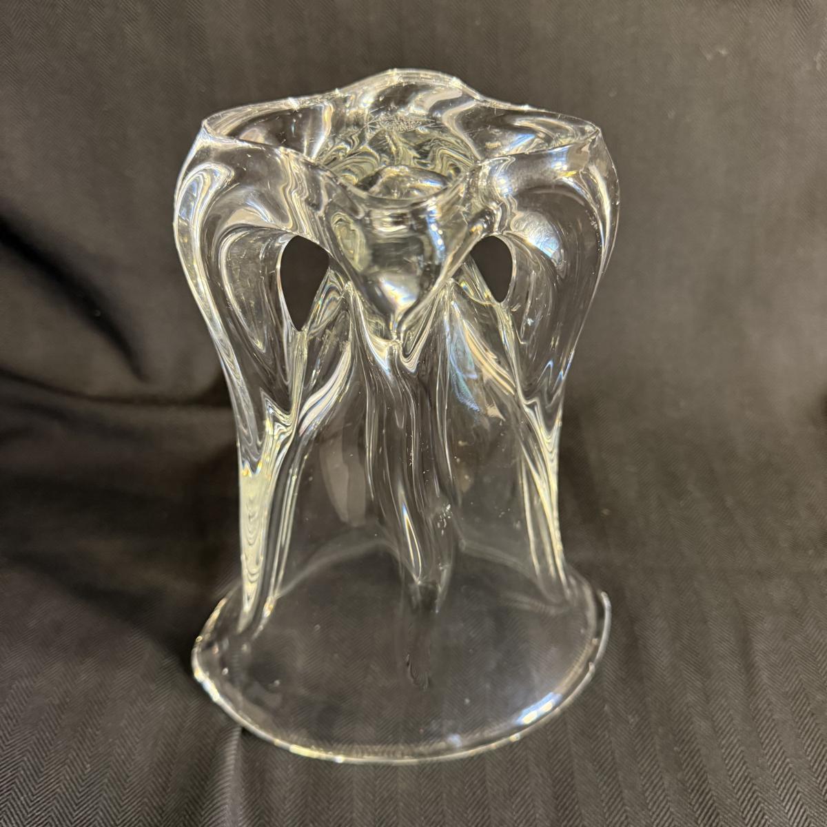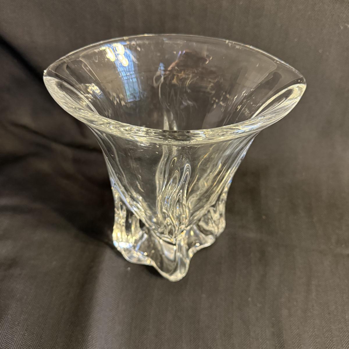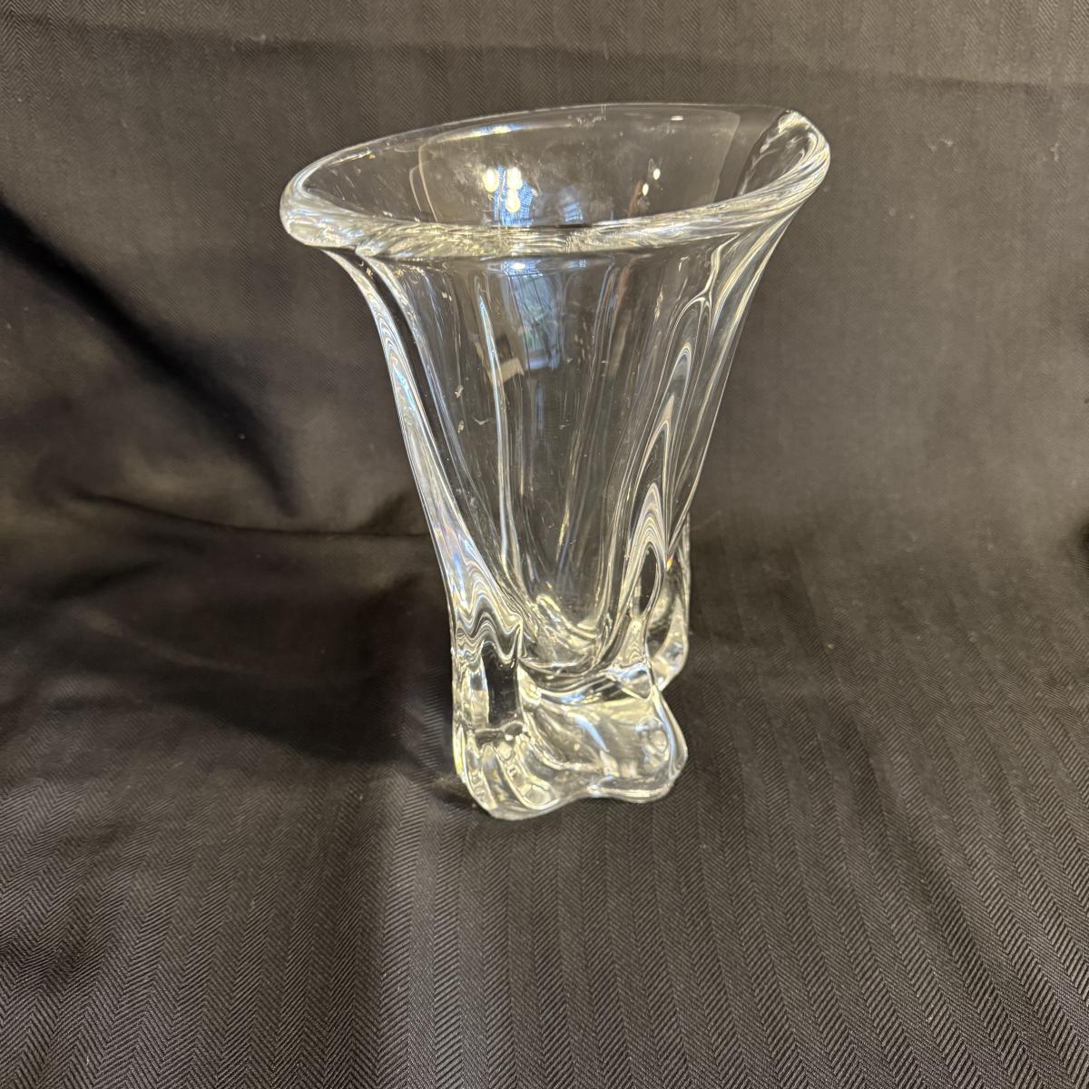 This lot contains two vases that appear to be crystal. The first is a spectacular Vanmes Le Chatel crystal art vase. This vase is a trophy style and measures 7” x 5” x 9”H. The next piece is another crystal shallow vase or dish. This item is not stamped but does have a similar design to the Vennes Le Chatel. This item measures 6” x 6” x 3.5”H. Shipping available. Shipping can be costly. We suggest contacting our preferred local shipping provider, Postage Express, with dimensions and getting an estimate before bidding: (828) 255-9250 or shipping@postageexpressnc.com.