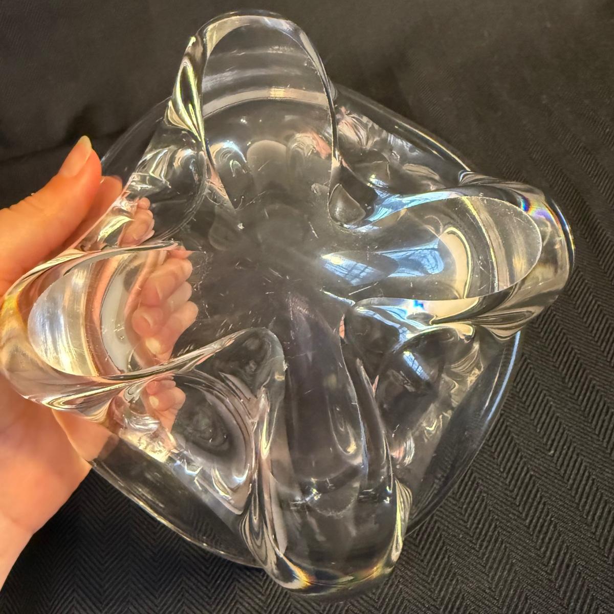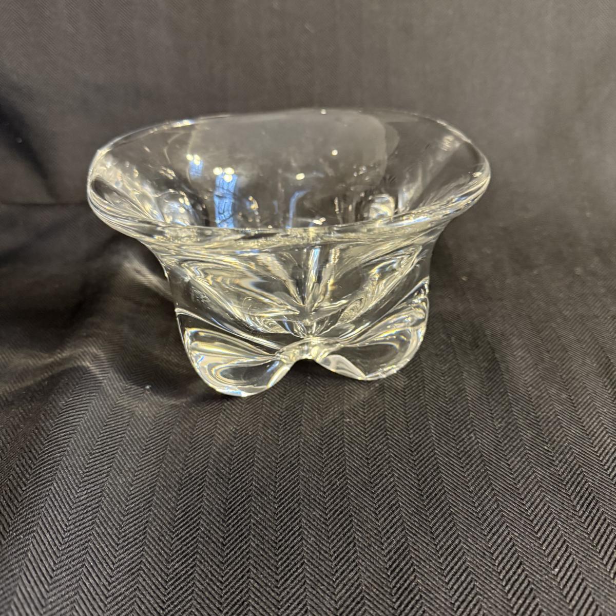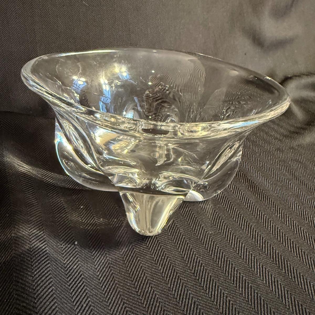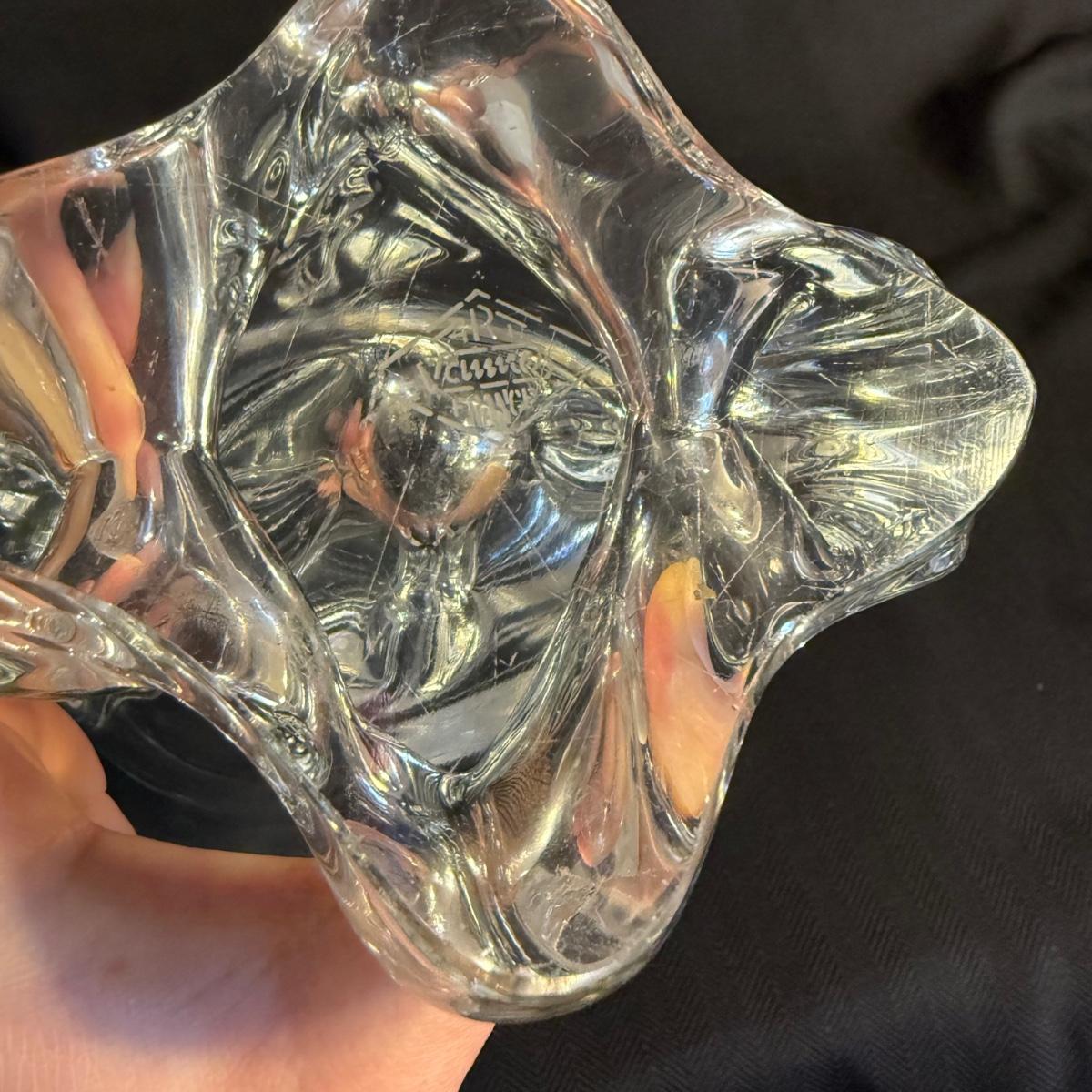 This lot contains two vases that appear to be crystal. The first is a spectacular Vanmes Le Chatel crystal art vase. This vase is a trophy style and measures 7” x 5” x 9”H. The next piece is another crystal shallow vase or dish. This item is not stamped but does have a similar design to the Vennes Le Chatel. This item measures 6” x 6” x 3.5”H. Shipping available. Shipping can be costly. We suggest contacting our preferred local shipping provider, Postage Express, with dimensions and getting an estimate before bidding: (828) 255-9250 or shipping@postageexpressnc.com.