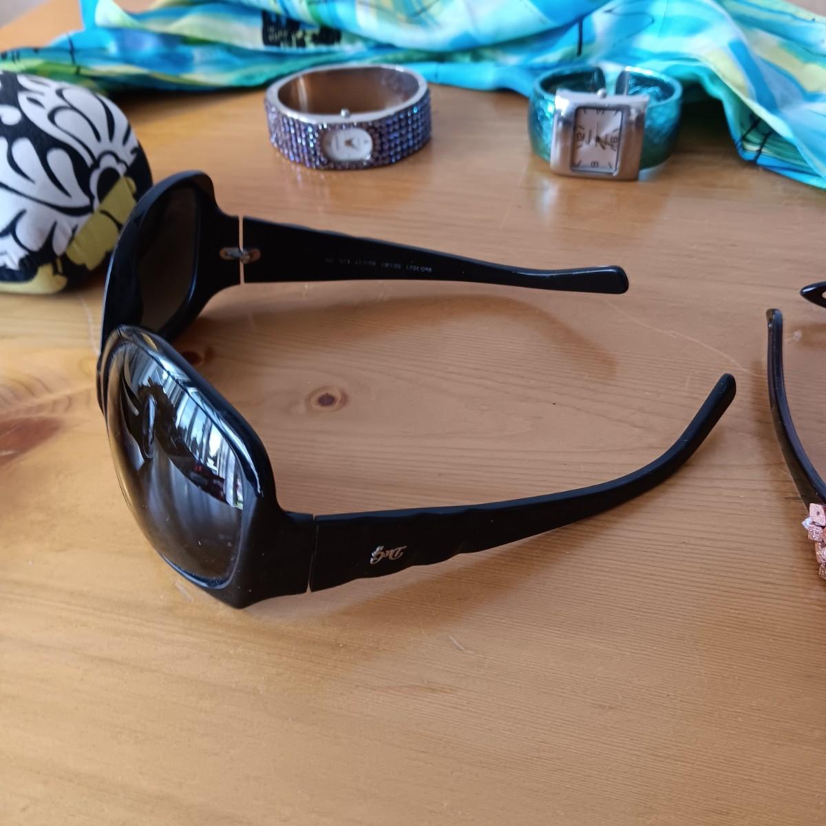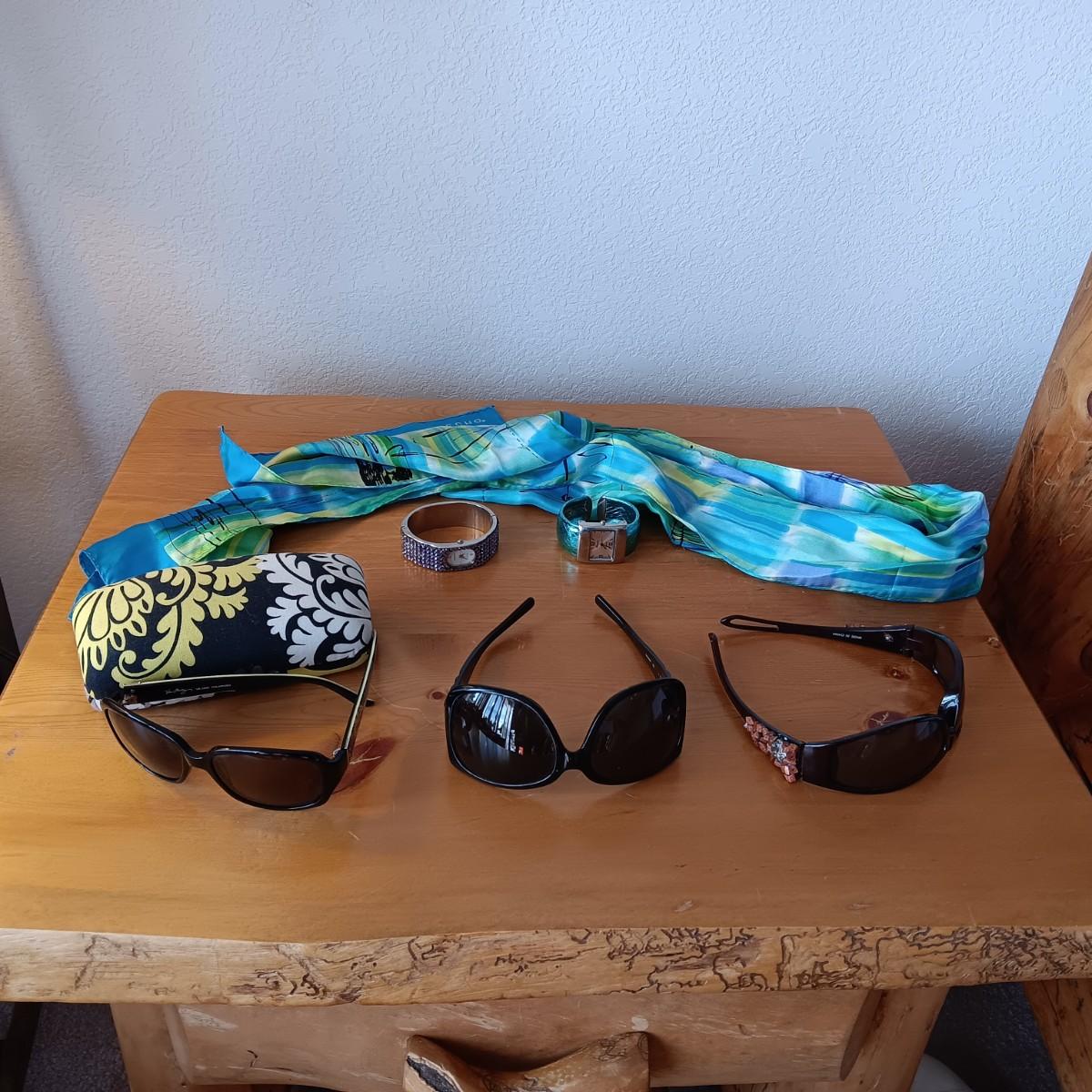 VERA BRADLEY AND 2 OTHER PAIRS OF LADIES SUNGLASSES, 2 WATCHES AND A SCARF