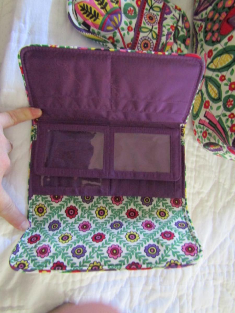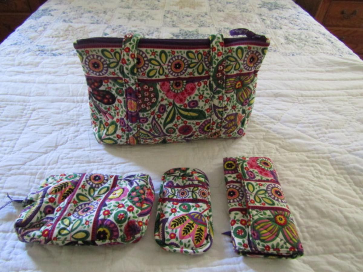 Vera Bradley Bag with Additional Accessories- Cosmetic Case, Eyeglasses Case, and Wallet.
