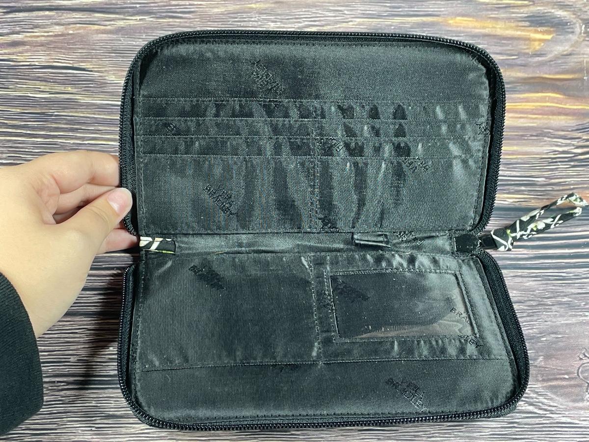 This wallet is in great condition. All of the zippers work and it has a lot of space for storage. There is some lint on the wallet due to years of ownership. It is approximately 7.5” wide.